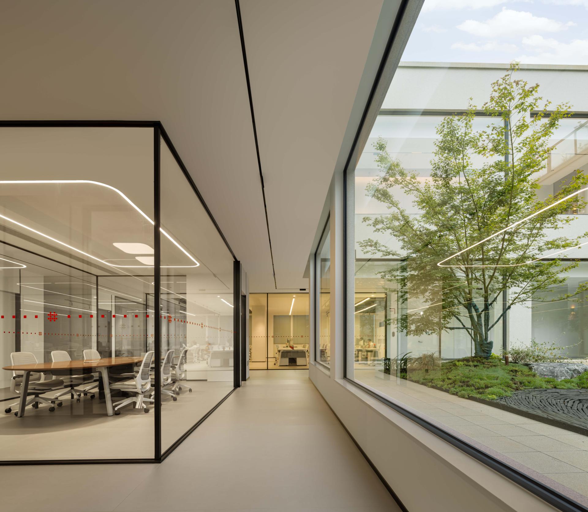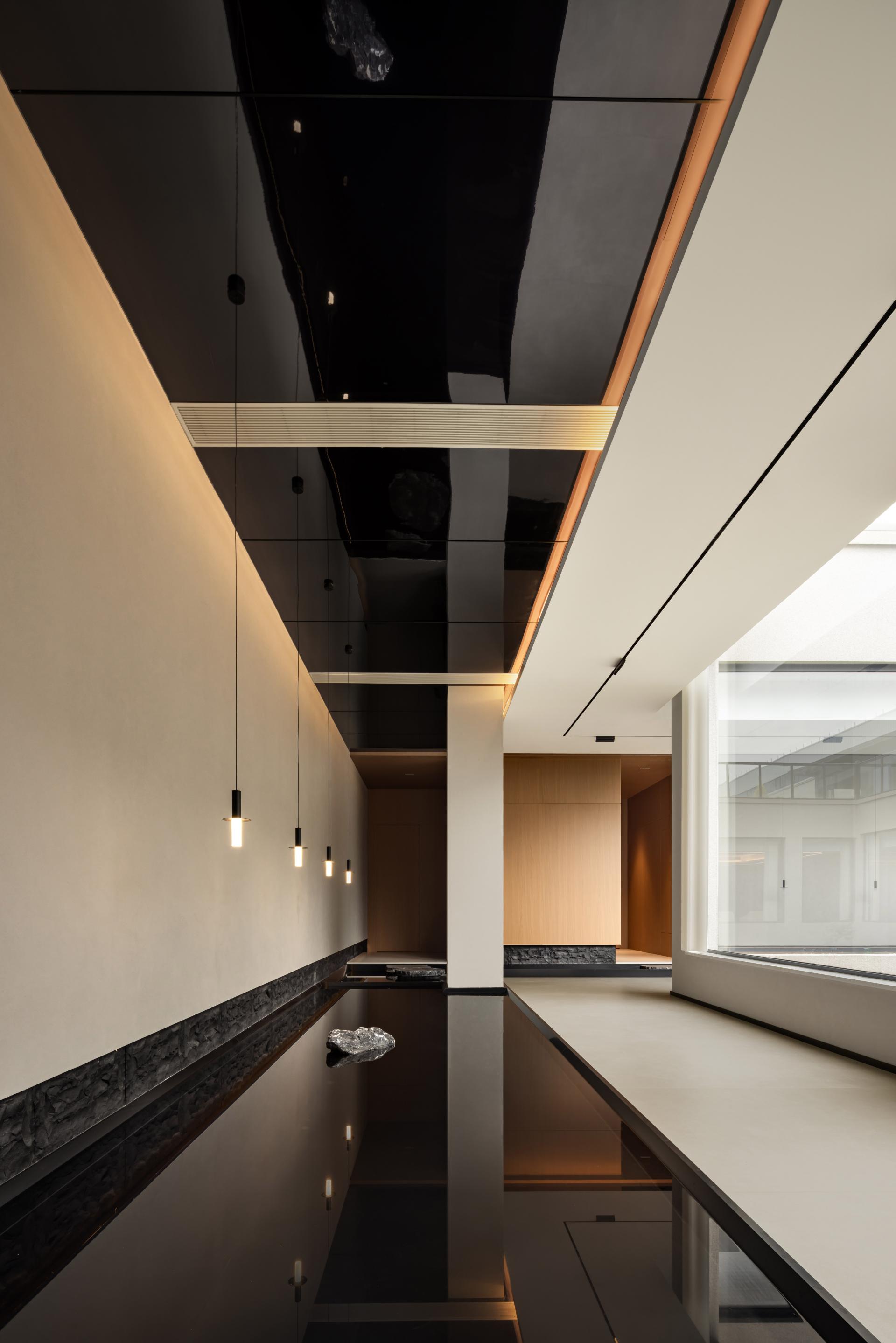 The third and fourth floors focus on office and R&D spaces, seamlessly integrating nature and design. The third floor is wrapped around a beautiful tiled garden, with meandering corridors that blur the line between indoor and outdoor spaces, offering employees serene, green spaces for rest and contemplation. The fourth floor continues this theme with a corridor and chairman’s office that incorporates water and stone elements, reinforcing ShiJing’s commitment to craftsmanship and continuous innovation.