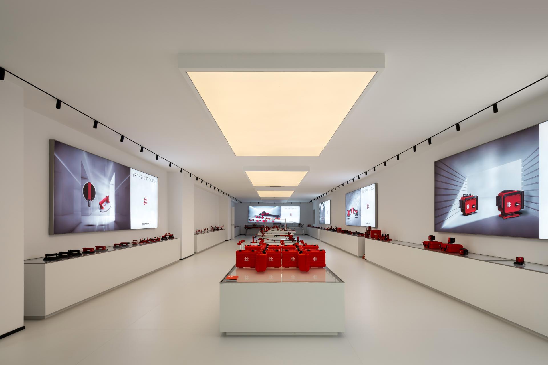 Brand elements are integrated throughout the design, from the logo subtly embedded in the ceiling and flooring to the signature color palette of crimson, gray, and black. These elements emphasize the company’s commitment to excellence, from its attention to detail to its pursuit of both technical precision and aesthetic sophistication.