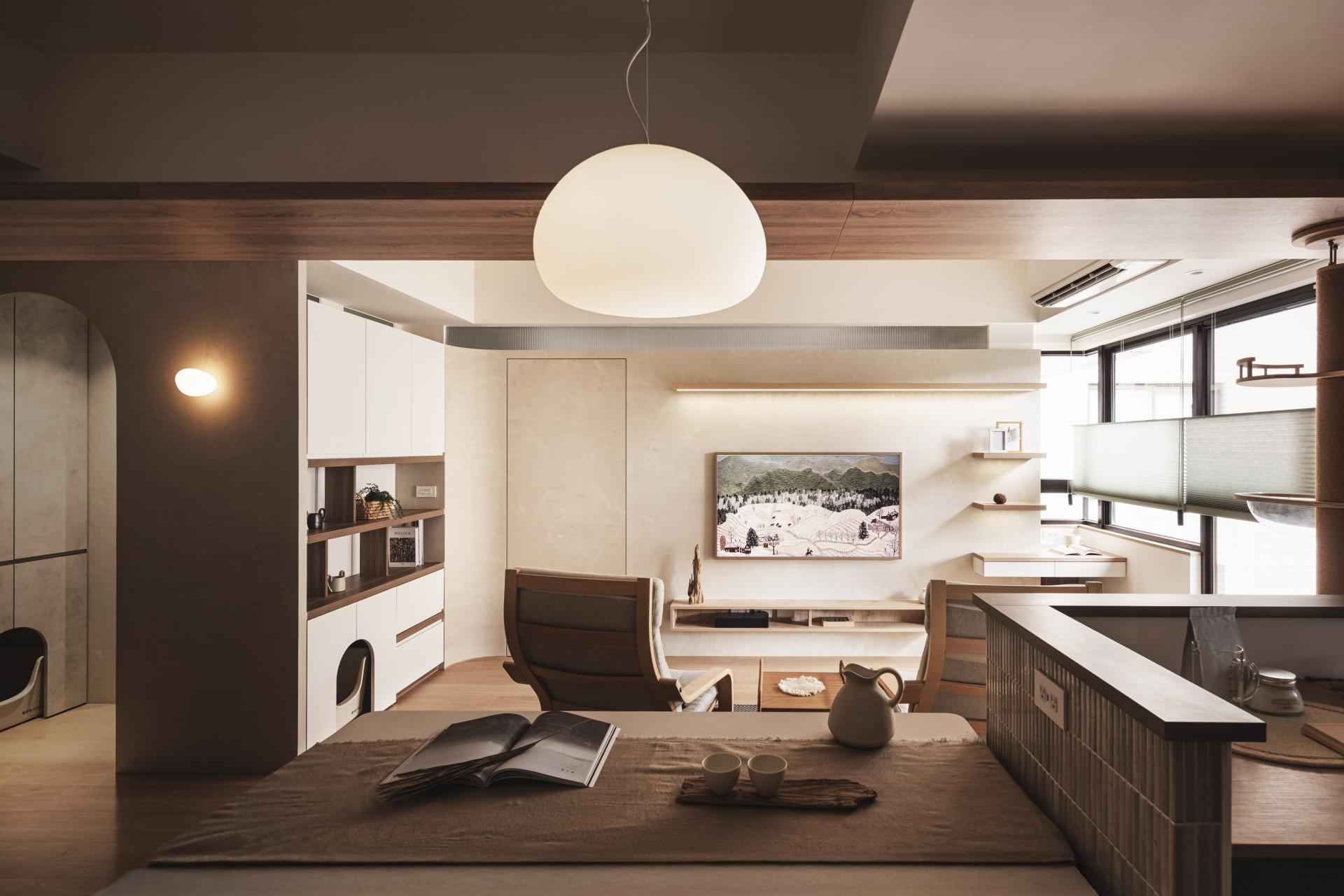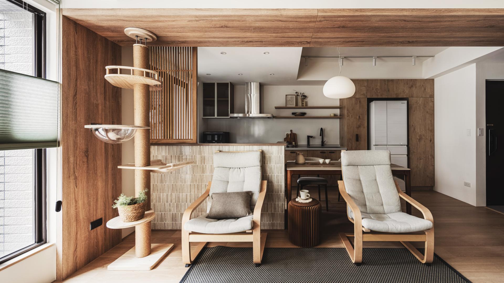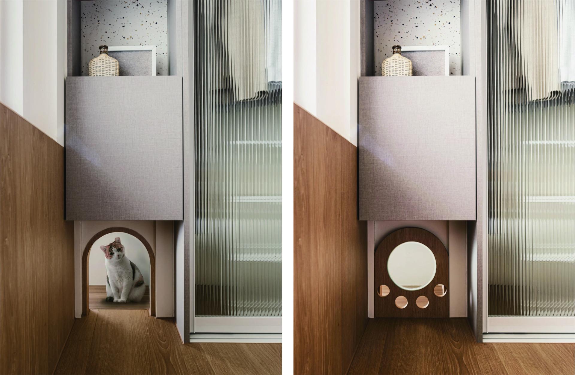 Pet-friendly design was also a key consideration. A dedicated cat passage was incorporated between the living room and the master bedroom, eliminating the need for unsightly pet doors. In addition, a custom-built cat scratching post with a platform was added to allow the cats to interact with their environment and enjoy the view.