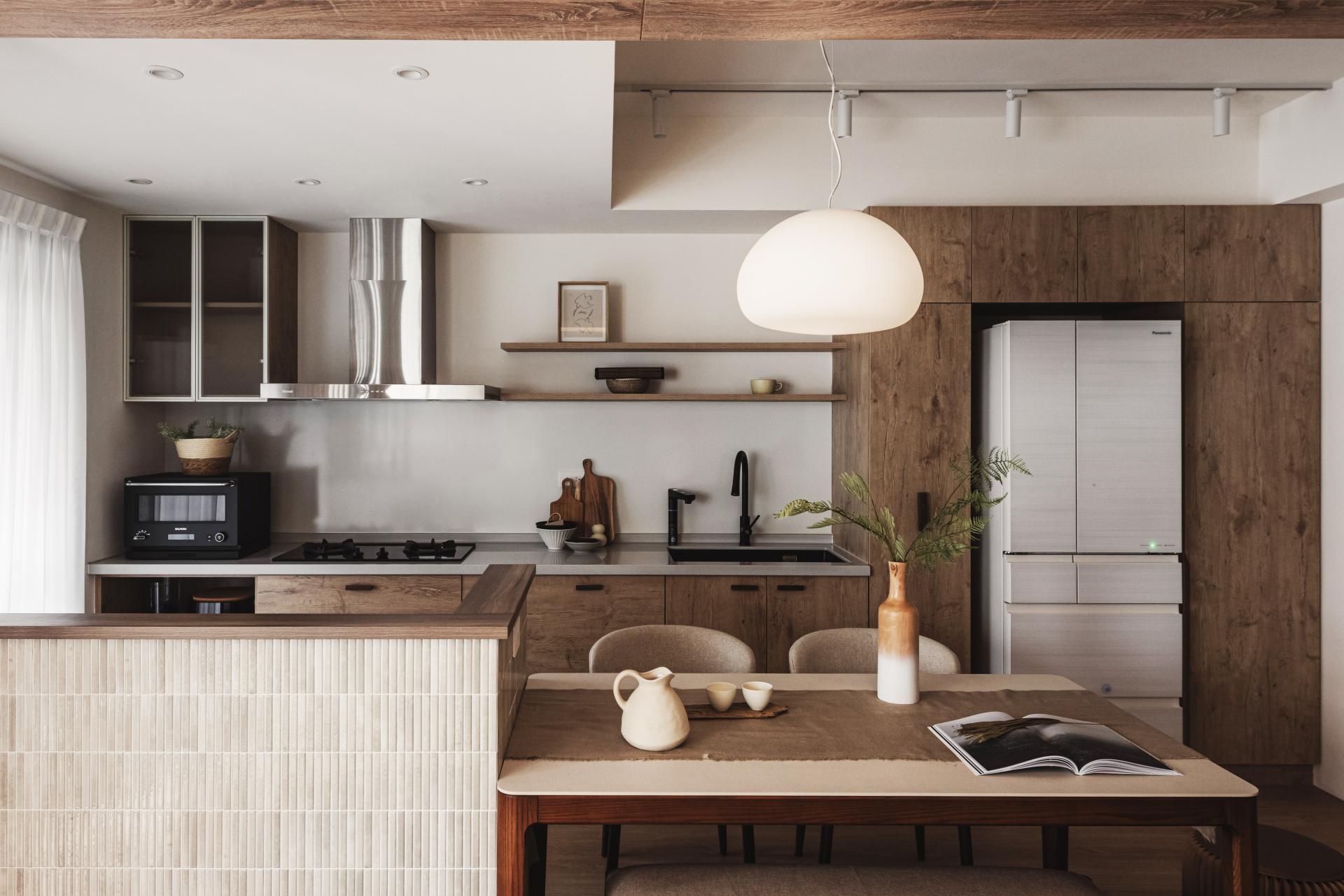 One of the standout features of the design is the clever reconfiguration of space. The traditional two-bedroom layout was transformed into a more spacious one-bedroom design with a dedicated dining area and kitchen island. This allowed for an optimal flow of natural light and more efficient use of space. The kitchen, for example, removes upper cabinets in favor of open shelves, offering both a more open feel and better lighting. Large tiles and smooth surfaces make the kitchen easier to maintain and more functional.