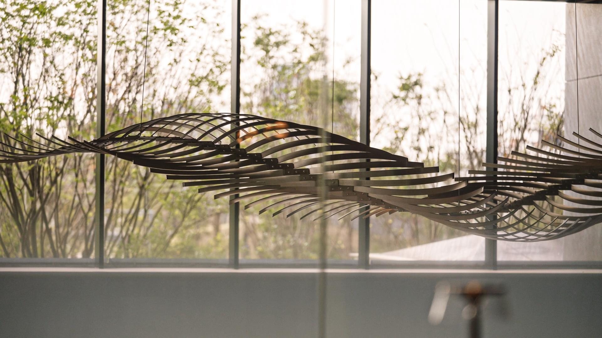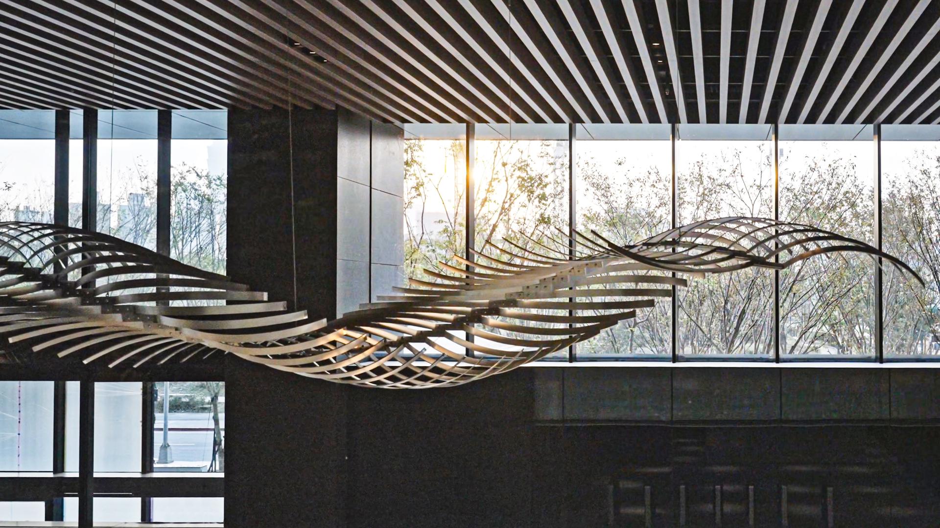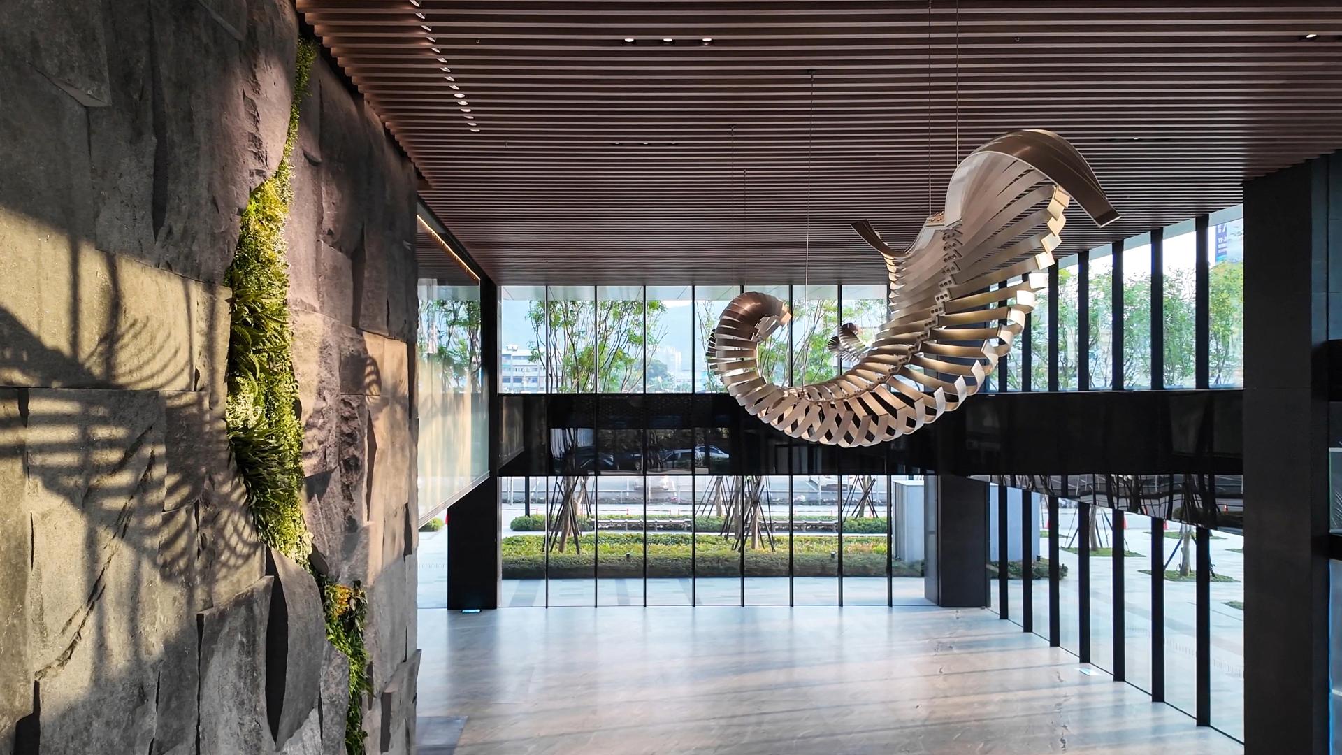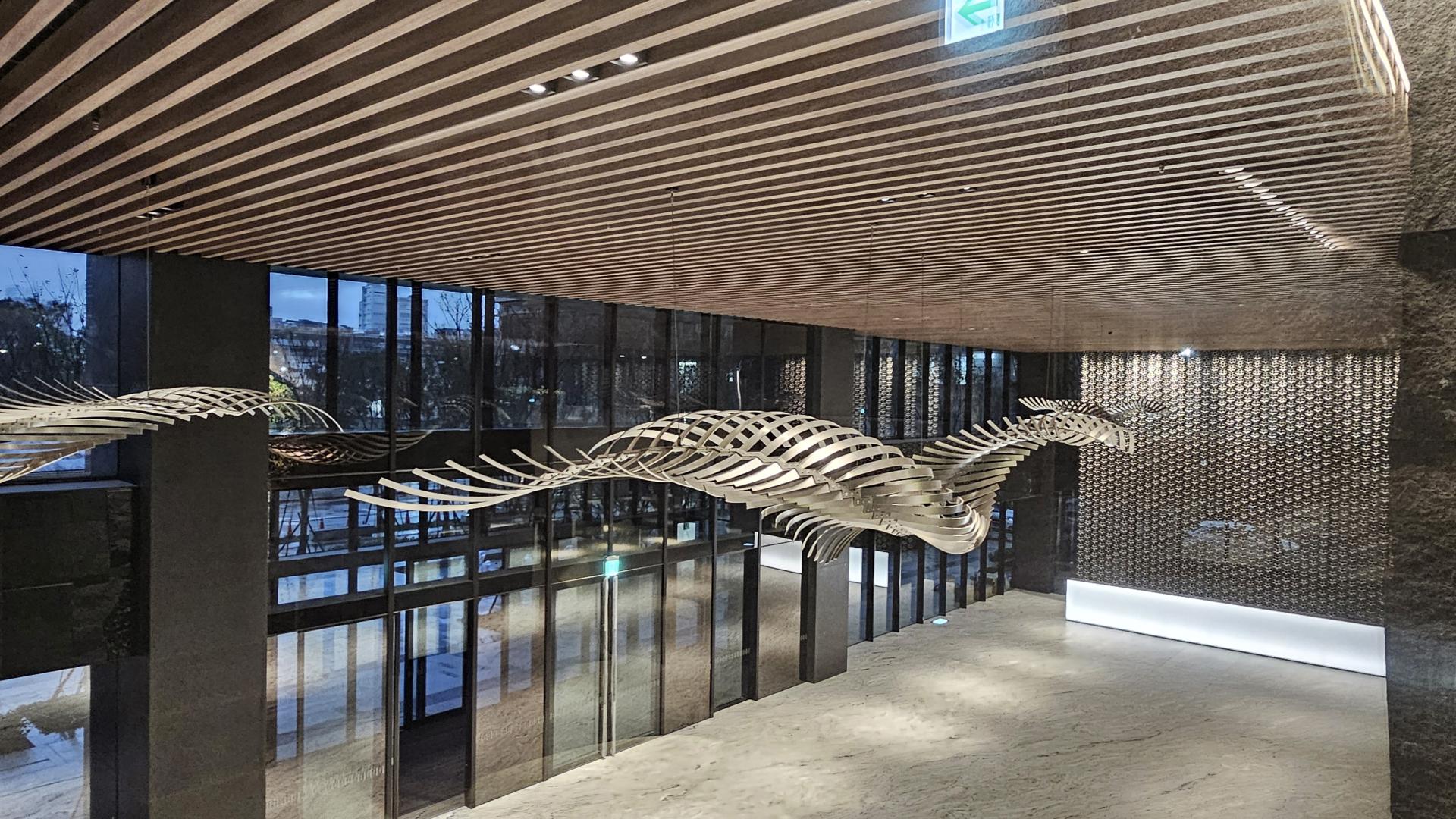 The artwork exhibits a multi-layered structure and striking visual tension, reminiscent of a dragon soaring, a phoenix gliding across the sky, or an organic form blooming with life. Whether viewed from the ground or through the second-floor windows, it exudes an enchanting sense of suspension amid the clouds. Illuminated by the gradient hues of the transparent glass interface, the sculpture gracefully unfolds like the rhythm of life itself, offering viewers unlimited interpretative possibilities and a profound visual experience.