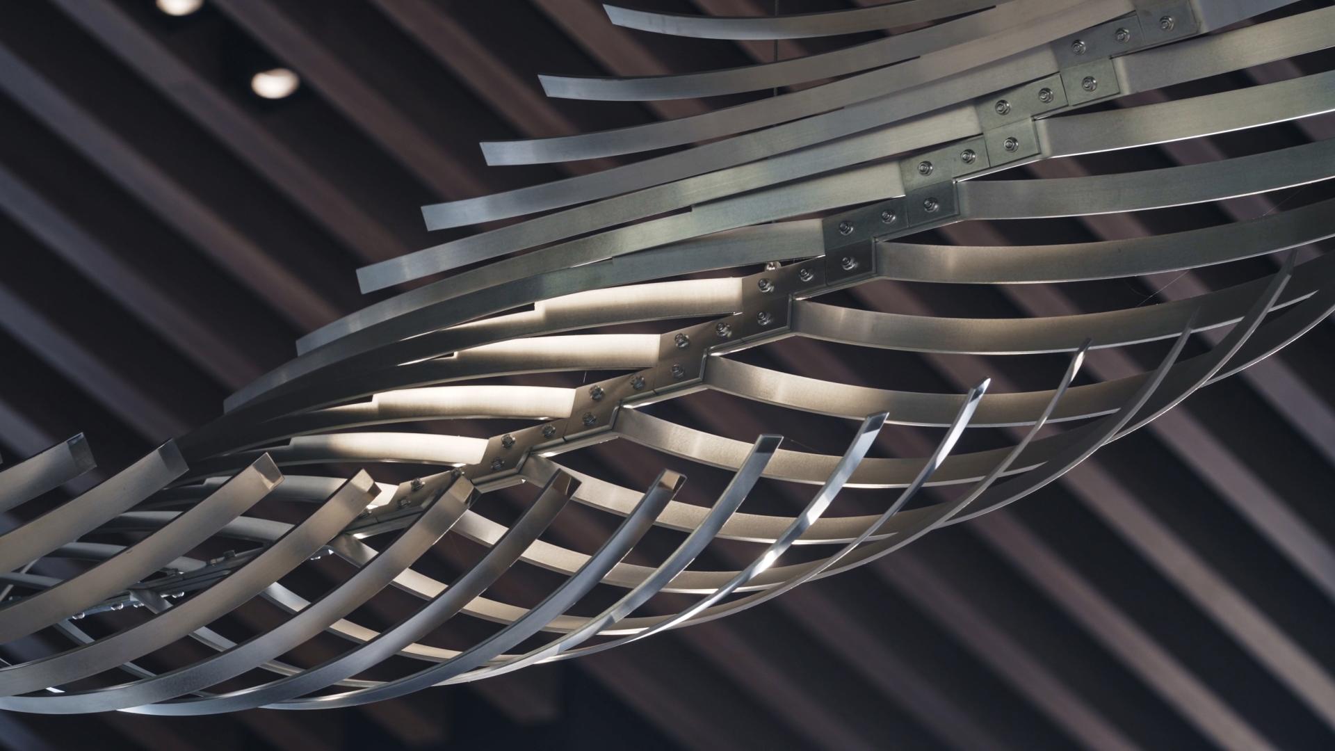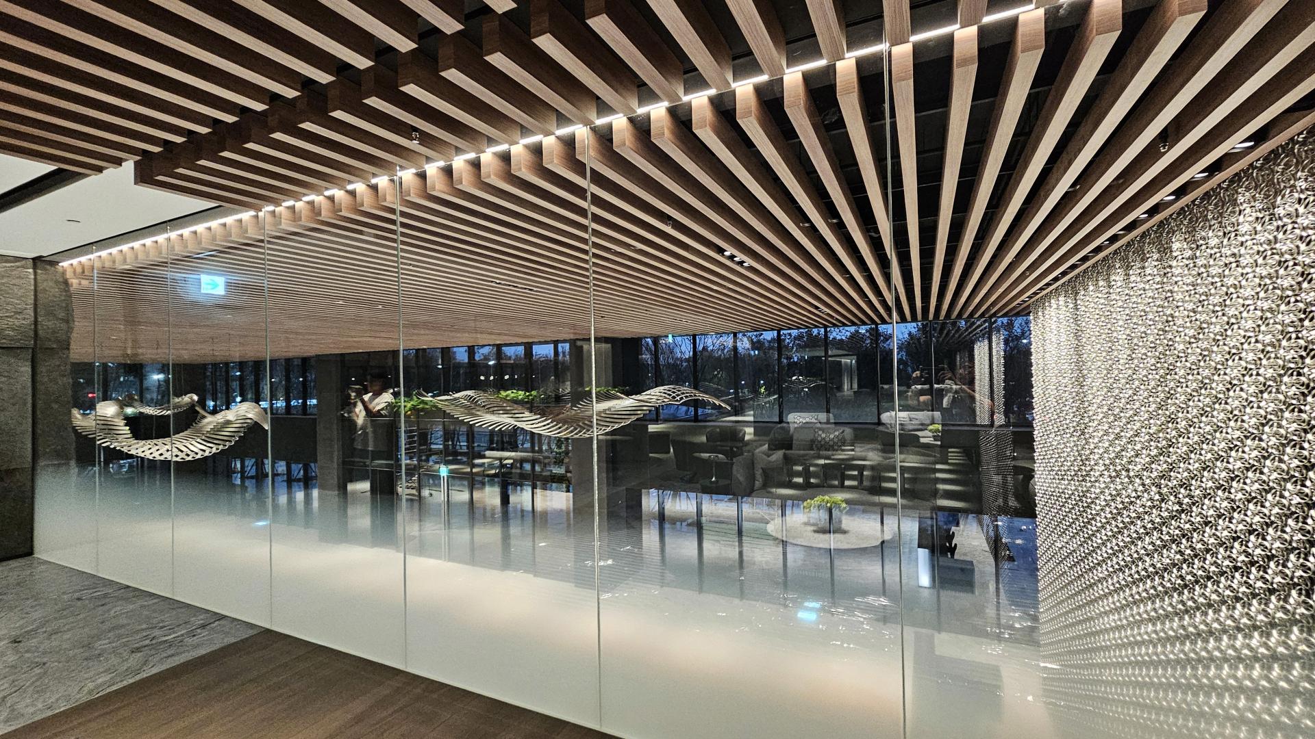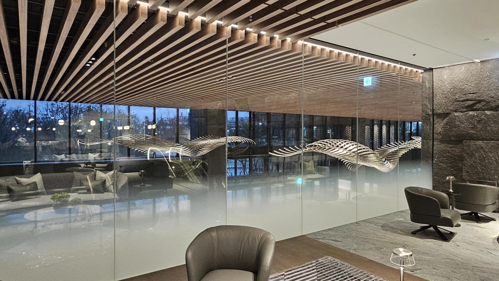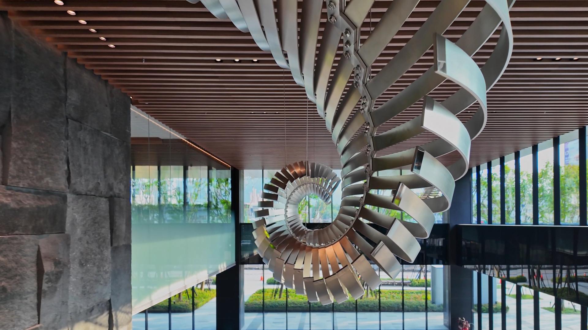 The artwork exhibits a multi-layered structure and striking visual tension, reminiscent of a dragon soaring, a phoenix gliding across the sky, or an organic form blooming with life. Whether viewed from the ground or through the second-floor windows, it exudes an enchanting sense of suspension amid the clouds. Illuminated by the gradient hues of the transparent glass interface, the sculpture gracefully unfolds like the rhythm of life itself, offering viewers unlimited interpretative possibilities and a profound visual experience.