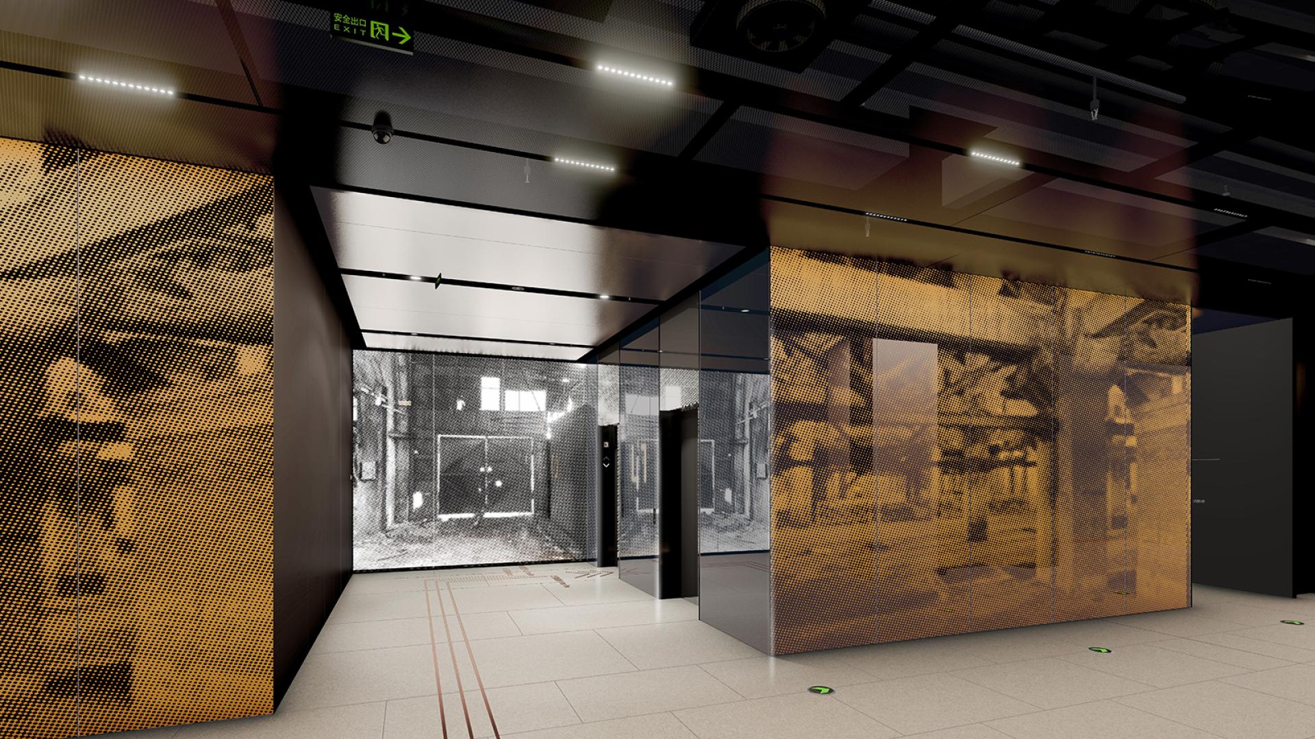 Strategies using absence, reflection and juxtaposition are adopted to reconcile the polarity of preservation and renovation in a sensitive yet stimulating way. The atmosphere of the original factory, originally experienced only by long-gone steelworkers, is recreated for a modern public audience by scaling up archive photographs to life size and placing them in their original locations. These halftone images are applied to fritted coloured glass, legible from distance but indistinct close-up, mirroring the imperfections of memory.