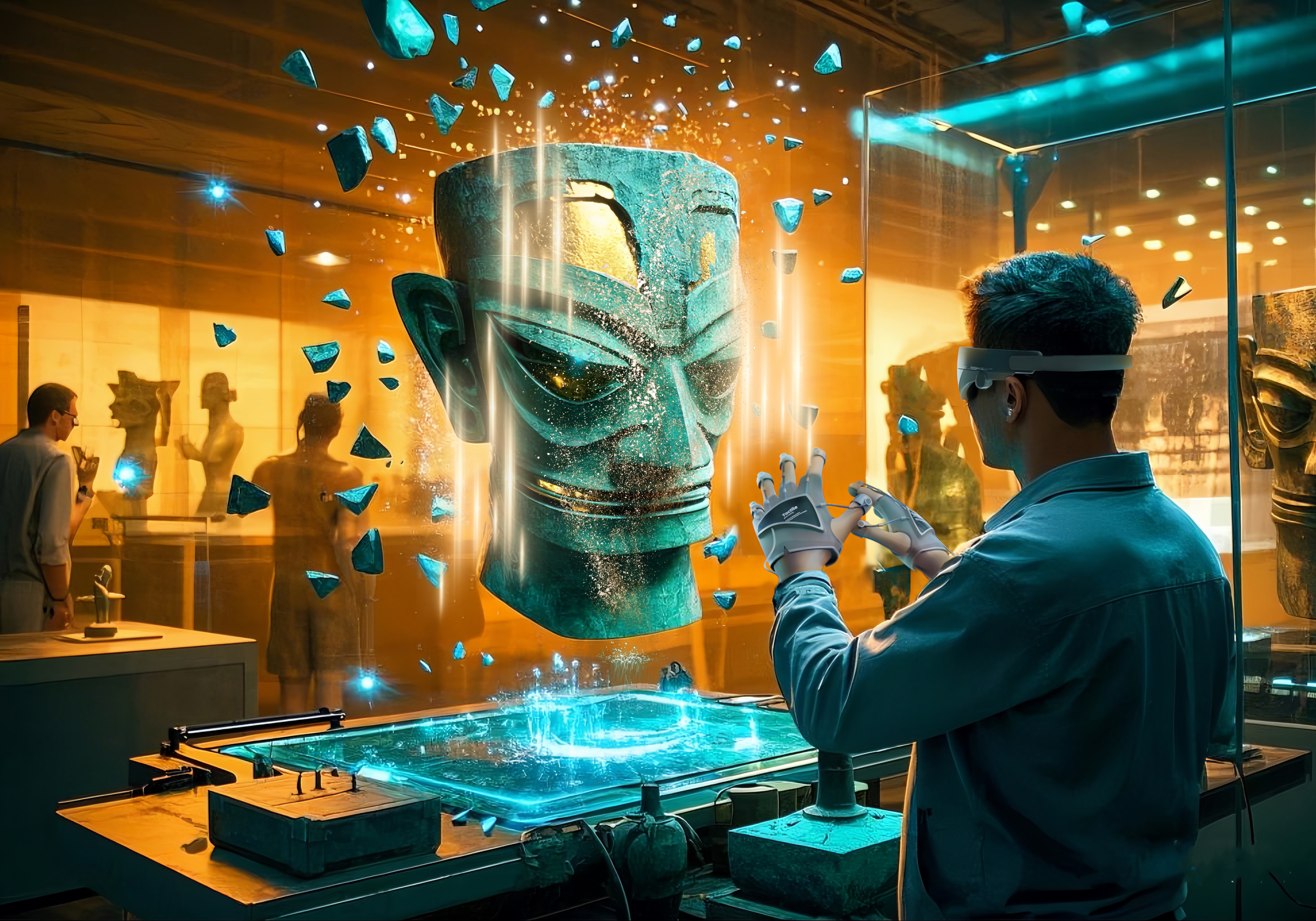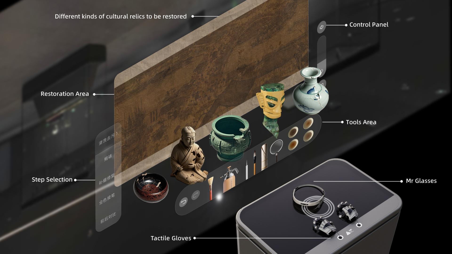 This project combines Mixed Reality technology with cultural relic restoration experiences, using haptic gloves and MR glasses to immerse visitors in a virtual environment where they can feel the textures and temperatures of relics. Users experience a sense of traveling through time and space, touching ancient craftsmanship, enhancing interaction and participation. By blending virtual and real scenes through multi-sensory interactions, the project transforms users from mere observers into participants in the restoration process, igniting interest in cultural heritage preservation and fostering cultural identification.
