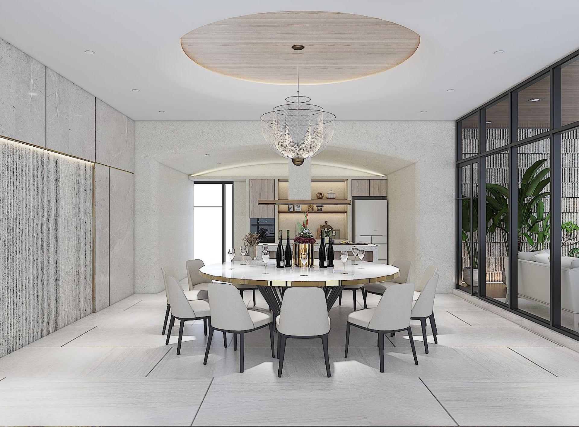 The Private Dining & Event Space offers a premium setting for gatherings, centered around a grand marble round table that symbolizes unity and elegance. The use of refined metal chandeliers and soft, flowing curves creates an ambiance of luxury and warmth, ideal for family celebrations and social events.