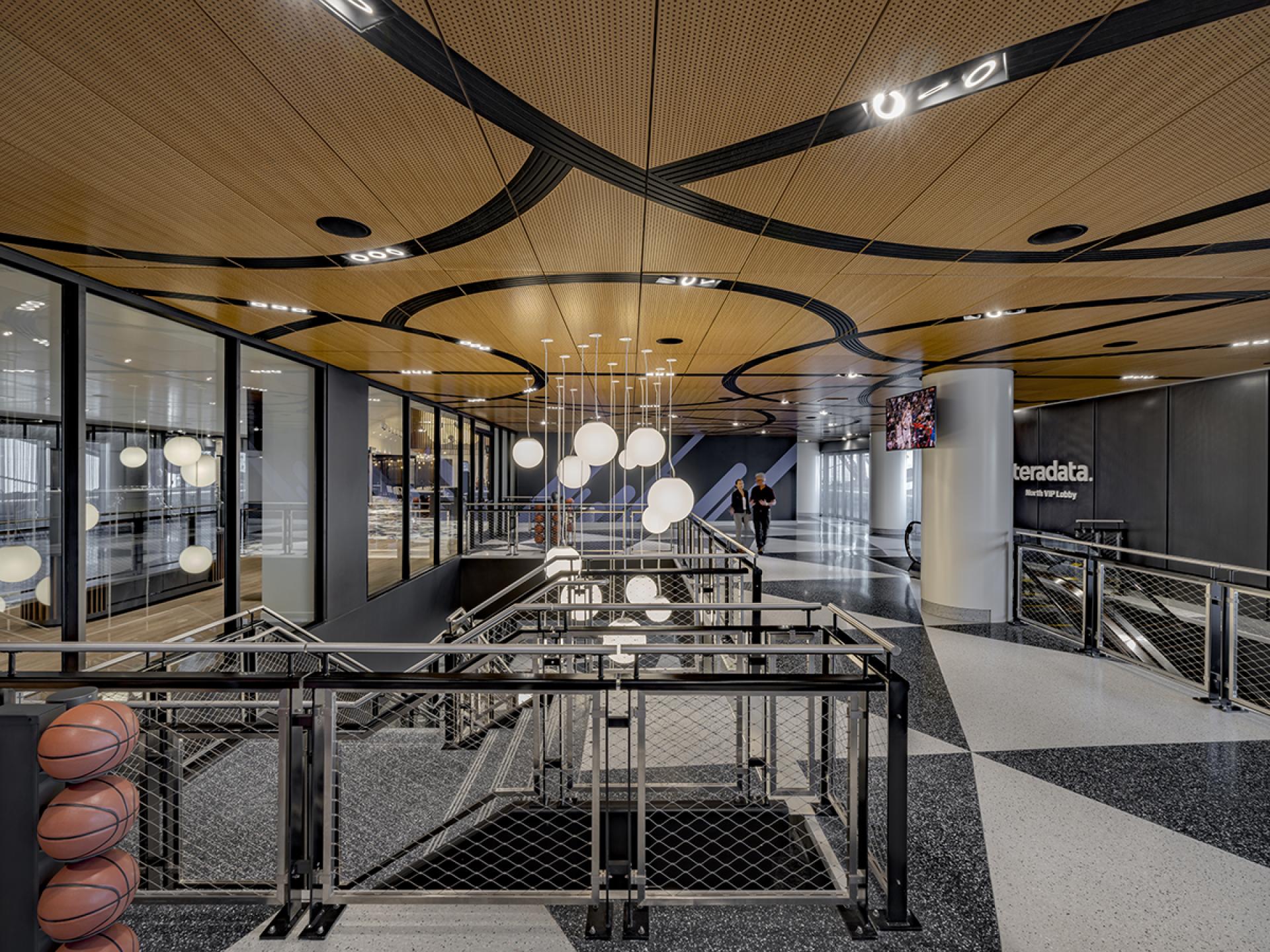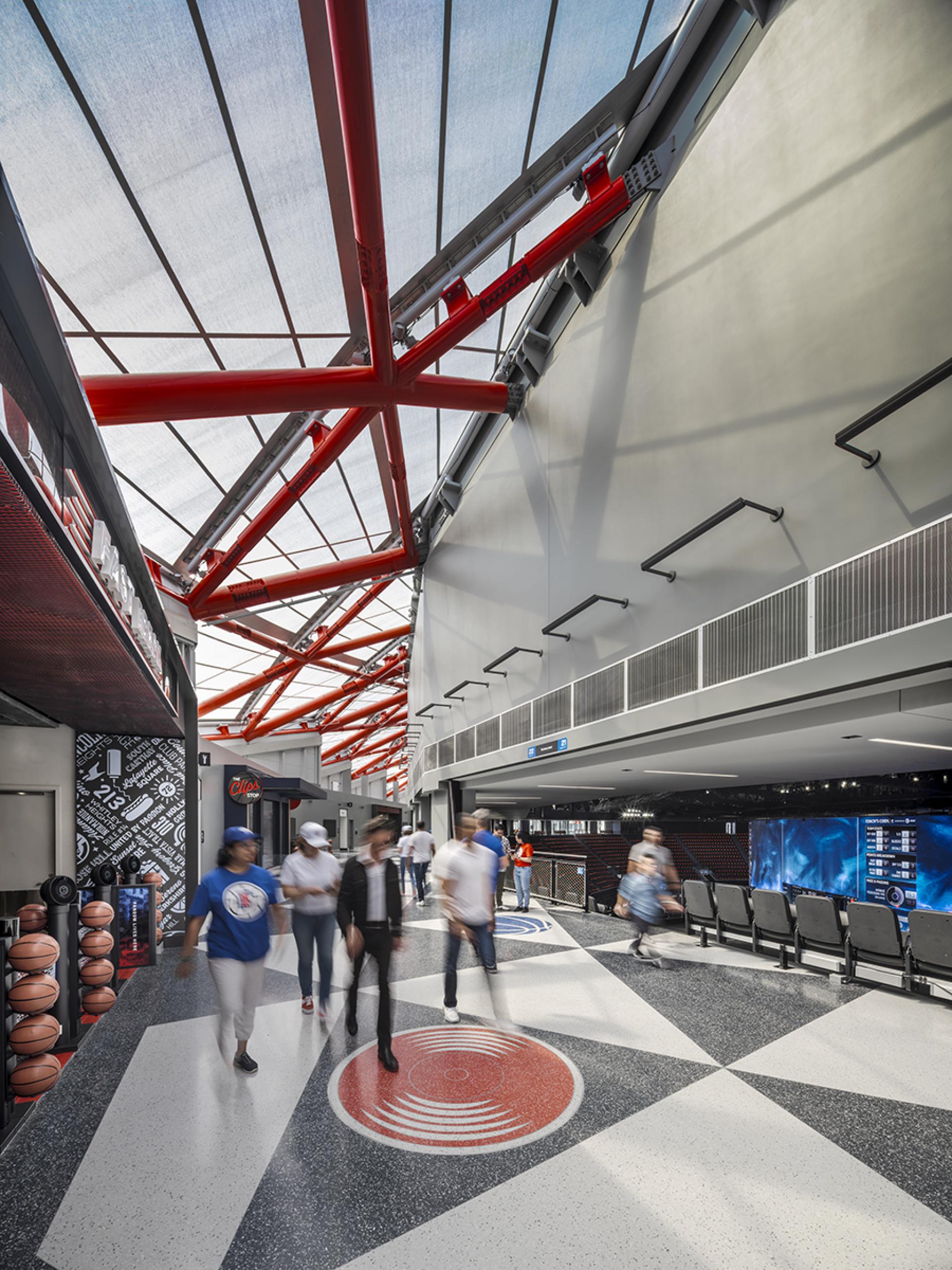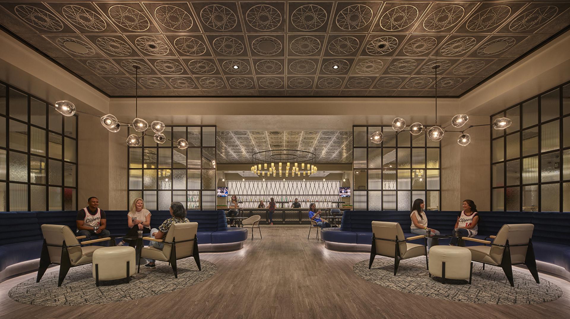 Significant importance was placed on how the design could reflect the local context more insightfully, ensuring the arena feels like an extension of the Inglewood community. The design avoids usual LA Hollywood clichés and celebrates diversity by recognizing the urban street culture of modern LA, from skateparks in Venice to the urban vernacular of the downtown arts scene. The idea of basketball was paramount and made its way into all aspects of the space, from custom ceiling and lighting elements to the texture of textiles and wall surfaces that emulate basketball leather.