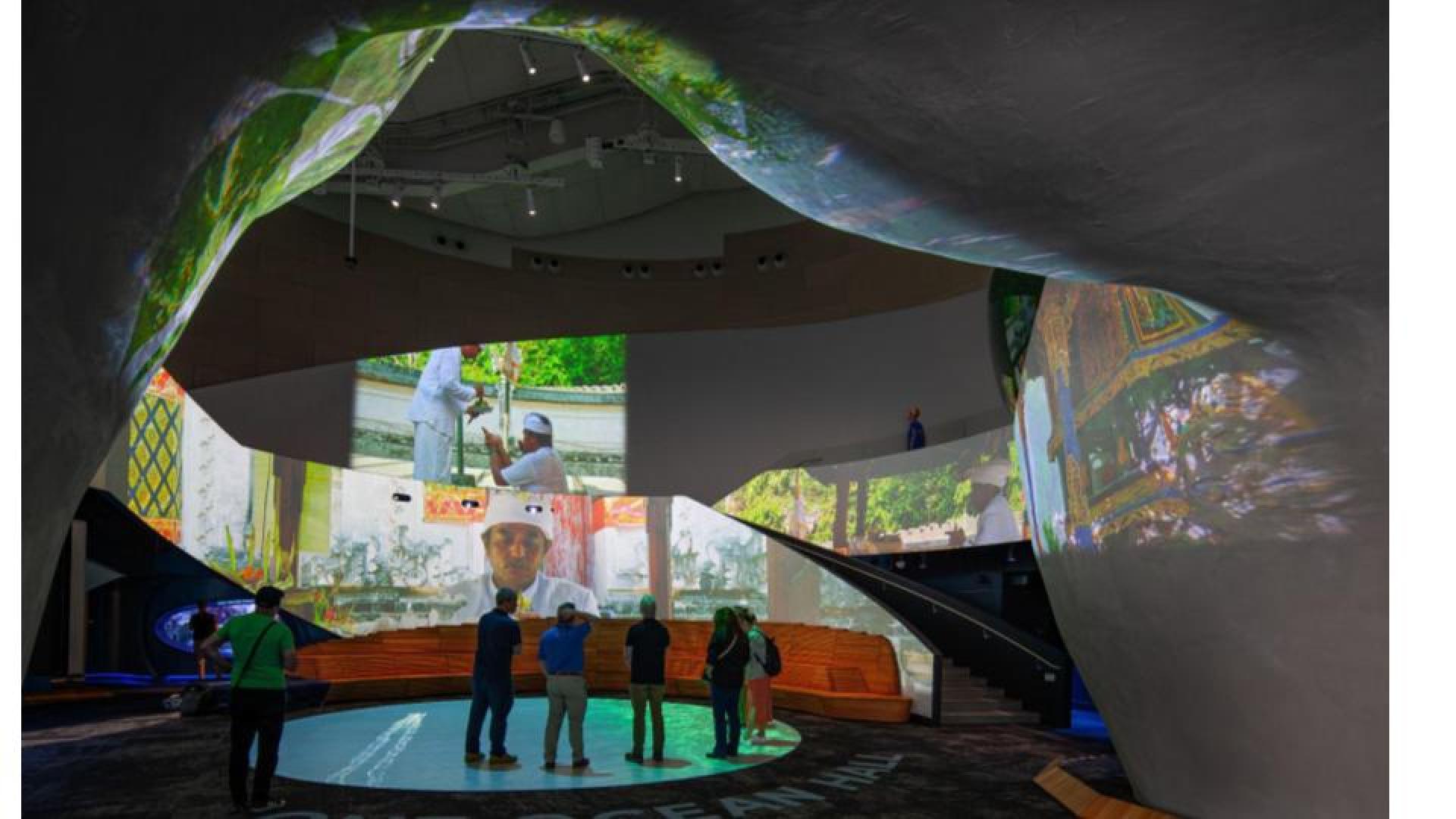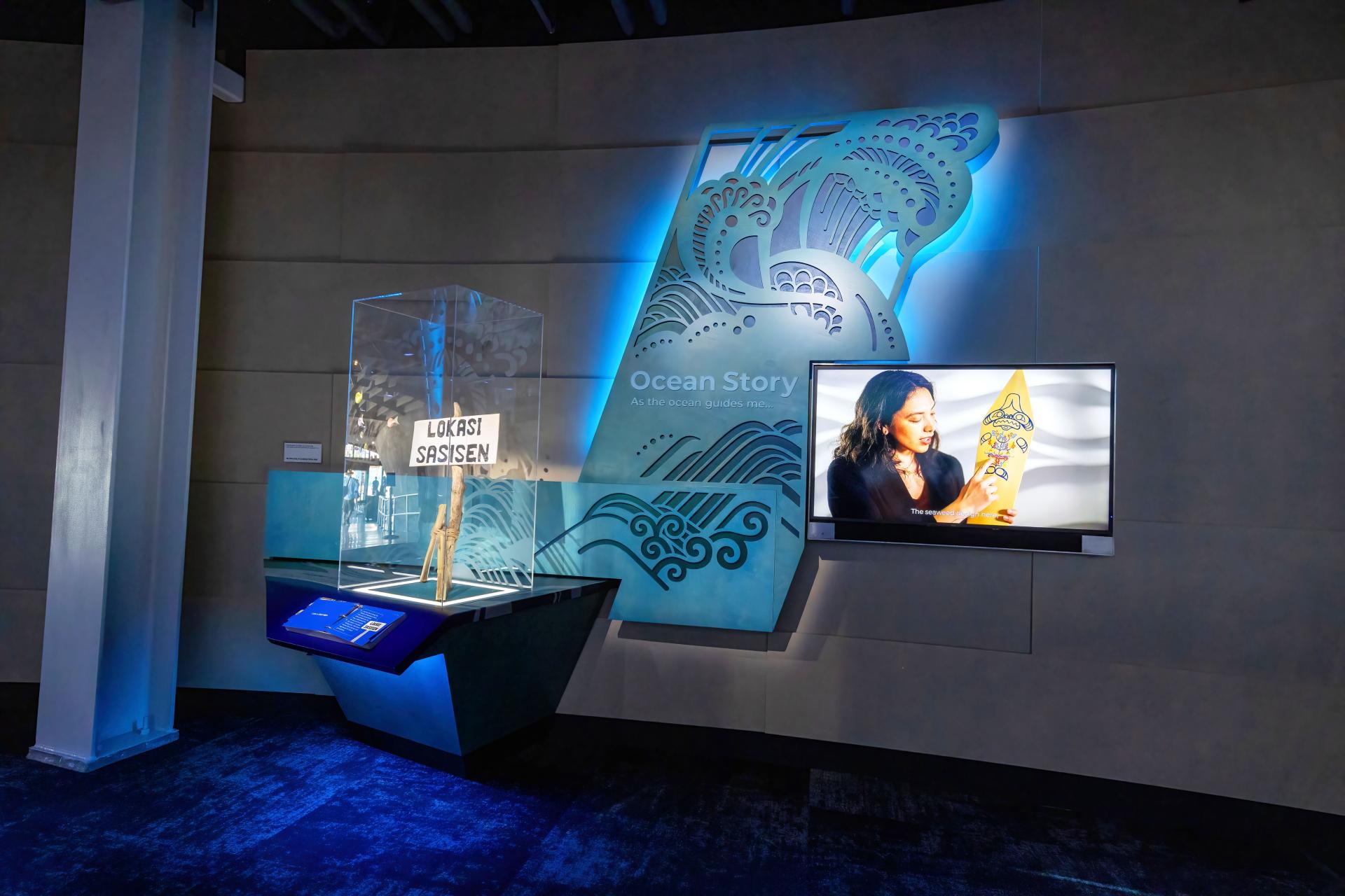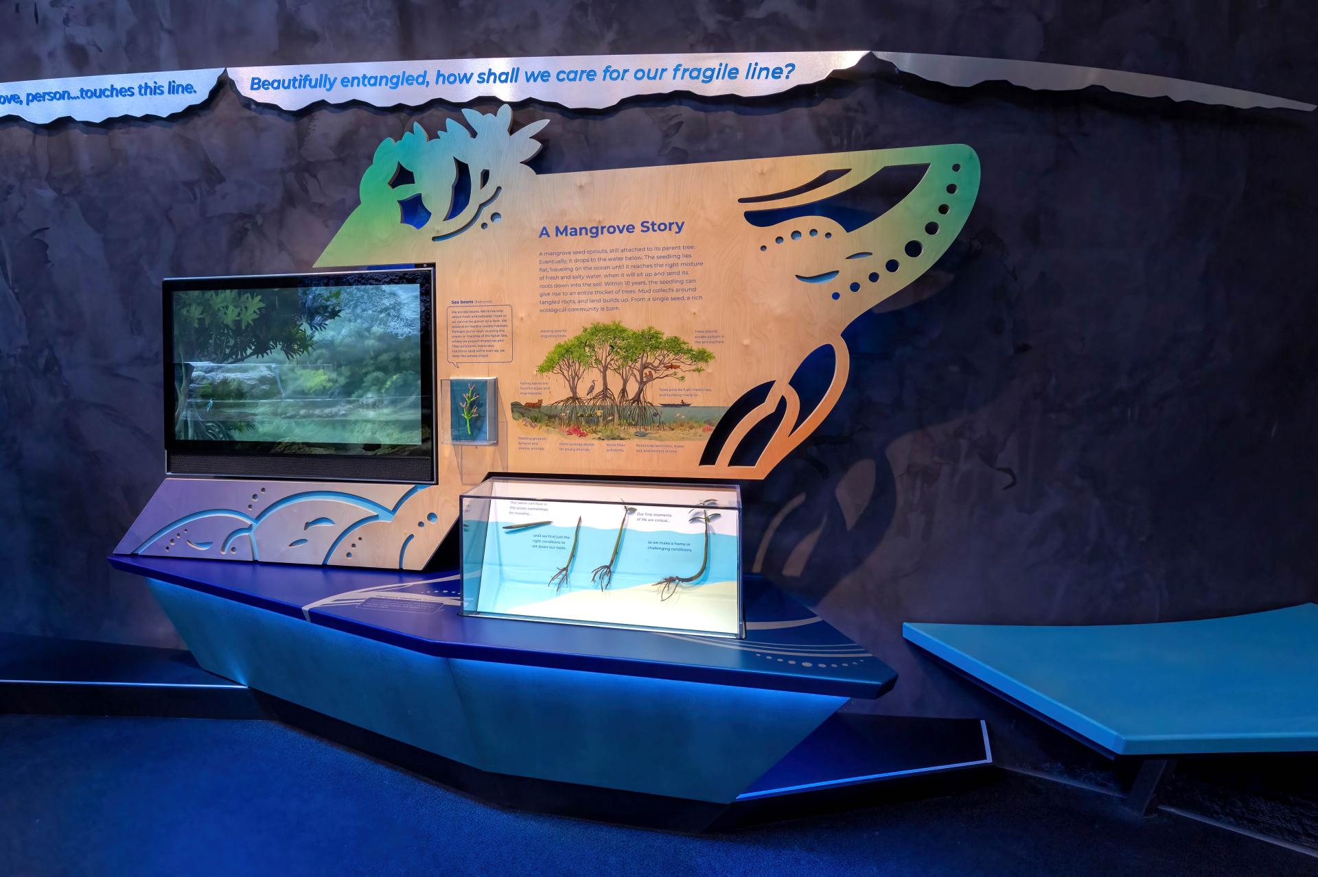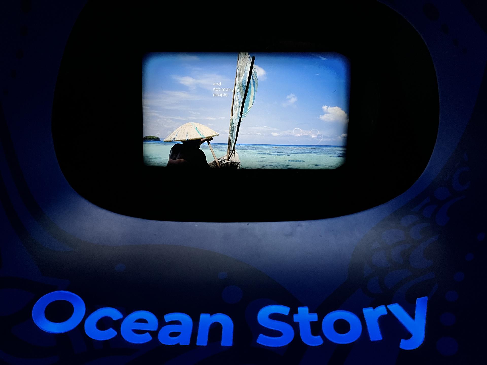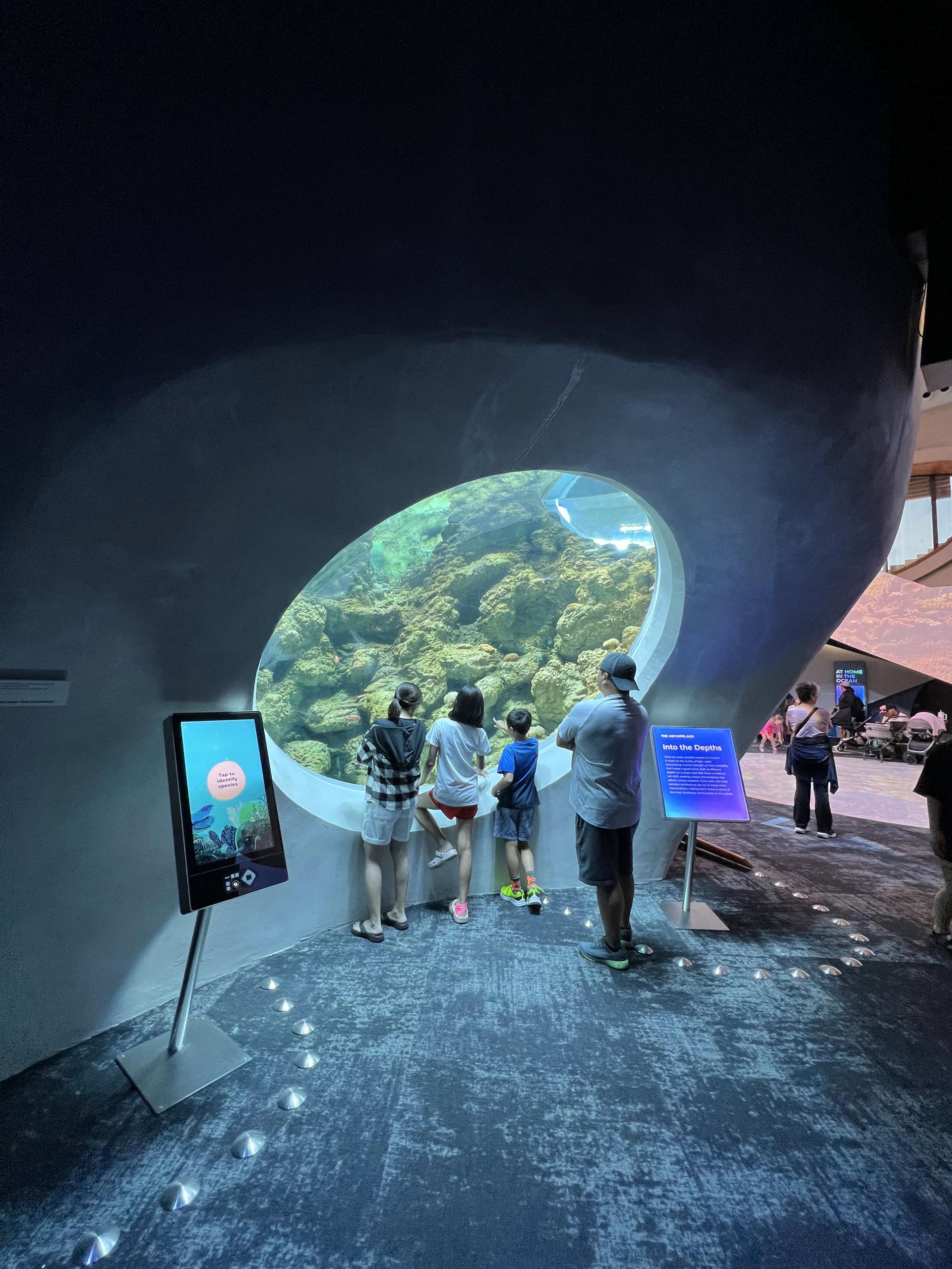 Beyond One Ocean Hall, Ocean Pavilion media helps transport visitors through the Aquarium in varying interactive modes. "Ocean Stories" videos tell first-person stories of individuals whose epiphanies prompted them to dedicate their lives to preserving the oceans. Painterly animation illustrates intricate life cycles of coral reefs and mangrove forests, while "Species ID" interactives involving participatory design engage visitors to search the Aquarium's live exhibits by shape and color. Interactive crawl-through areas with touchscreens present underwater animals from various viewpoints encourage curiosity and discovery. Combined, these media experiences enrich the Ocean Pavilion, complementing its stunning physical environment with an interactive storytelling and educational tools that enlighten, inspire, and increase individuals' attachment to the ocean.