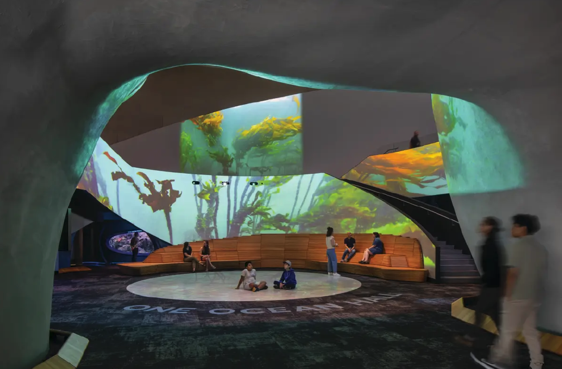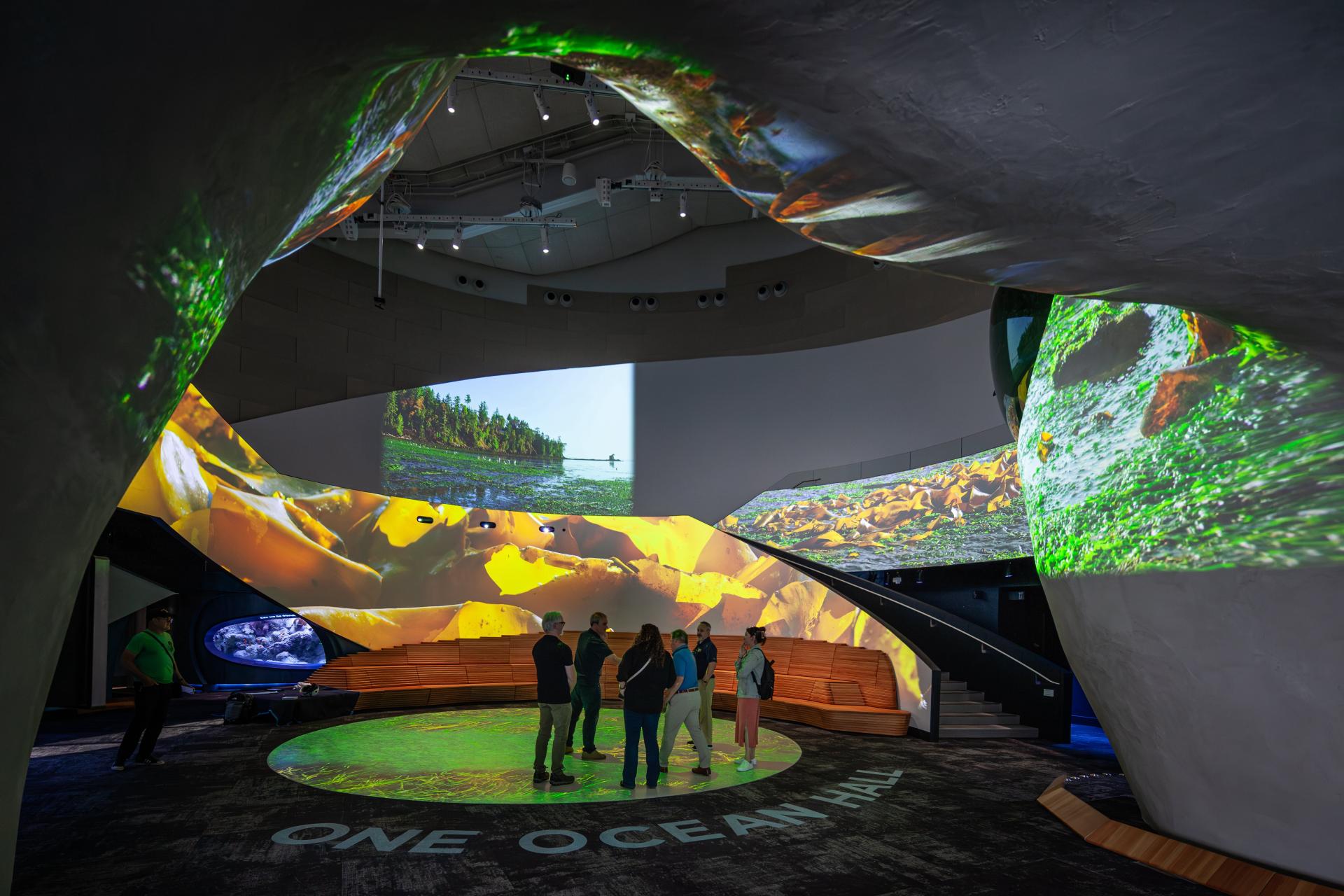 To bring this vision to life, we designed an Aquarium-wide media ecosystem anchored by One Ocean Hall, a fully immersive atrium with twelve video projectors mapping content seamlessly to five surfaces, including the floor. The experience is an ultra high-definition, large-format showcase of breathtaking underwater environments and narrative films, screened throughout the day. Presented by Aquarium personnel and driven by a bespoke, programmable content manage system, these immersive narratives showcase first-person stories about people whose deeply personal connections with the ocean have inspired a lifelong commitment to its conservation.