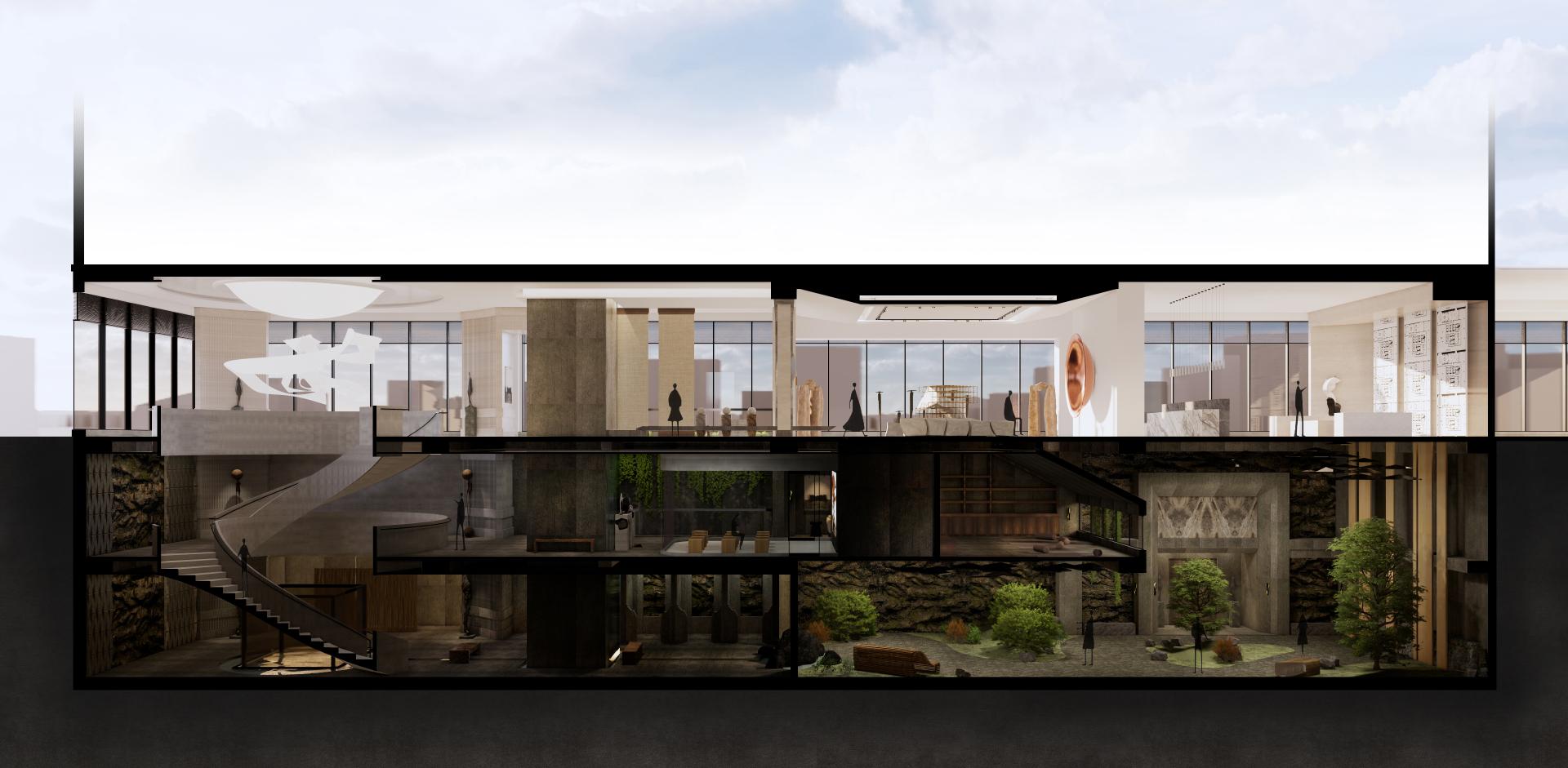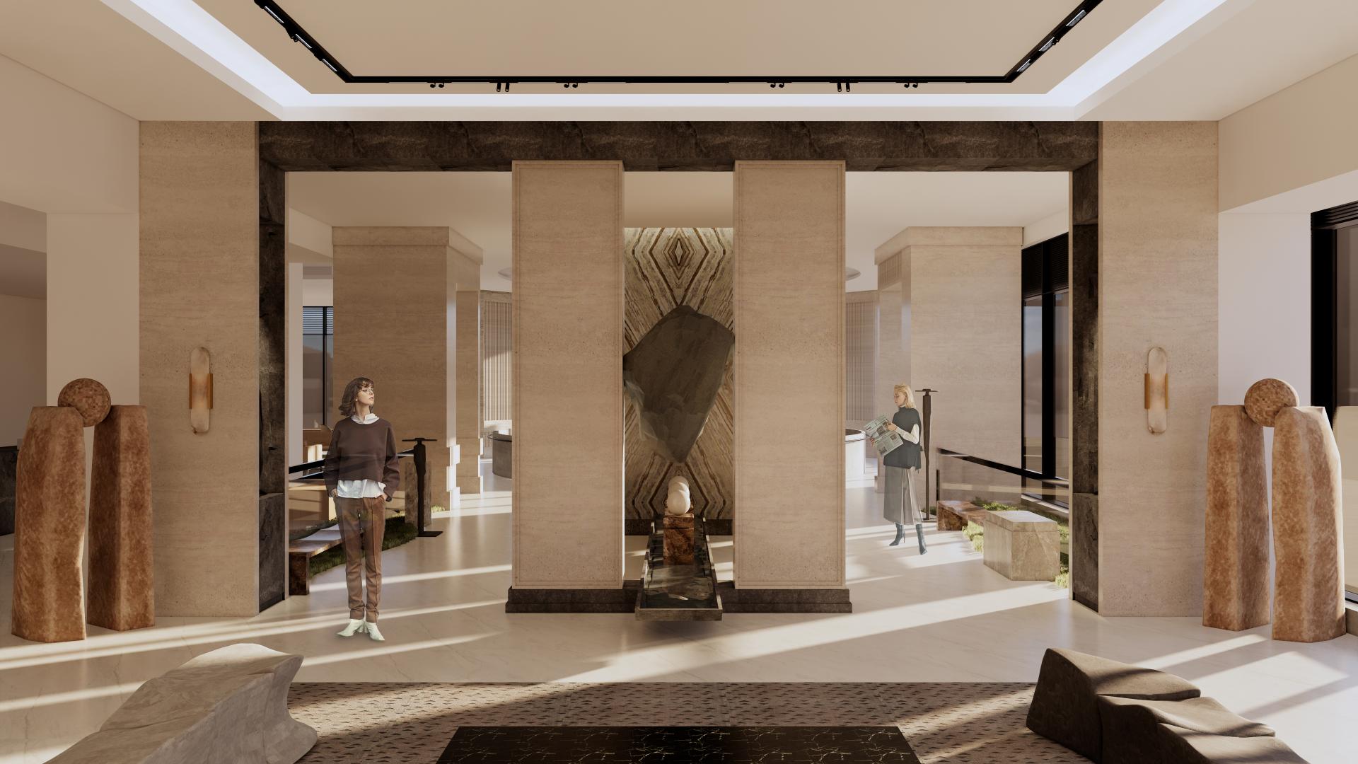 From the moment guests enter, they encounter a serene lobby where natural light, warm earth-toned surfaces, and organic textures evoke a gentle separation from urban bustle. This entrance serves as the “surface” in the overall design narrative. The focal point is a sculptural spiral staircase that spirals downward, illuminated by discreet linear accents suggesting the gradual excavation of deeper layers of introspection.