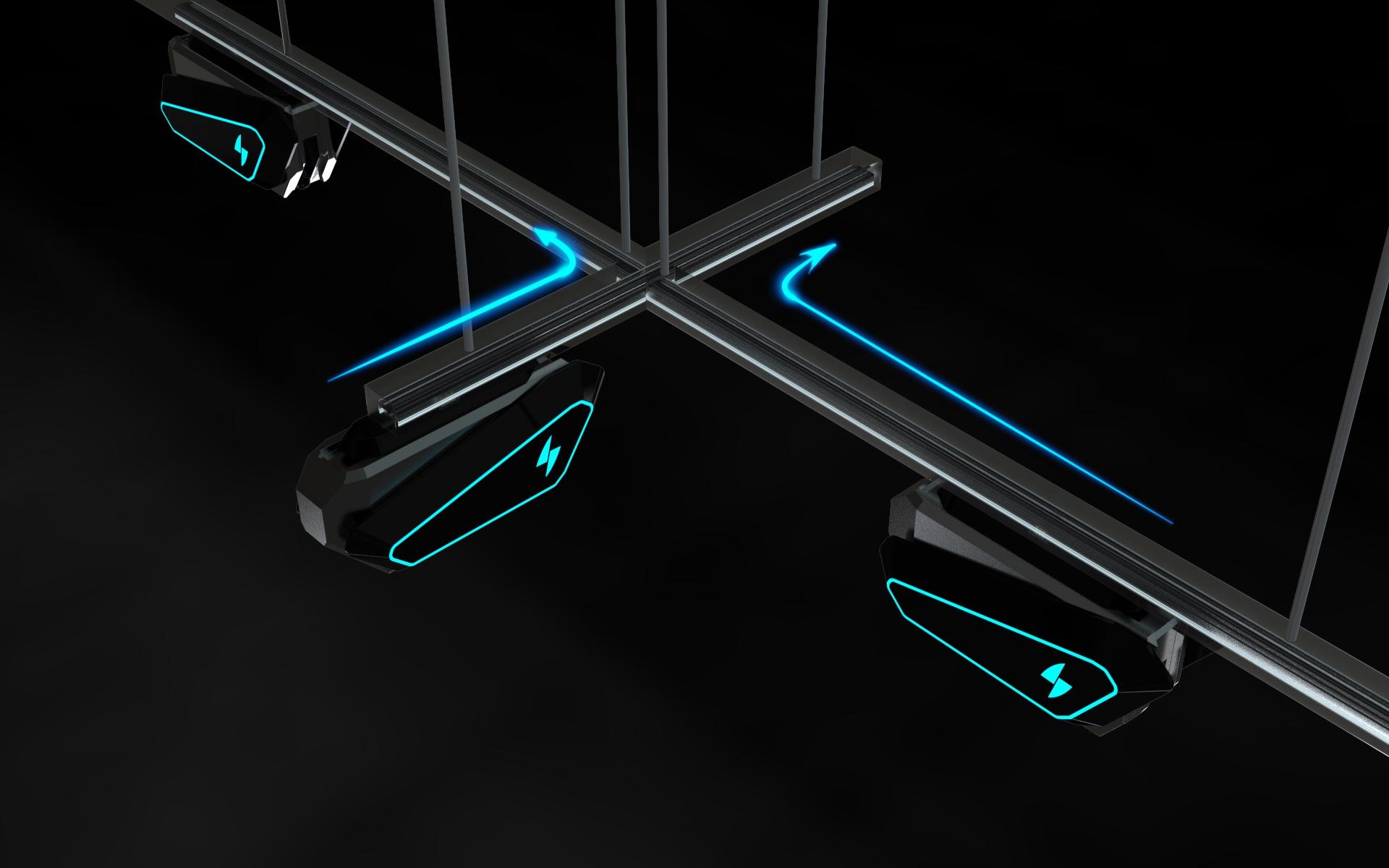 FLUX-CHARGER tackles these challenges with a “centralized power converter + mobile charging cart” design that optimizes energy distribution and reduces manufacturing costs. These chargers are mounted on an overhead track, enabling them to move to required spots, thus minimizing space and the number of chargers needed. Unlike traditional ceiling-mounted systems, mobile carts use wireless power transfer technology for free movement along the track, which also has multiple passing bays to accommodate oncoming carts.