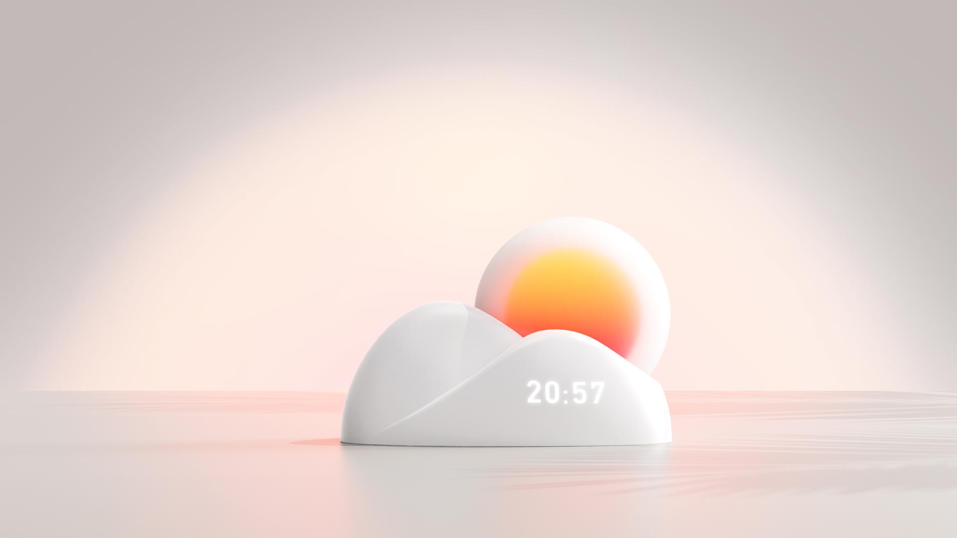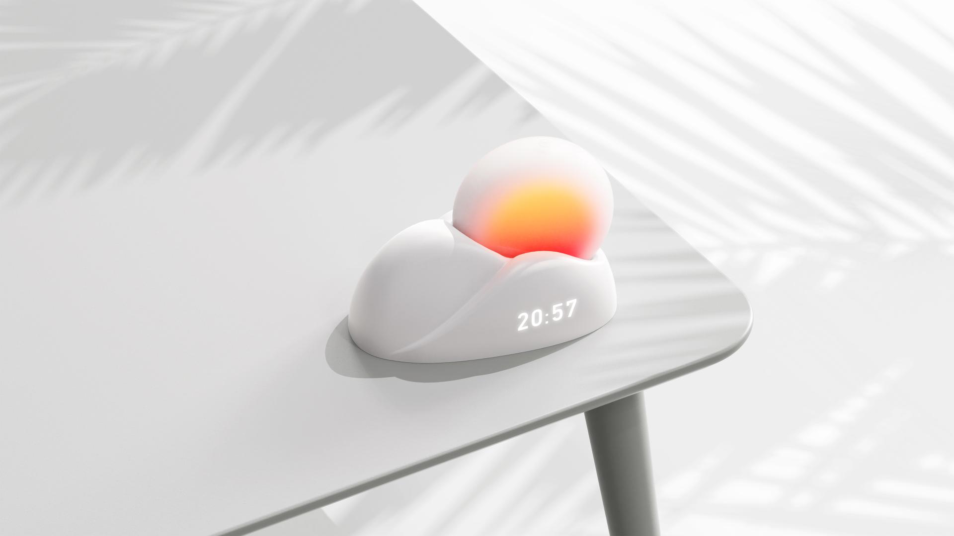 With an LED ambient light built in the main body, the product can change the light color according to the cycle of sunrise and sunset, enhancing the usage pleasure and overall atmosphere. In addition to a charging station, the base can also display the time digitally and be used as an alarm clock on a bedside table, increasing the practicality and versatility of the product.
