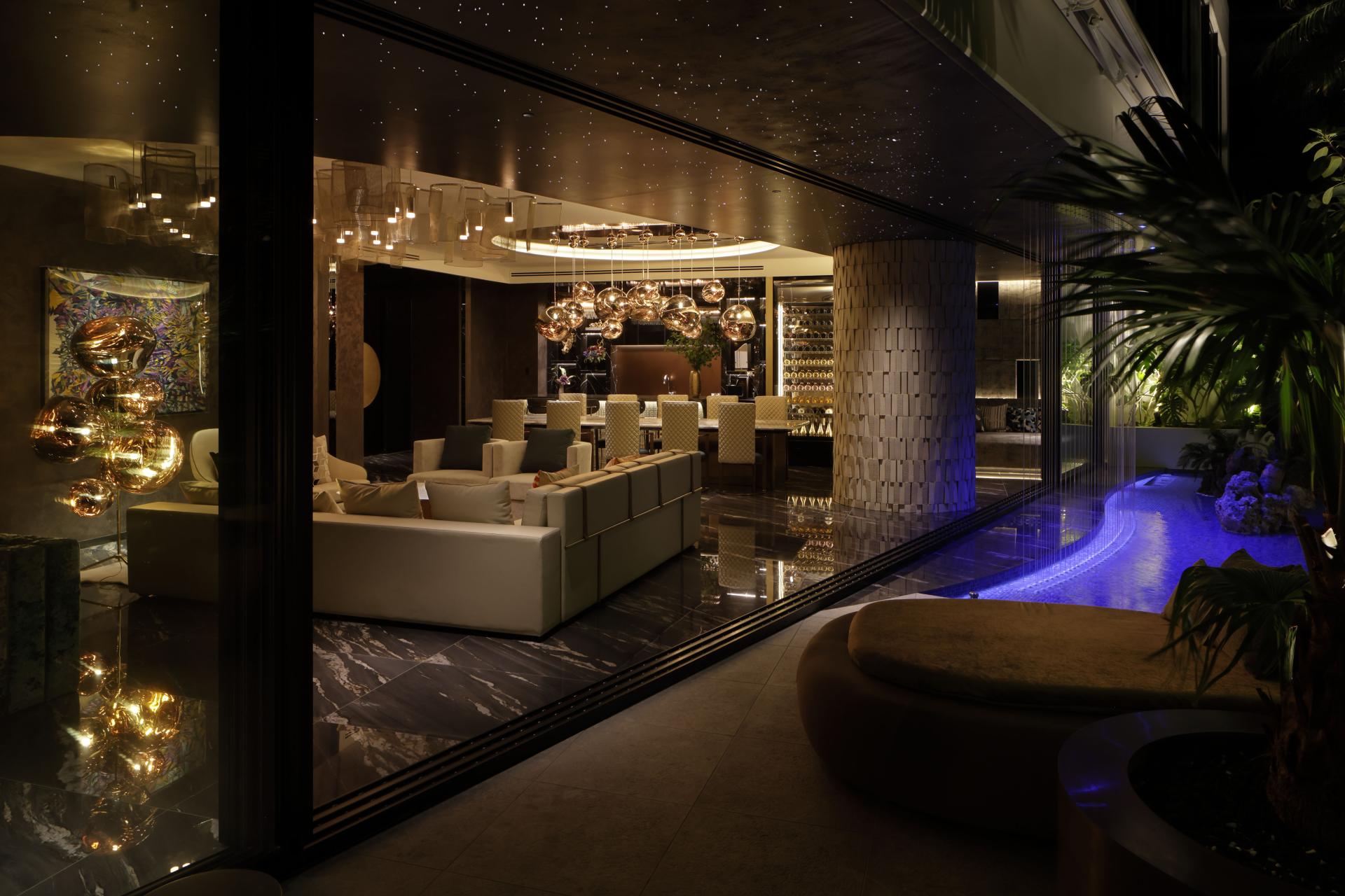 The bar and pool area is stately and glamorous, with a contrast of gold and black.