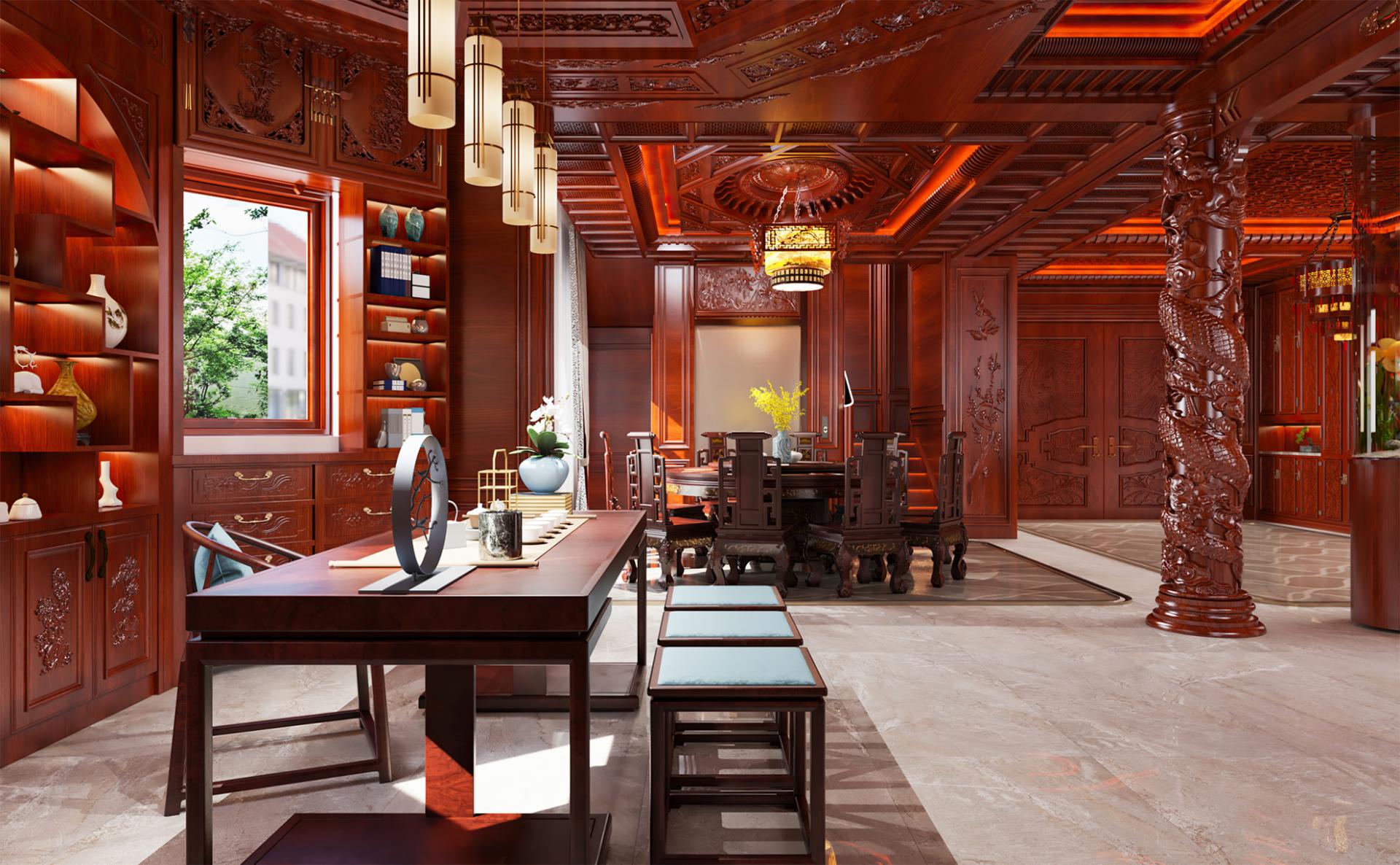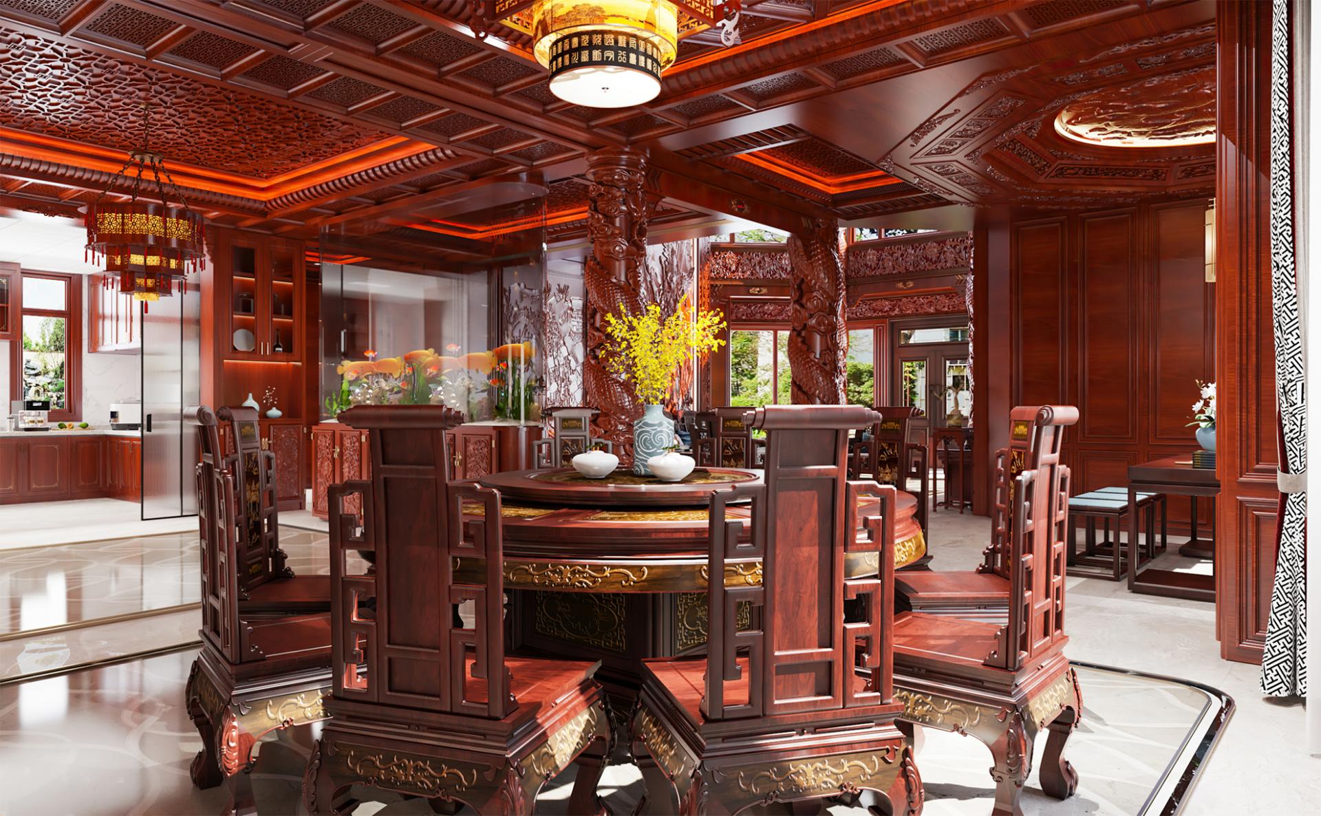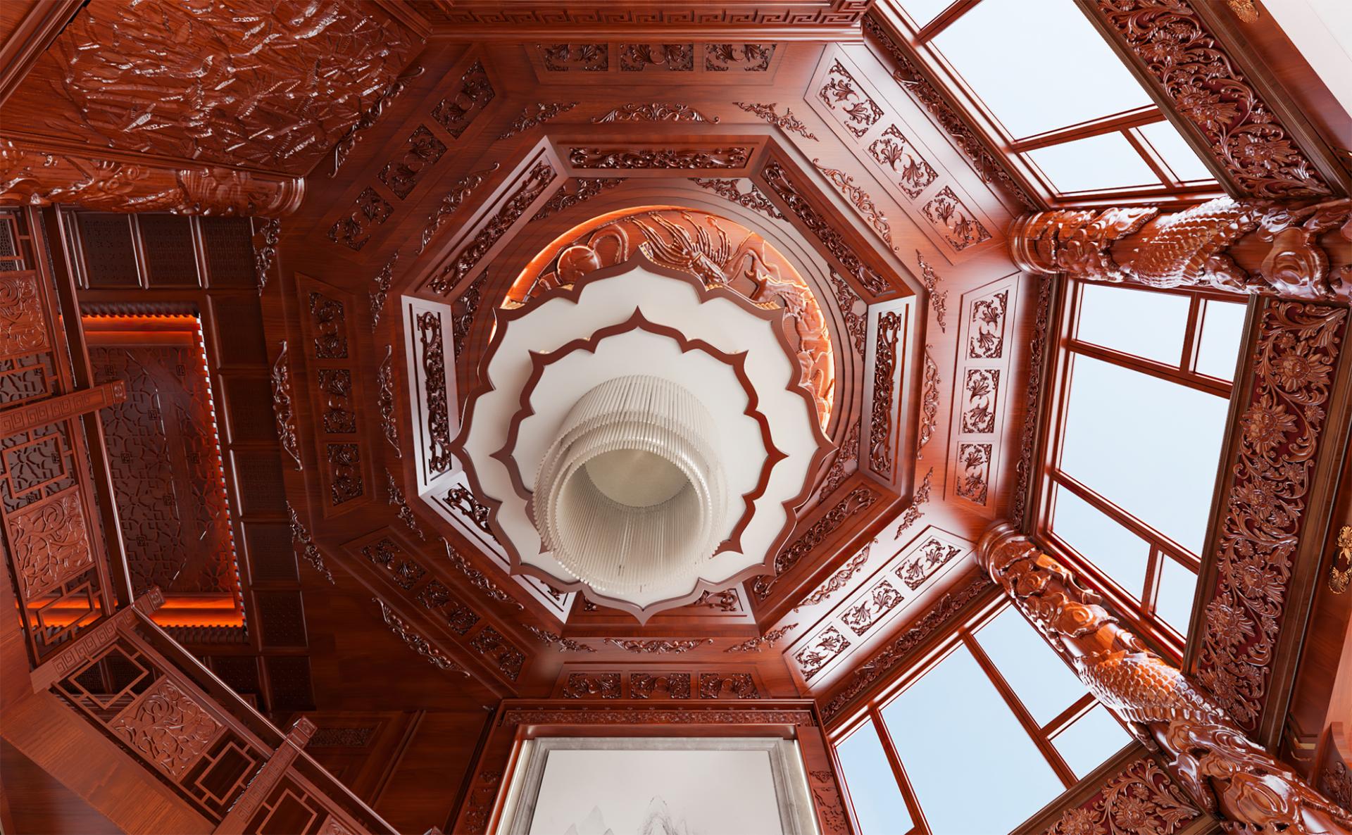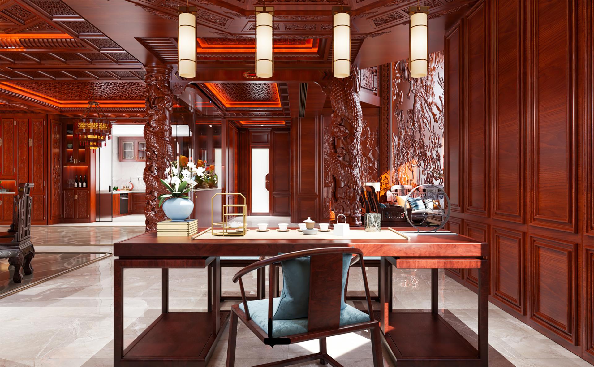 With an area of about 800 square meters, this private villa design concept starts from the traditional Chinese oriental mood, by adopting rich cultural mood and connotation of mahogany as the dominant spatial material, to create a vivid atmosphere, landscape mingled with the residential environment. Redwood's deep red is used as the basis for the color tone, with gold, silver, emerald green, jewel blue and other royal colors, to create a noble and elegant but not lose the affinity of the home atmosphere.