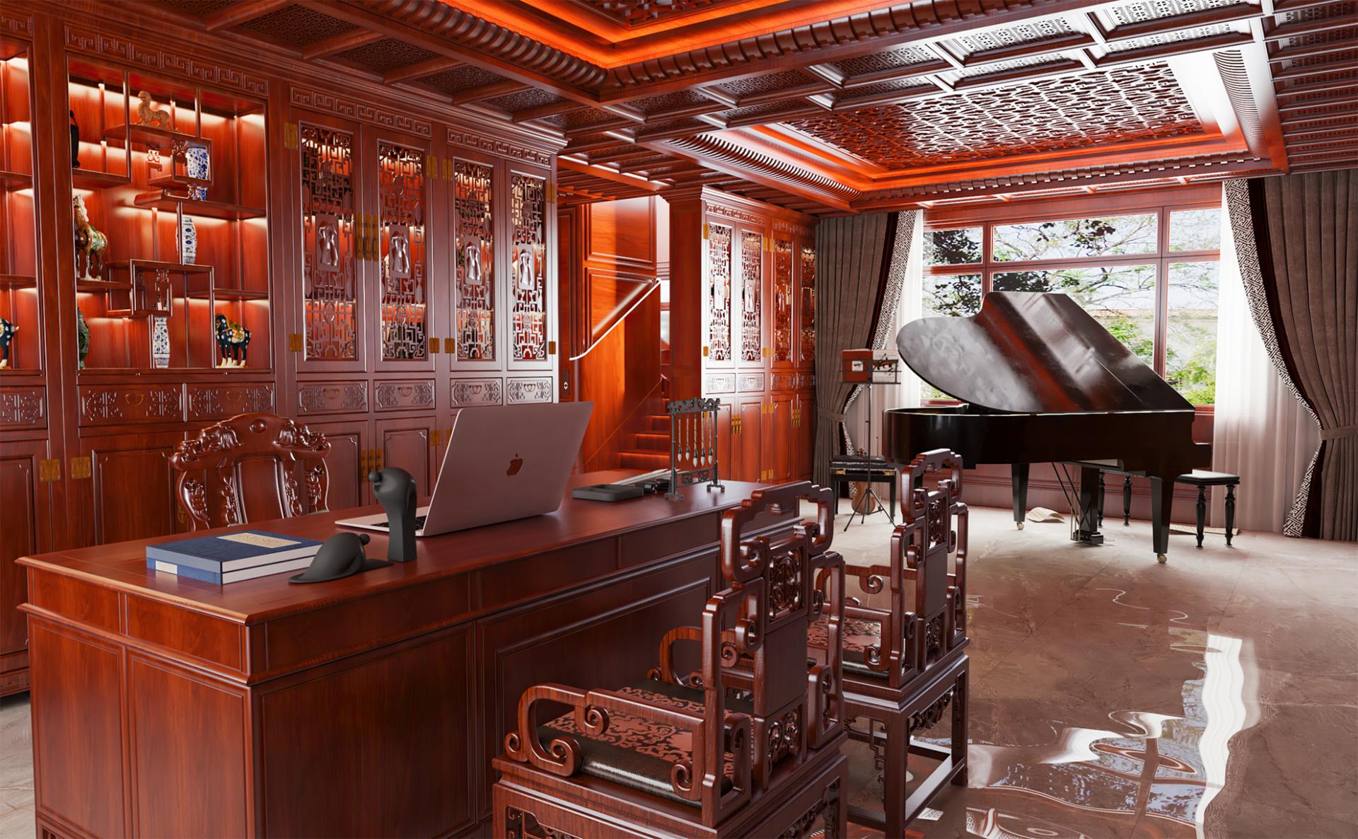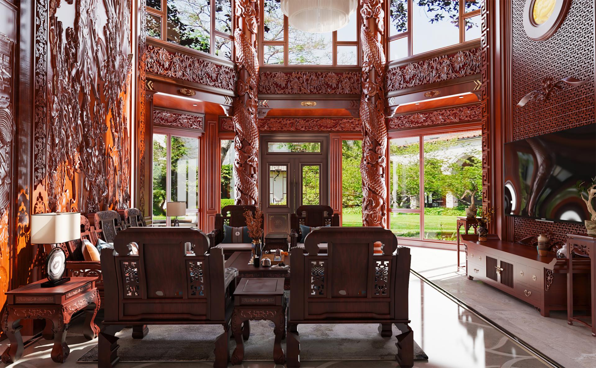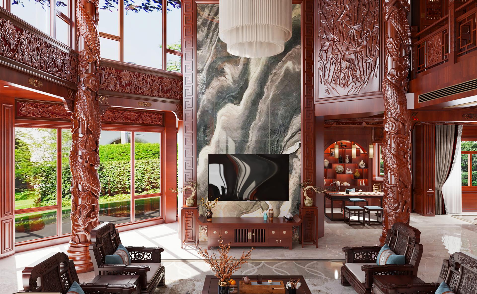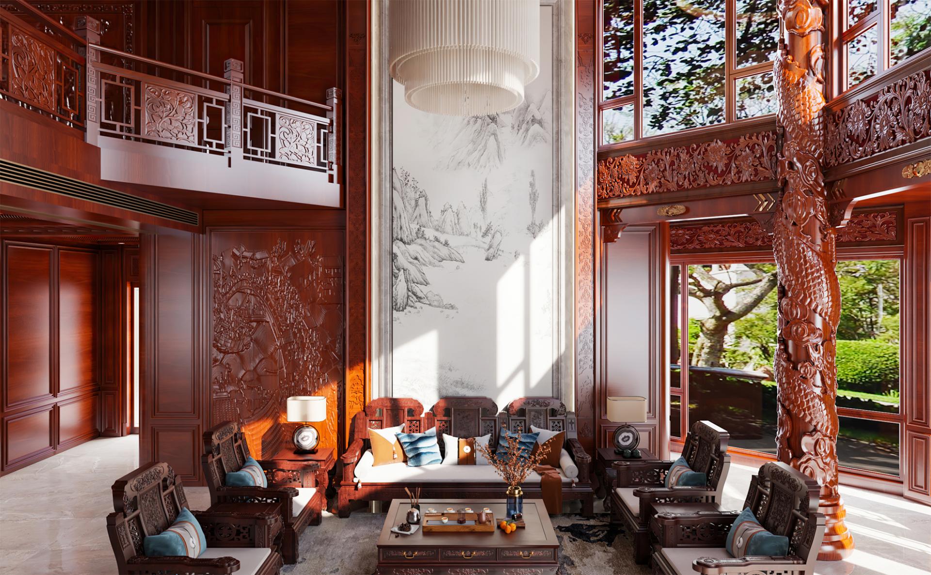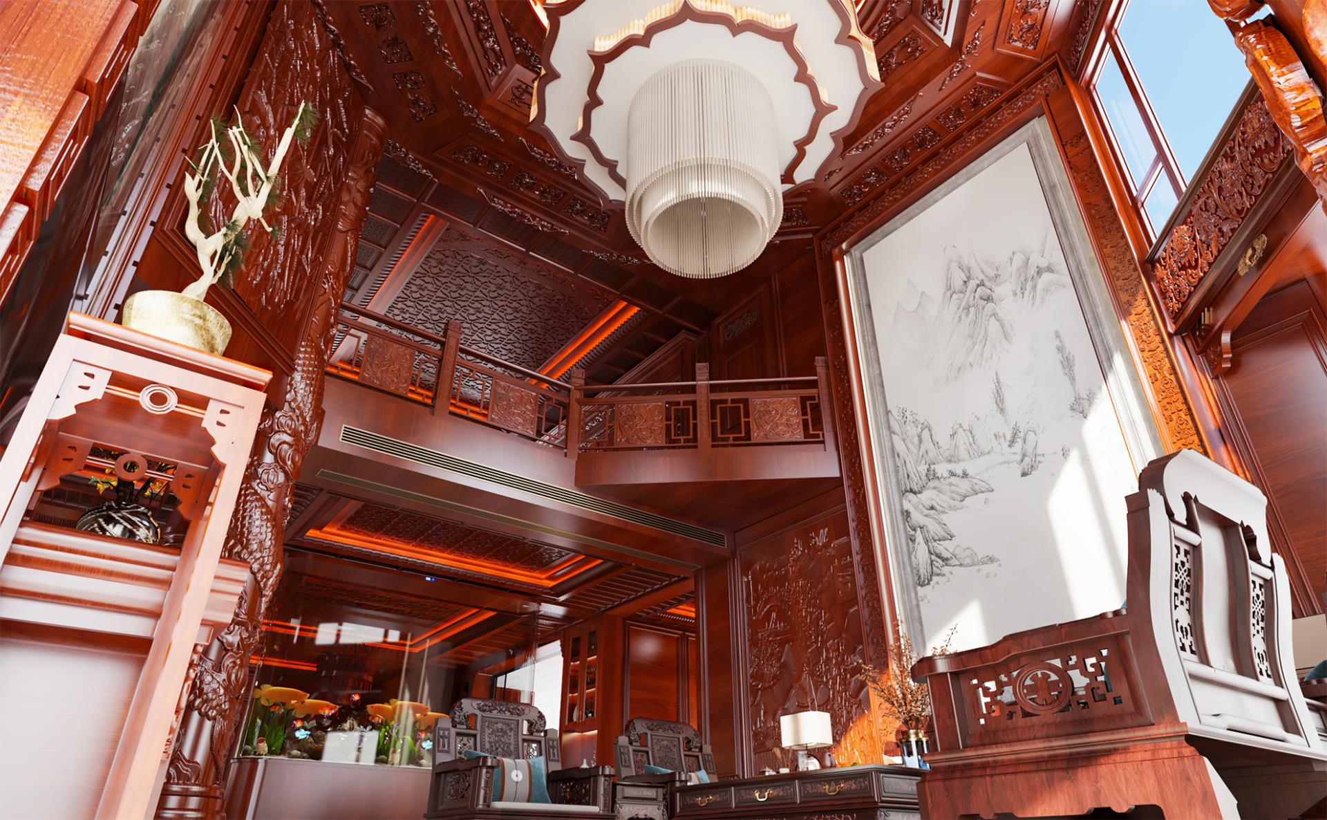 With an area of about 800 square meters, this private villa design concept starts from the traditional Chinese oriental mood, by adopting rich cultural mood and connotation of mahogany as the dominant spatial material, to create a vivid atmosphere, landscape mingled with the residential environment. Redwood's deep red is used as the basis for the color tone, with gold, silver, emerald green, jewel blue and other royal colors, to create a noble and elegant but not lose the affinity of the home atmosphere.