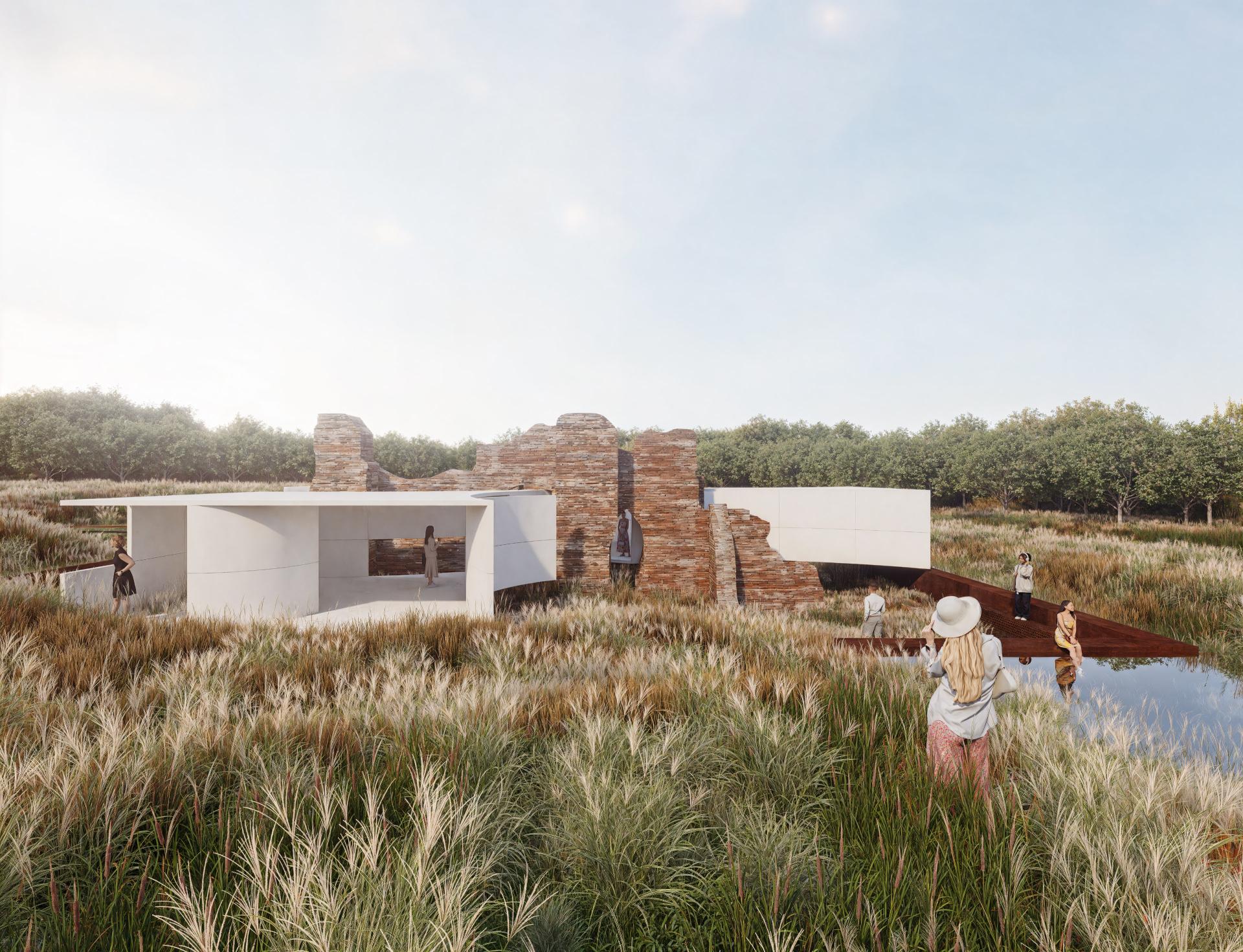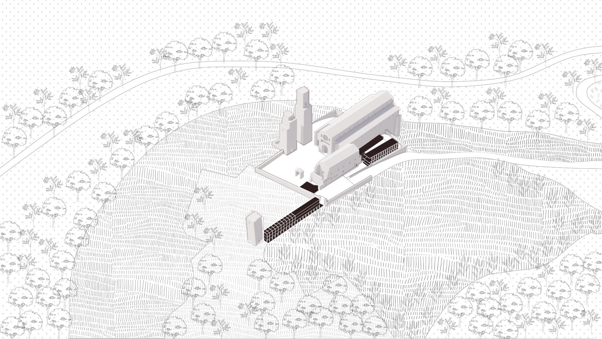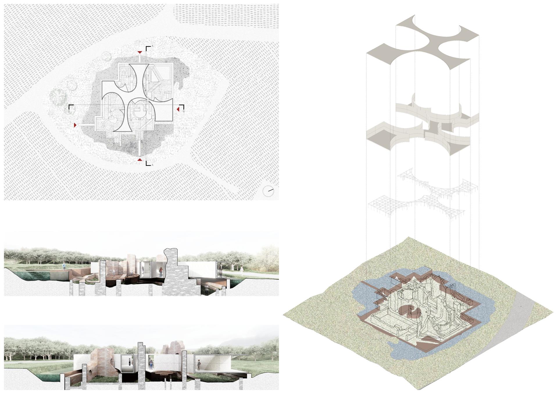 At Curinga, we reawaken Roman thermal bath ruins with a minimalist steel and translucent concrete structure. Rather than reconstructing, we encircle the remnants with a visitor path and interactive zones. Water features and light projections revive the baths’ essence, sparking imagination and personal engagement with history, as inspired by Bachelard’s poetic spaces.