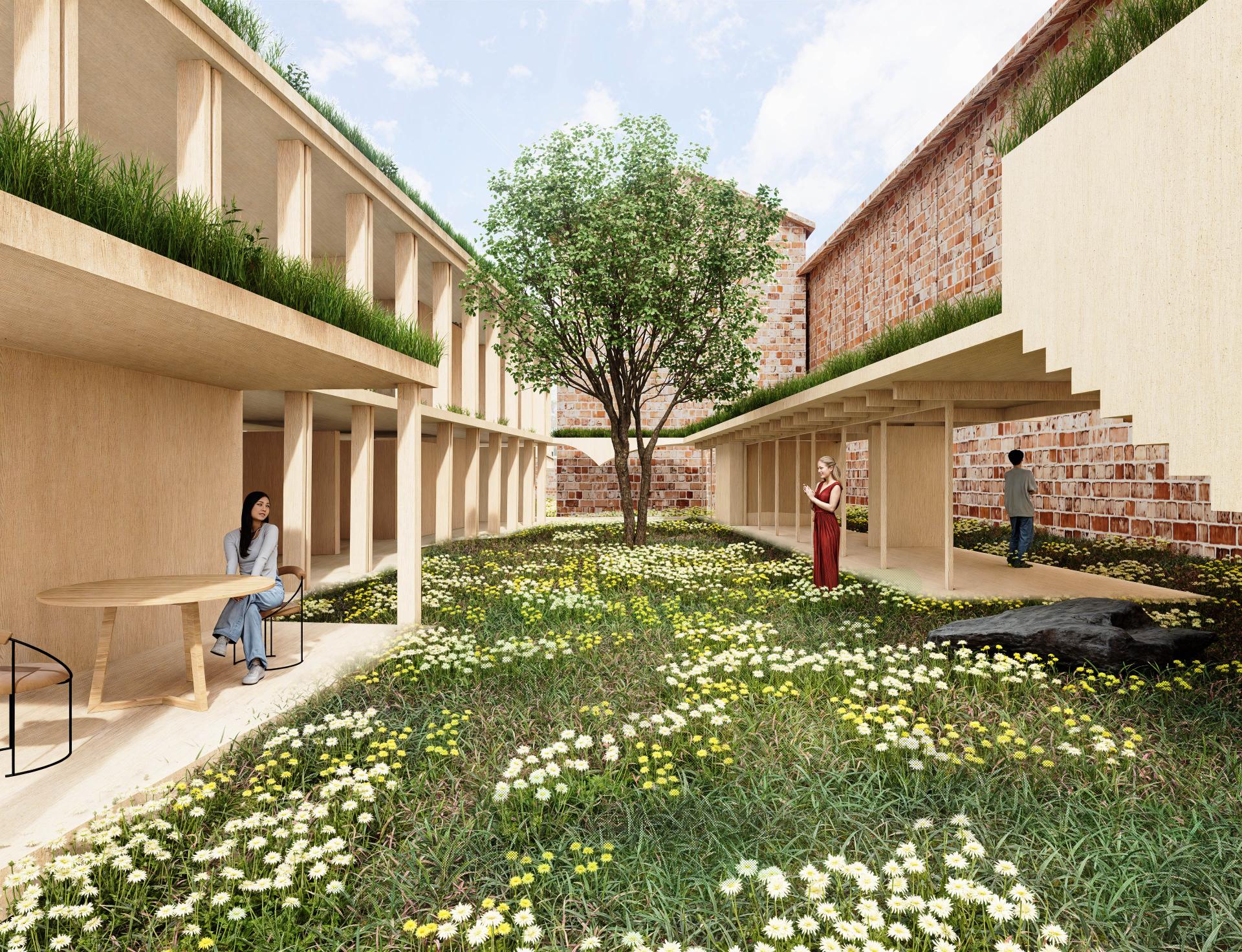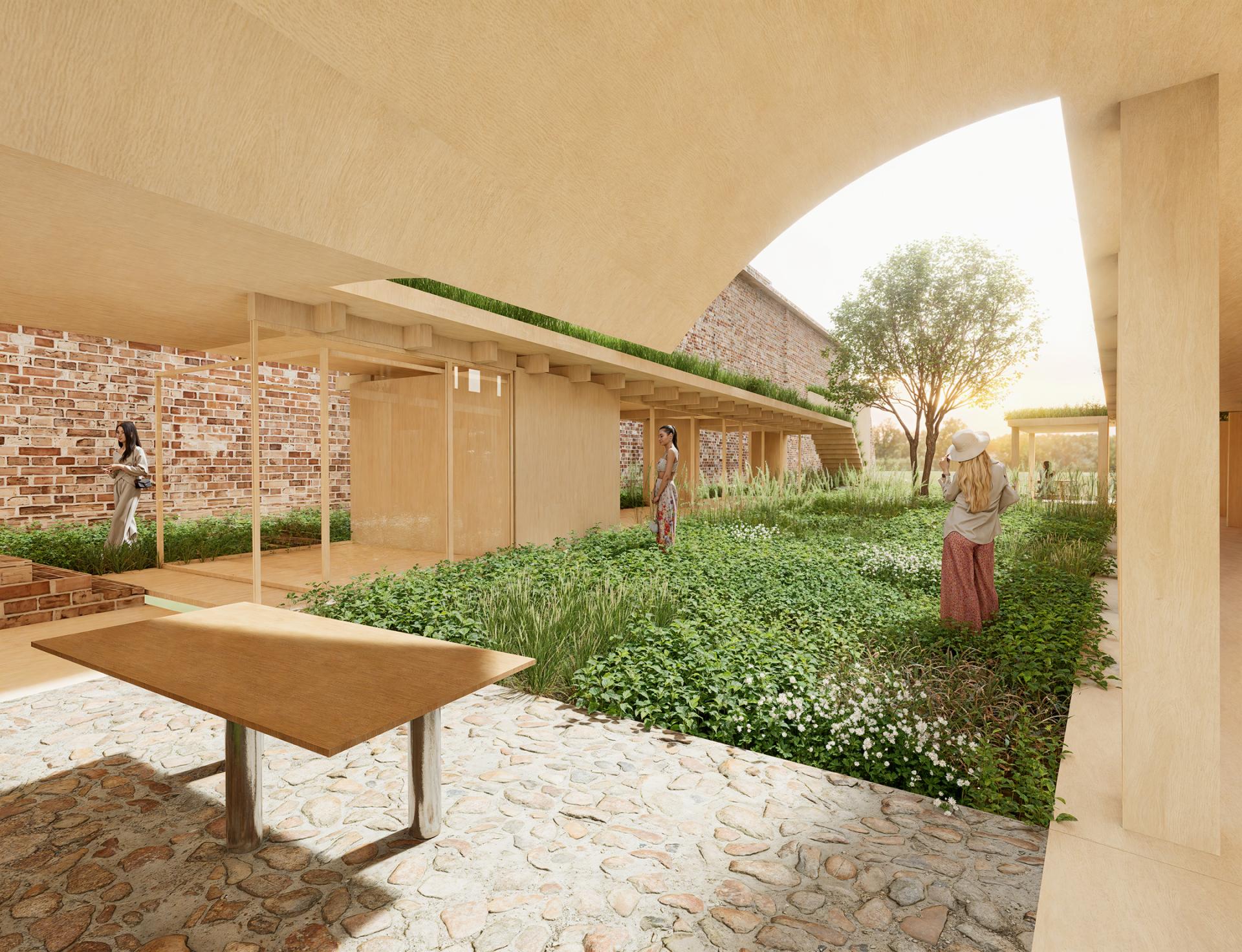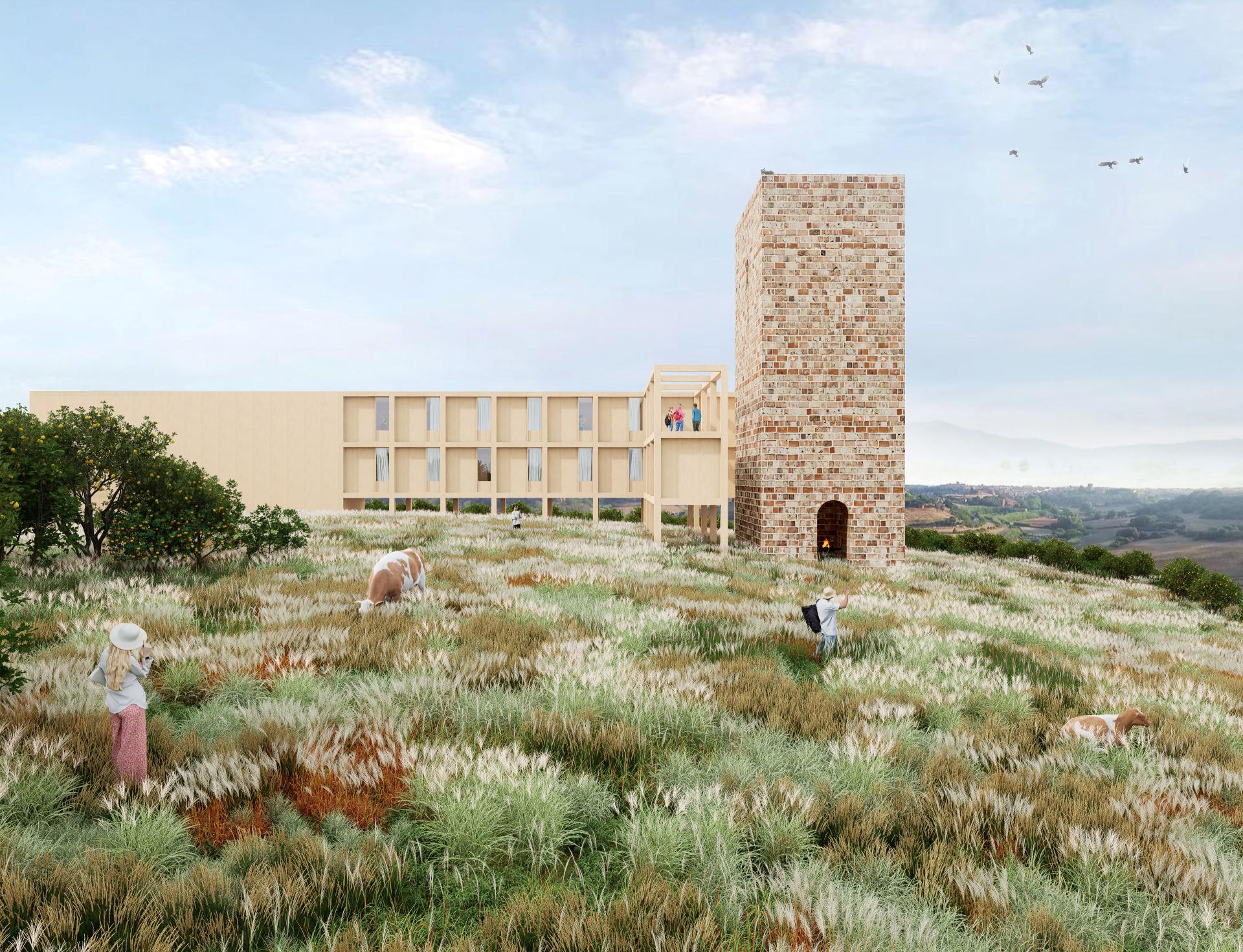 In Tuscania, we transform an 8th-century church complex into a shelter for pilgrims during the Jubilee, themed “Pilgrims of Hope.” A series of symbolic gates, constructed with wood and bricks, integrate with the sacred site, creating spaces for singing, dining, and reflection. These portals link history and modernity, fostering spiritual renewal and community connection, ensuring the church thrives as a living sanctuary.