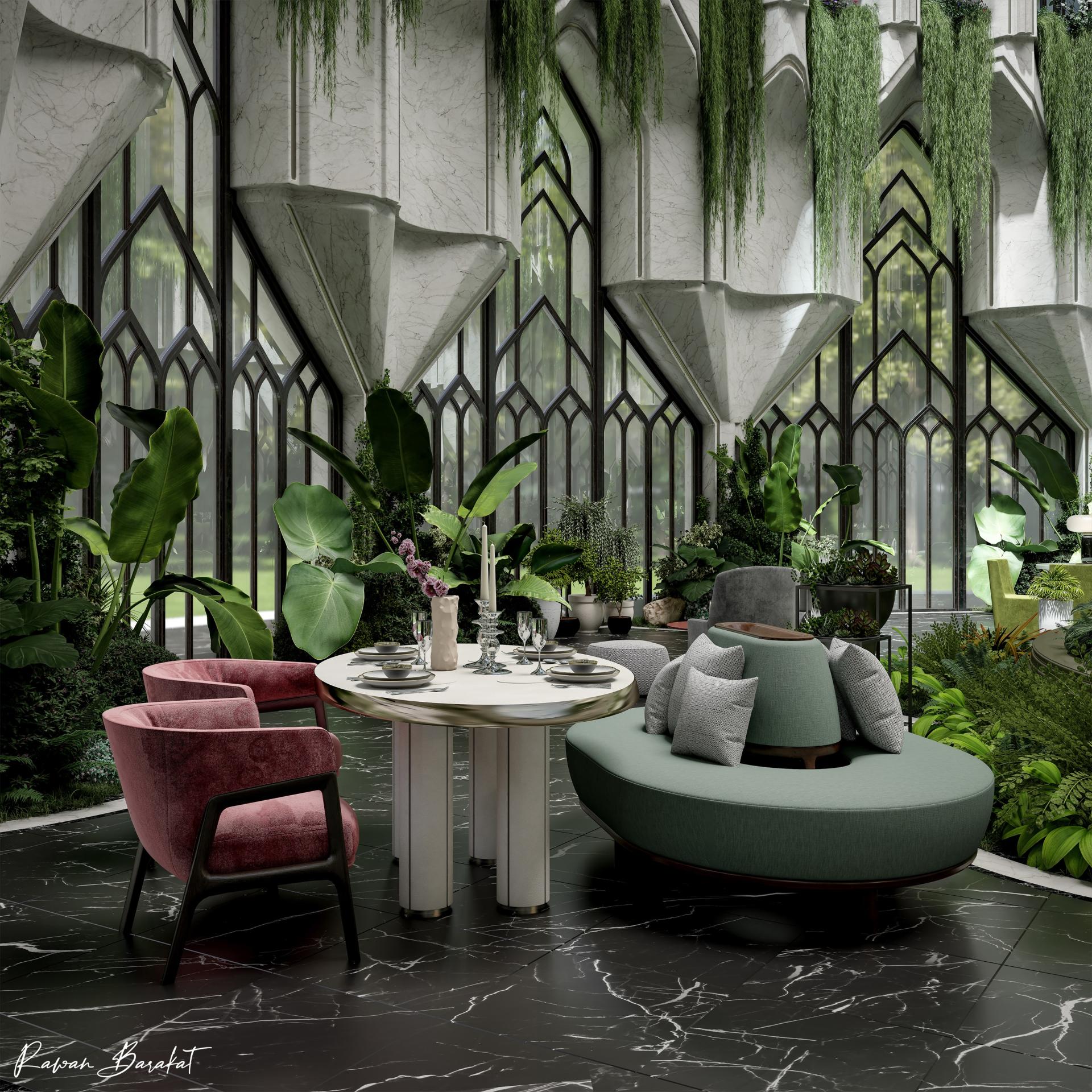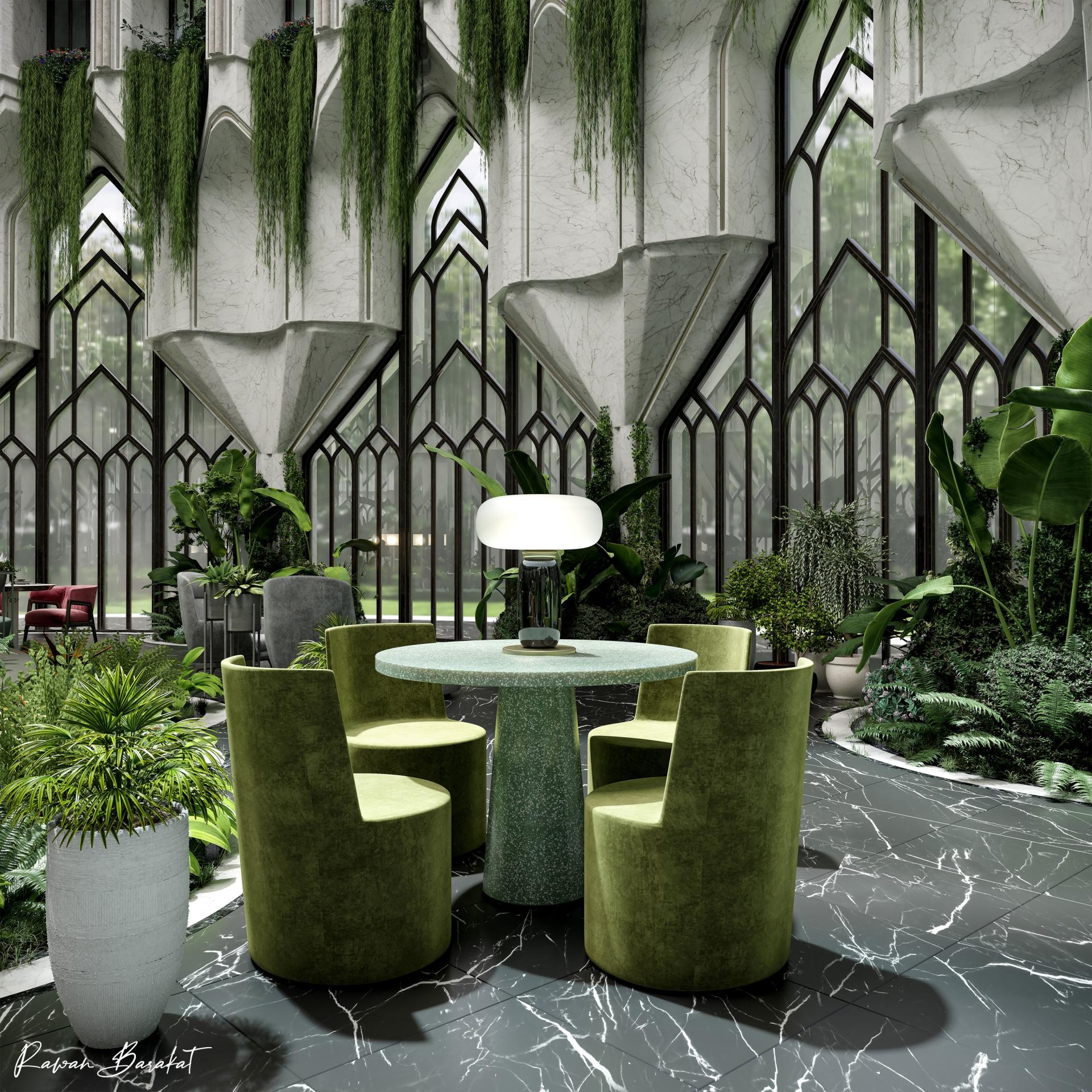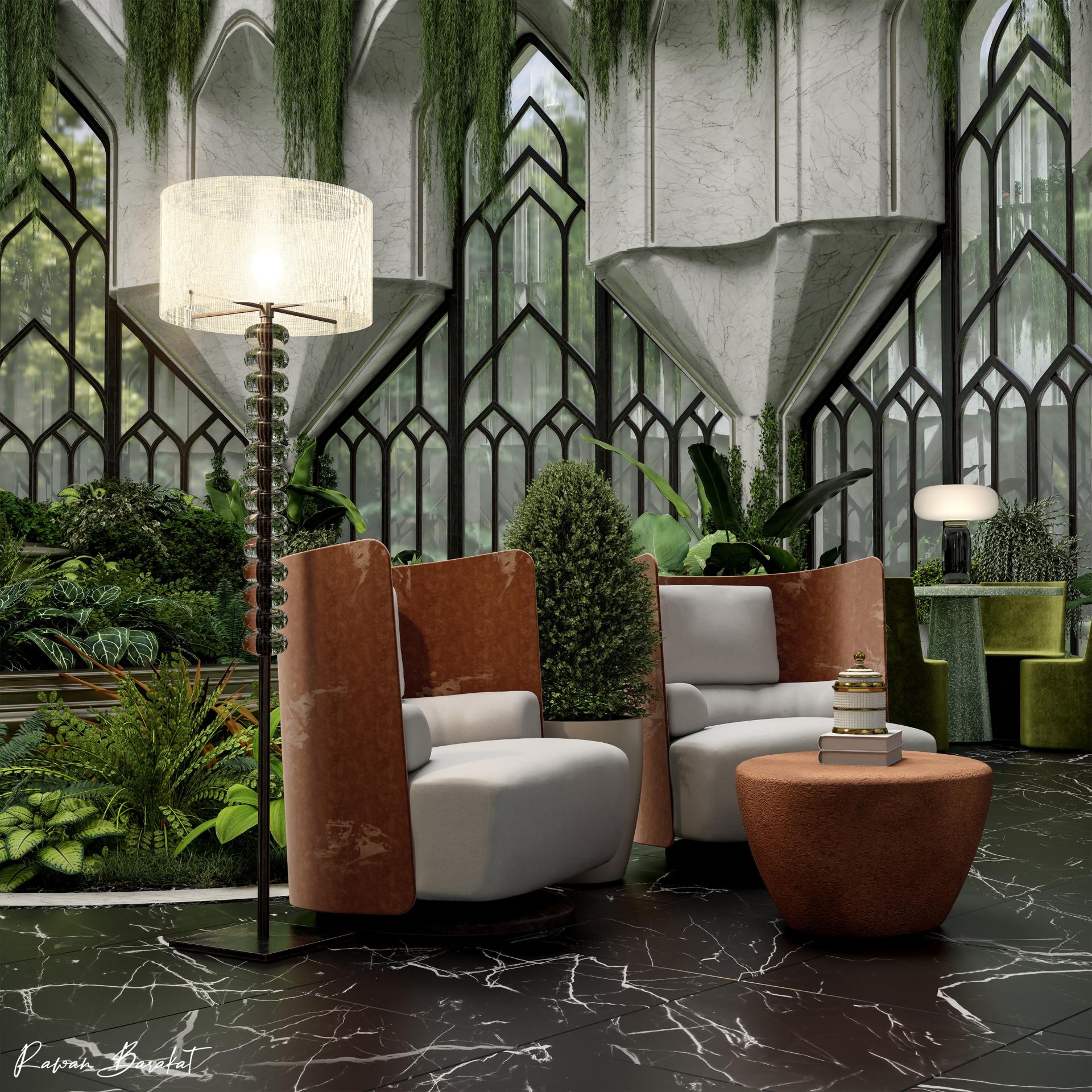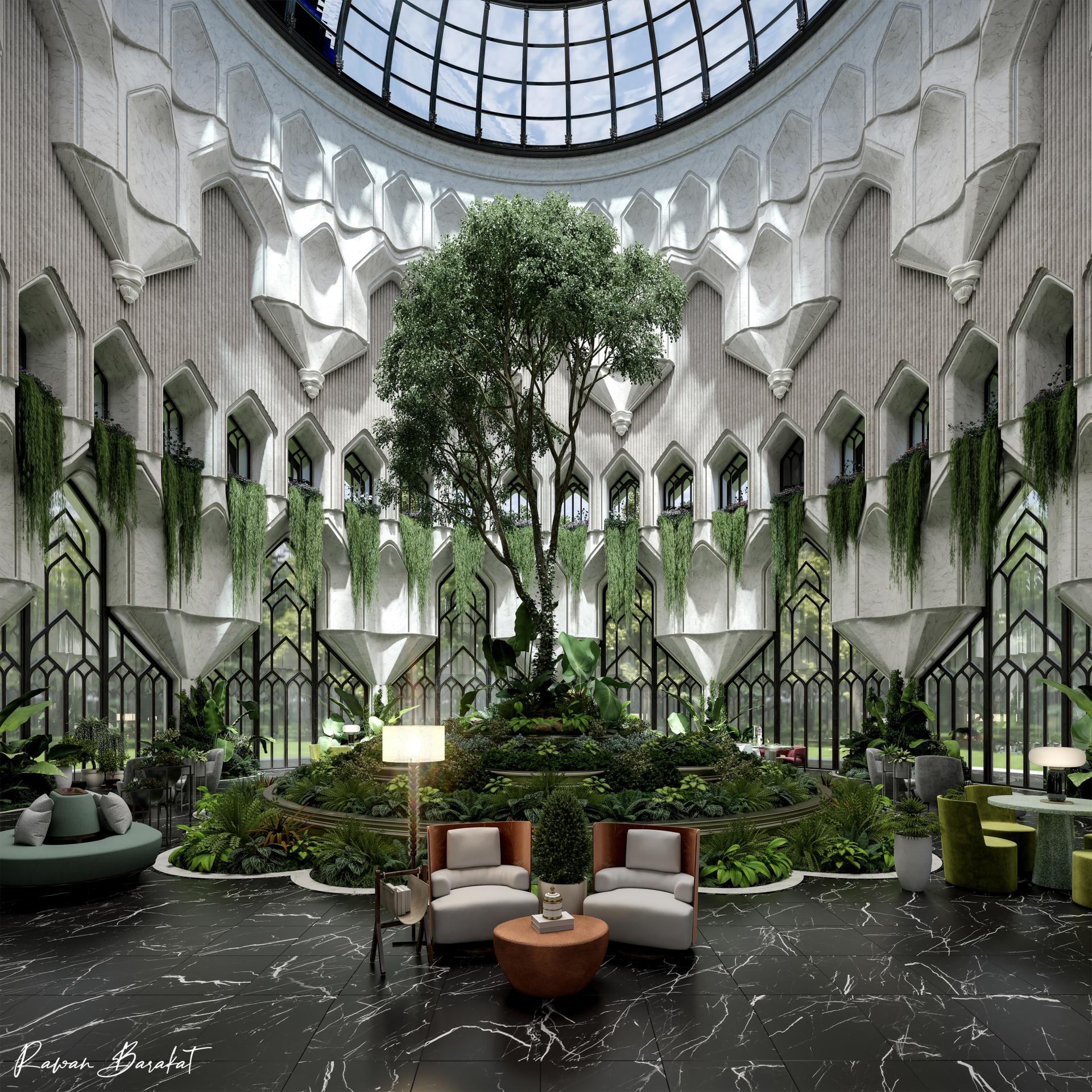 The sensory experience within the lounge is equally captivating. Natural light filters through the expansive glass ceiling during the day, while recessed and ambient lighting take over at night, ensuring a seamless transition between different atmospheres. The gentle rustling of leaves, the subtle fragrance of fresh greenery, and the cool, polished surface of the marble floors add to the multi-sensory richness of the space. More than just a place for social interaction, the lounge is a true retreat a perfect blend of nature and design, offering visitors a haven of calm, inspiration, and timeless beauty.
