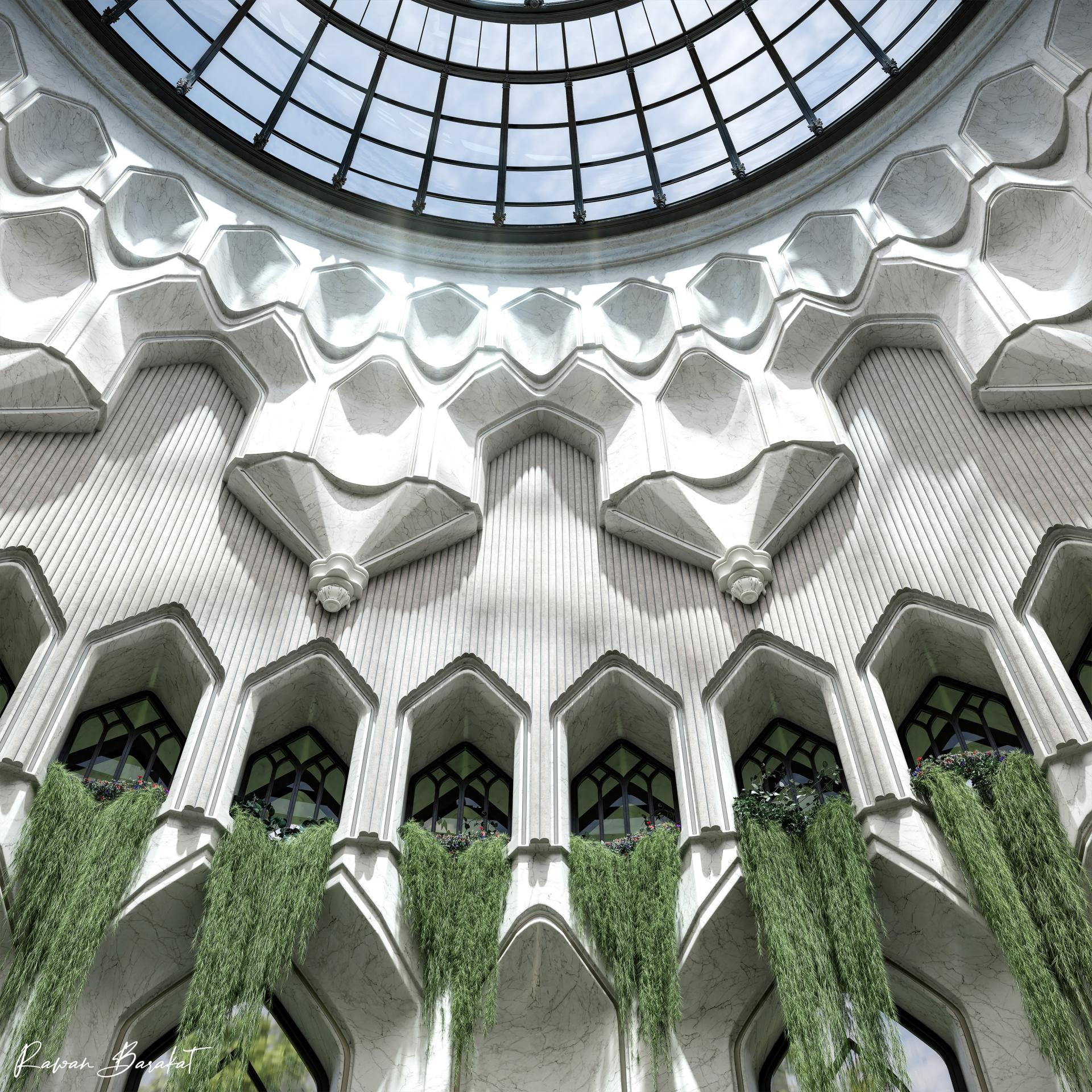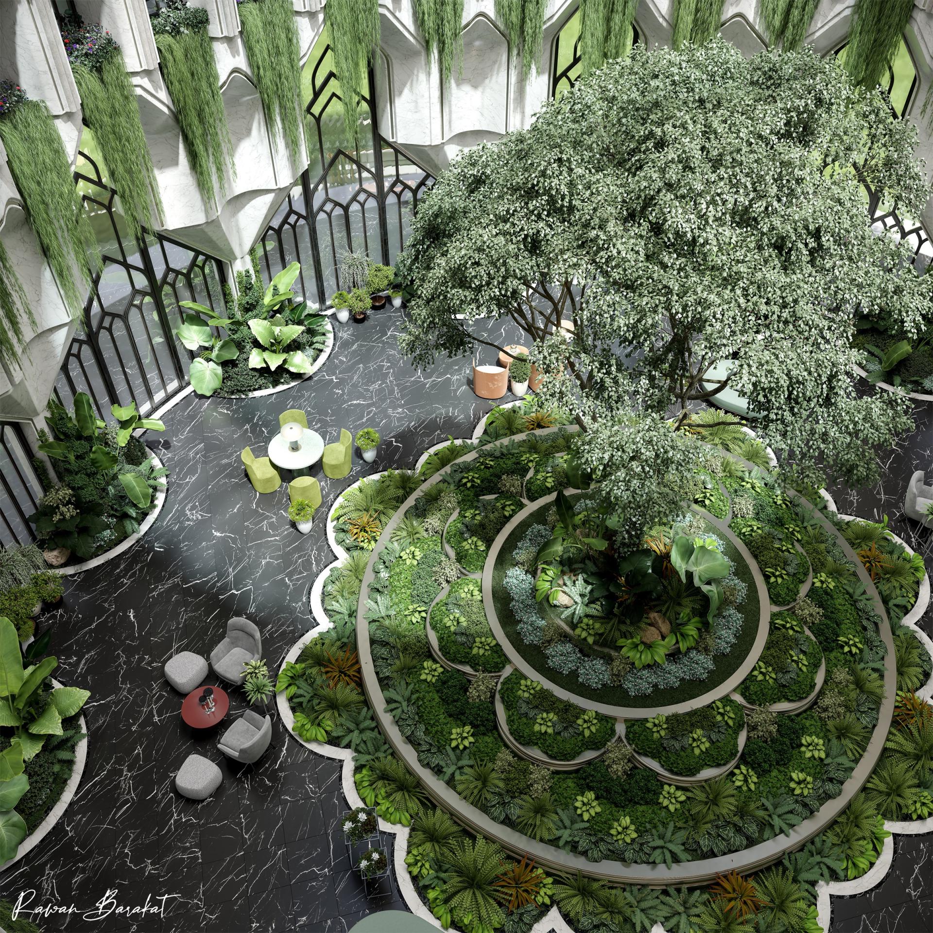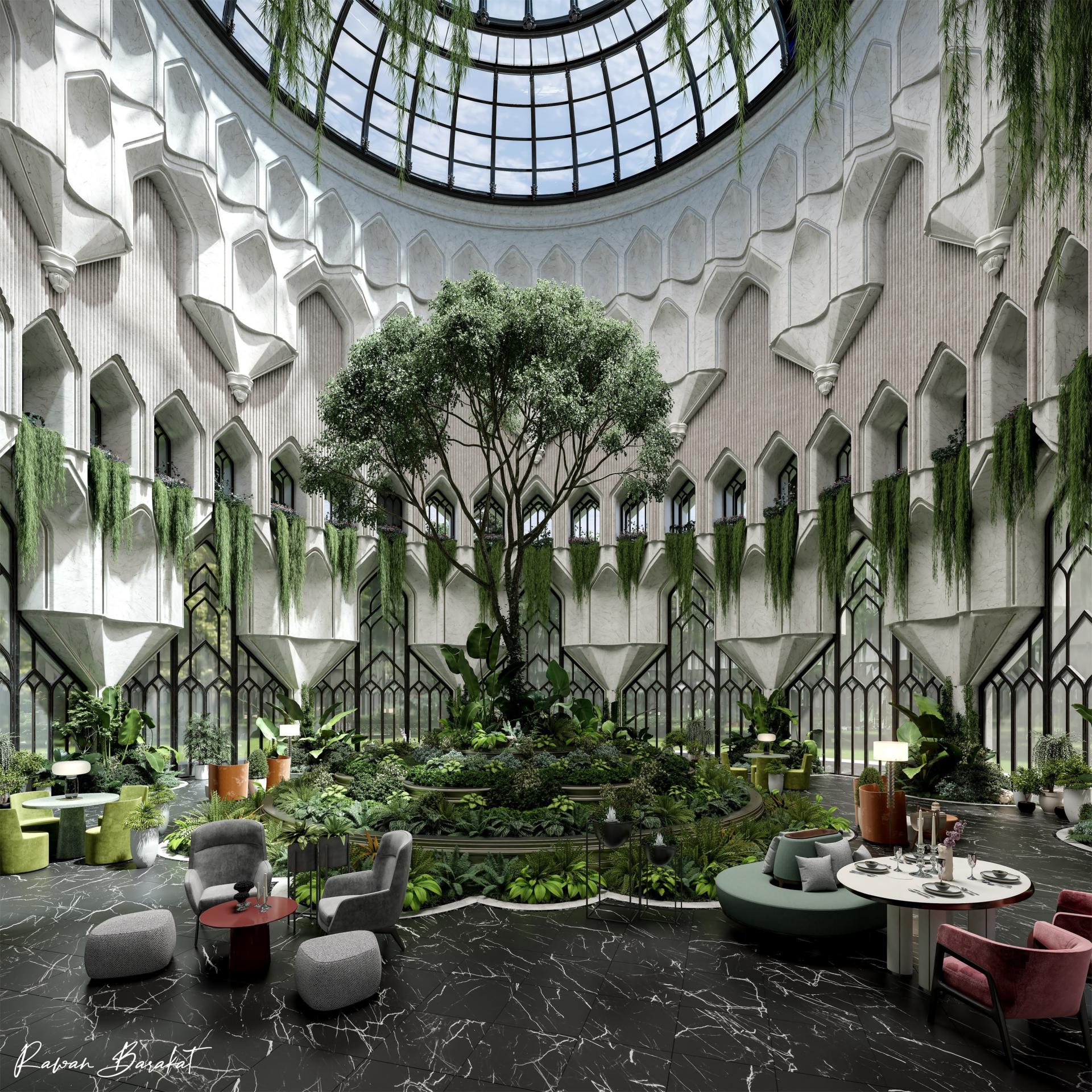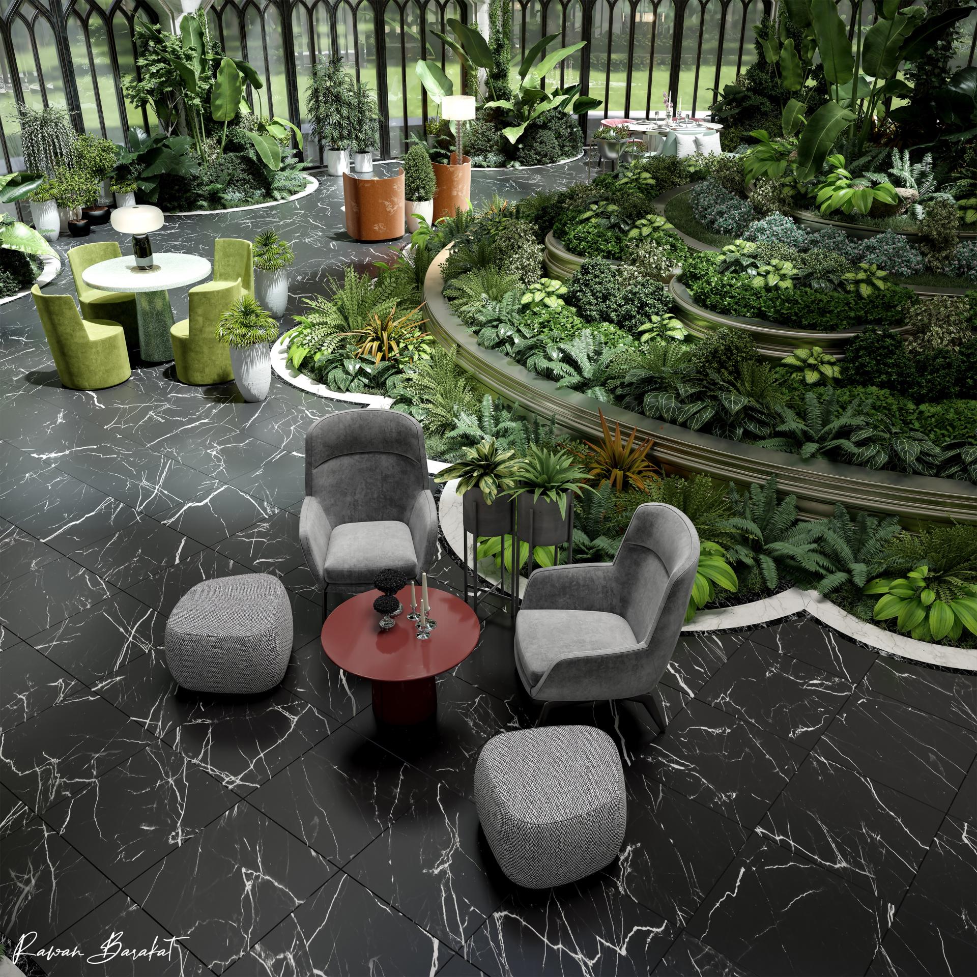 The sensory experience within the lounge is equally captivating. Natural light filters through the expansive glass ceiling during the day, while recessed and ambient lighting take over at night, ensuring a seamless transition between different atmospheres. The gentle rustling of leaves, the subtle fragrance of fresh greenery, and the cool, polished surface of the marble floors add to the multi-sensory richness of the space. More than just a place for social interaction, the lounge is a true retreat a perfect blend of nature and design, offering visitors a haven of calm, inspiration, and timeless beauty.