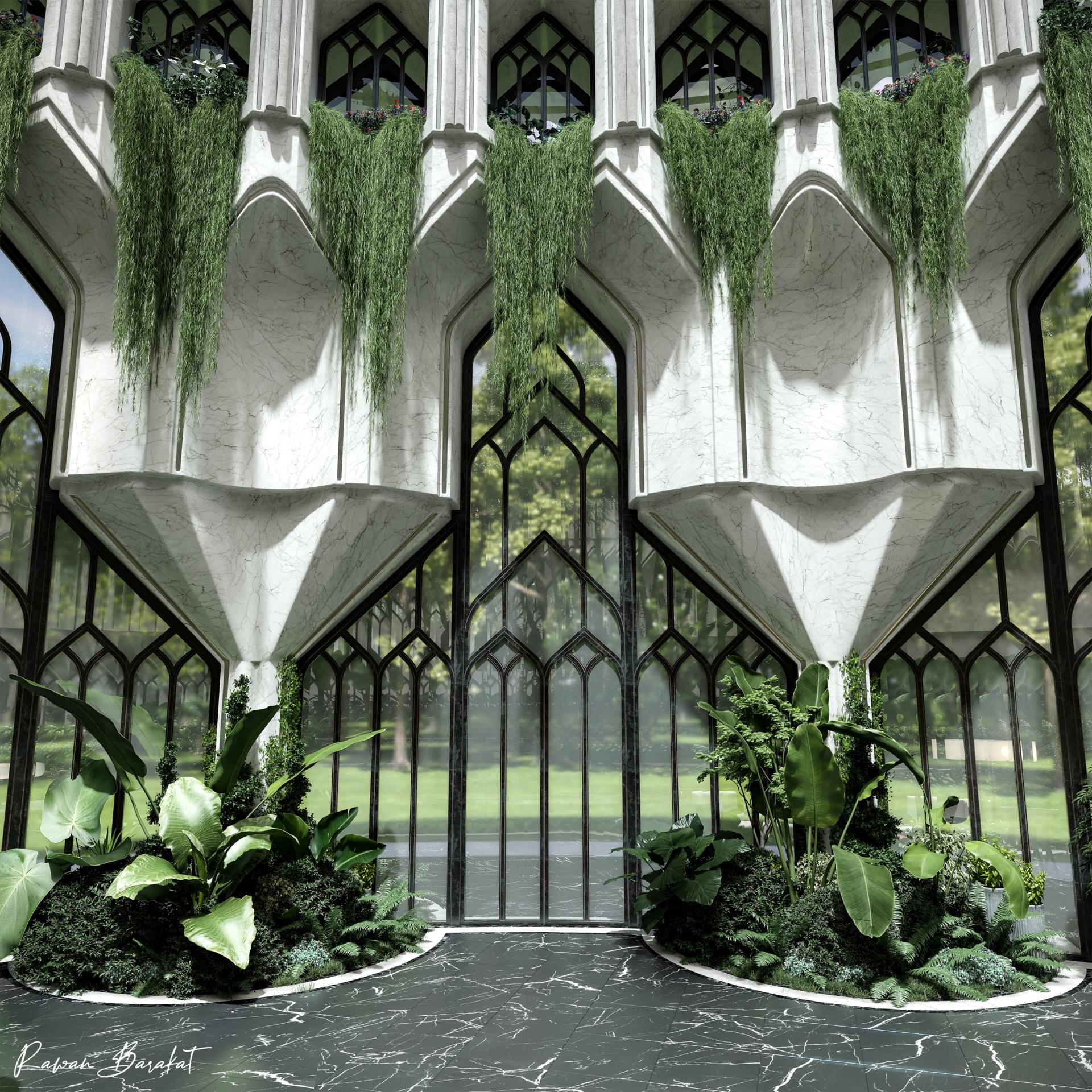 The lounge's design masterfully blends architectural elegance with natural elements, creating a space that is both breathtaking and welcoming. Towering geometric recesses on the walls establish a sense of rhythm and movement, while cascading greenery softens the structured forms, fostering a tranquil and immersive atmosphere. The fusion of solid marble surfaces with organic foliage blurs the boundaries between built and natural environments, transforming the lounge into a serene sanctuary rather than just a physical space. Every detail, from the sculptural walls to the lush vegetation, contributes to an experience that is both visually and emotionally enriching.