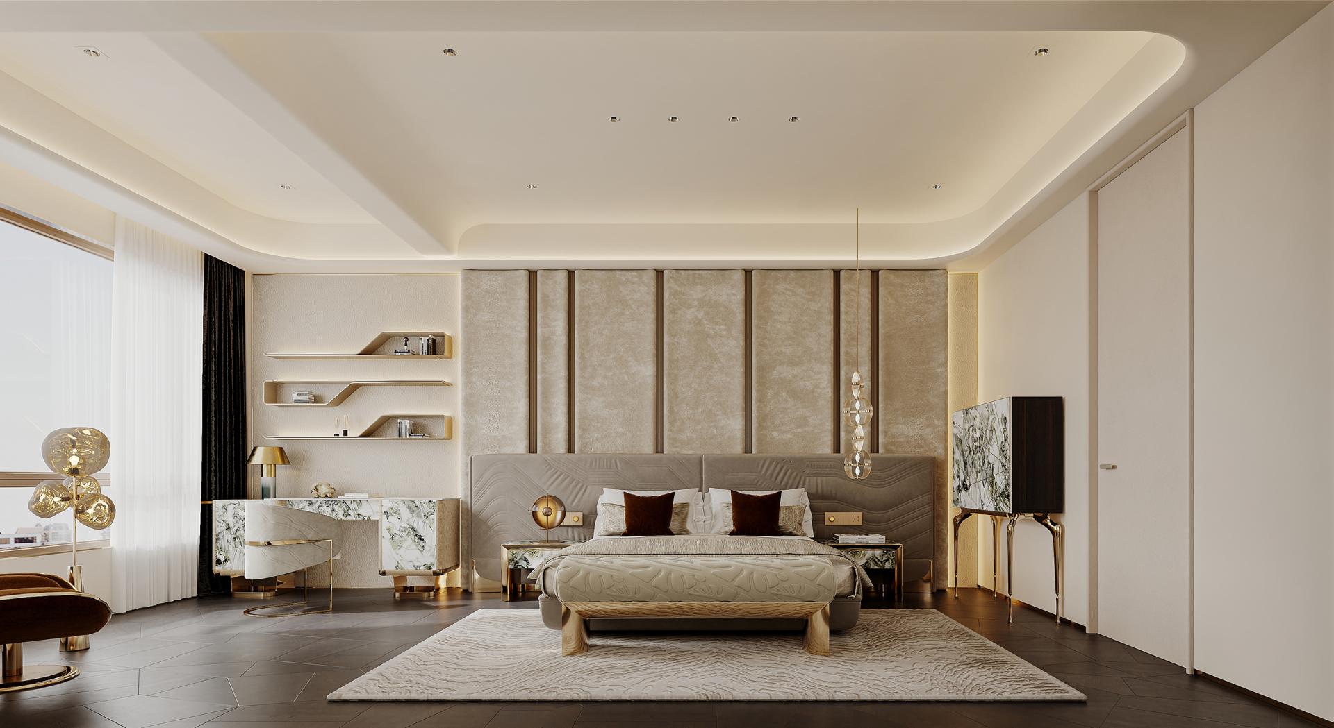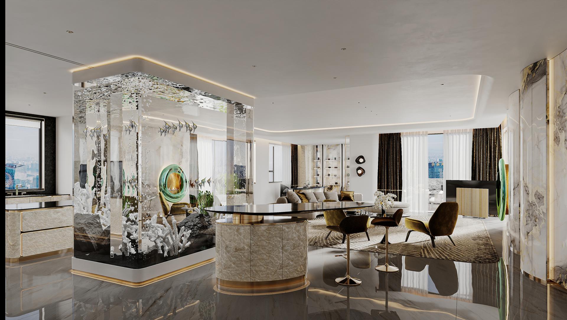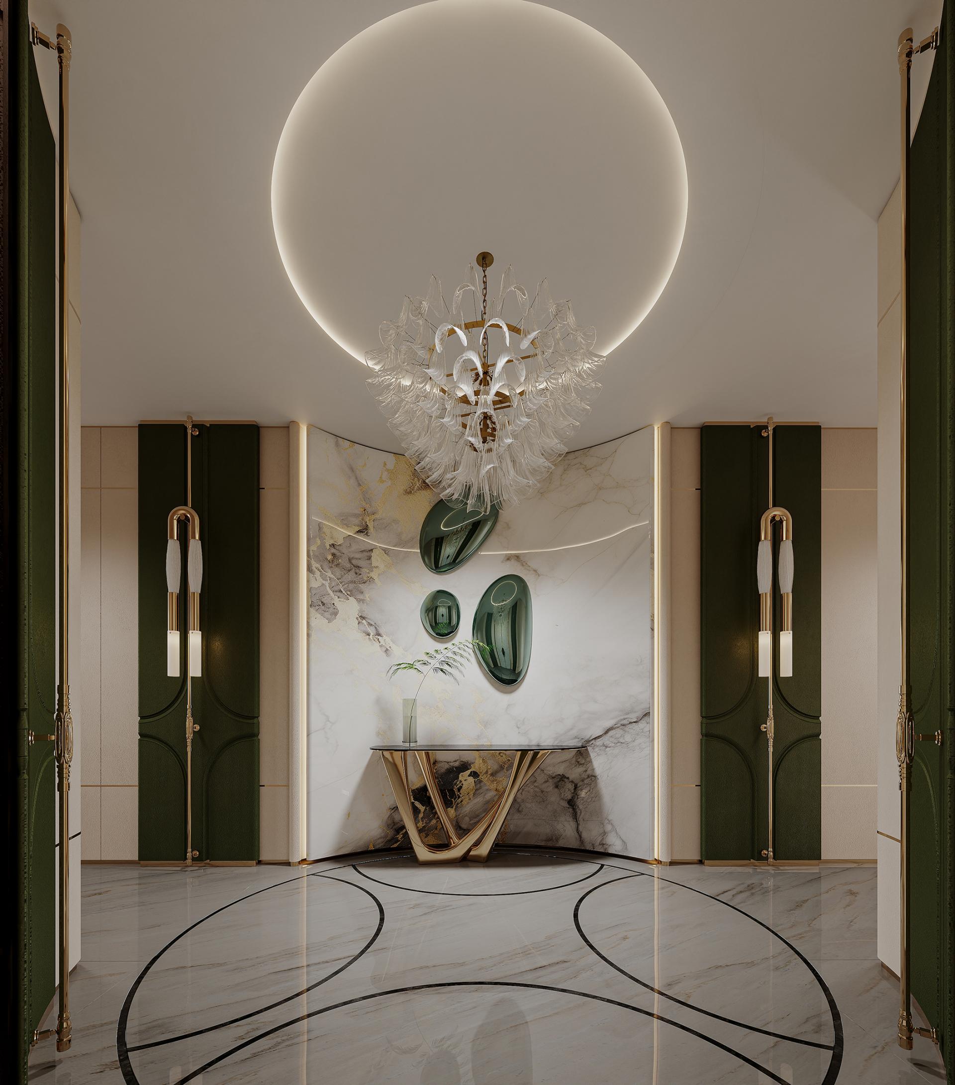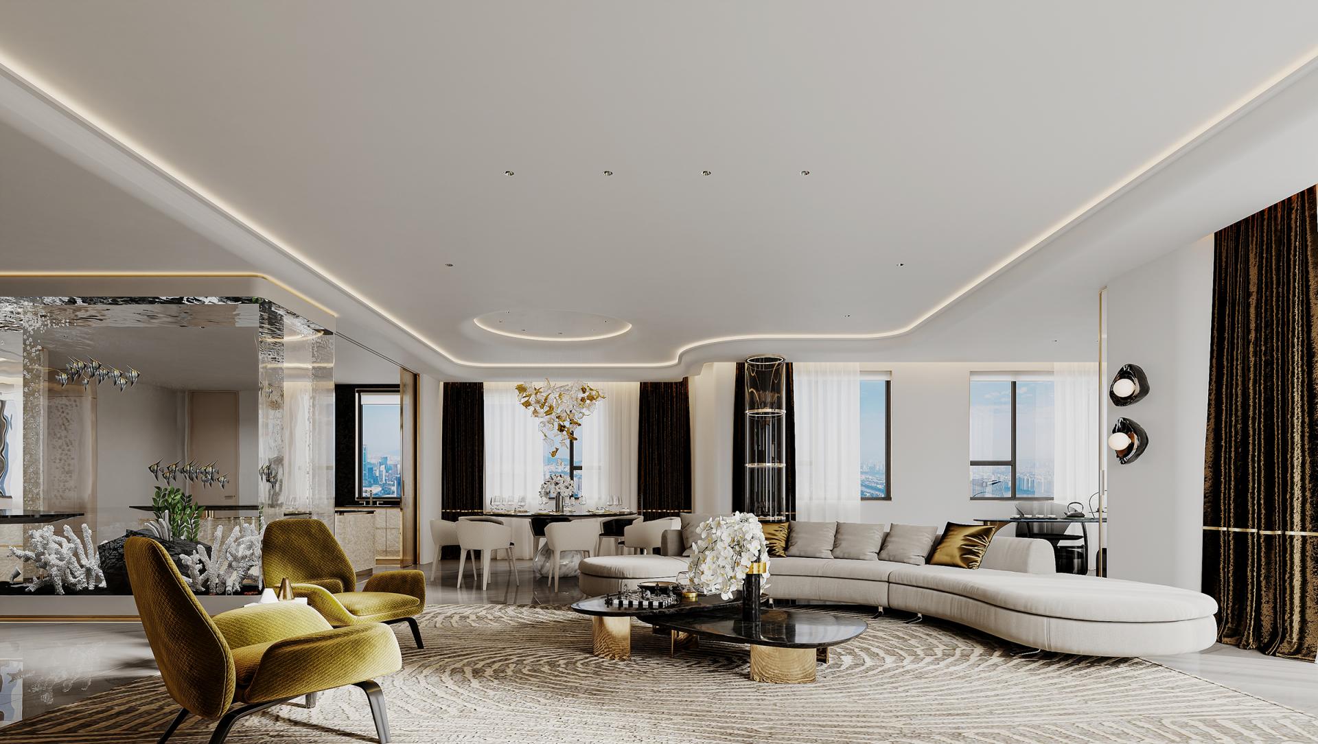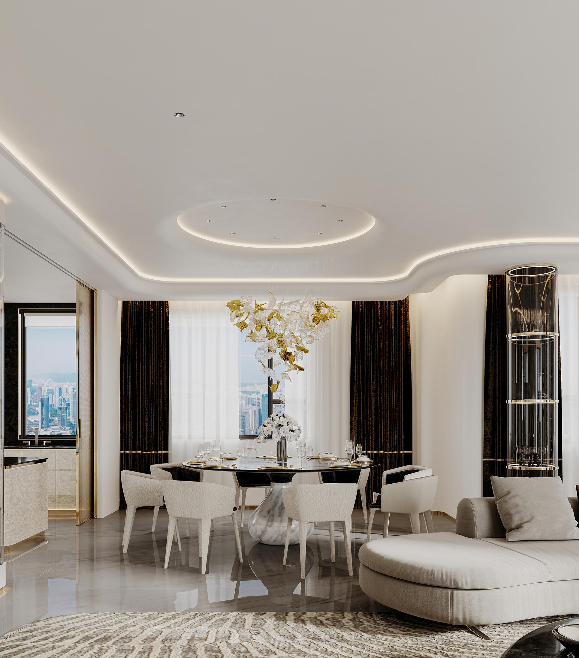 In the hustle and bustle of the city, the meaning of home has long gone beyond a simple residence to become a symbol of emotion, taste and lifestyle. With modern light luxury as the core design concept, "Rising Mountains" integrates nature, art, technology and living experience to create a high-end living space with both style and comfort. The entrance to the house, as the first scenery of the home, opens the prelude to life. Marble and metal elements complement each other, showing nobility and elegance, revealing low-key luxury in a simple atmosphere. The dark green door and wall form a rhythmic background, with golden lines, forming a spatial level with great visual tension. As the finishing touch, the crystal chandelier further sublimates the texture of the space with a bright and crystal light, making the journey home full of rituals. The overall color palette is based on white and gray, with gold accents in between, which is just the right interpretation of understated luxury. Sit around the living room, watch the natural texture of marble spread out picturesquely, feel the delicate care brought by the warm touch of leather, and the natural light is reflected in the mirror, making the whole space shine. The design of "Rising Mountains" is not only a shaping of space, but also a proposal for a way of life. From the façade of the building to the light and shadow of the living room, from the quiet and warm comfort of the bedroom to the warm and elegant kitchen, every inch of space has been carefully considered. The designer takes "de-complexity and simplification" as the core, shows ingenuity in the details, and highlights the taste in the material, so that every design becomes an elegant interpretation of modern light luxury. It is not only a container for home, but also a unique attitude to life.