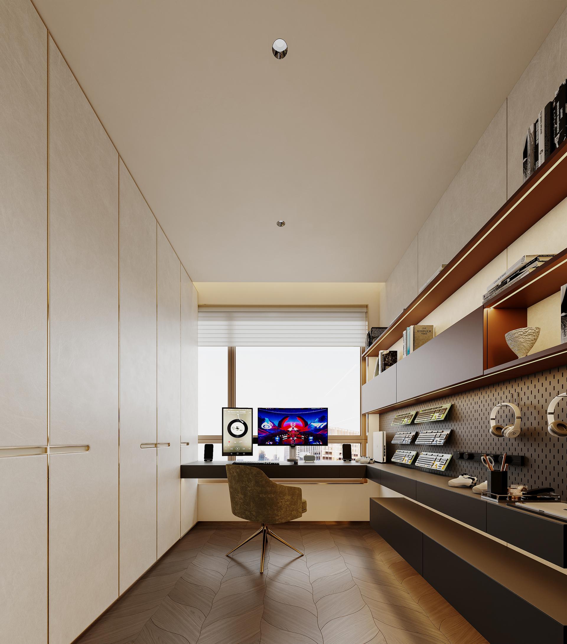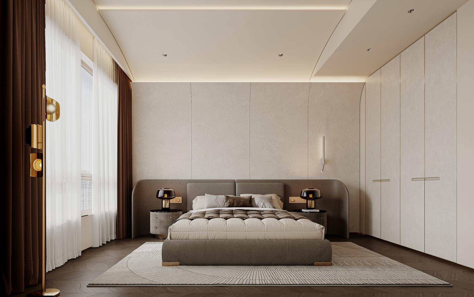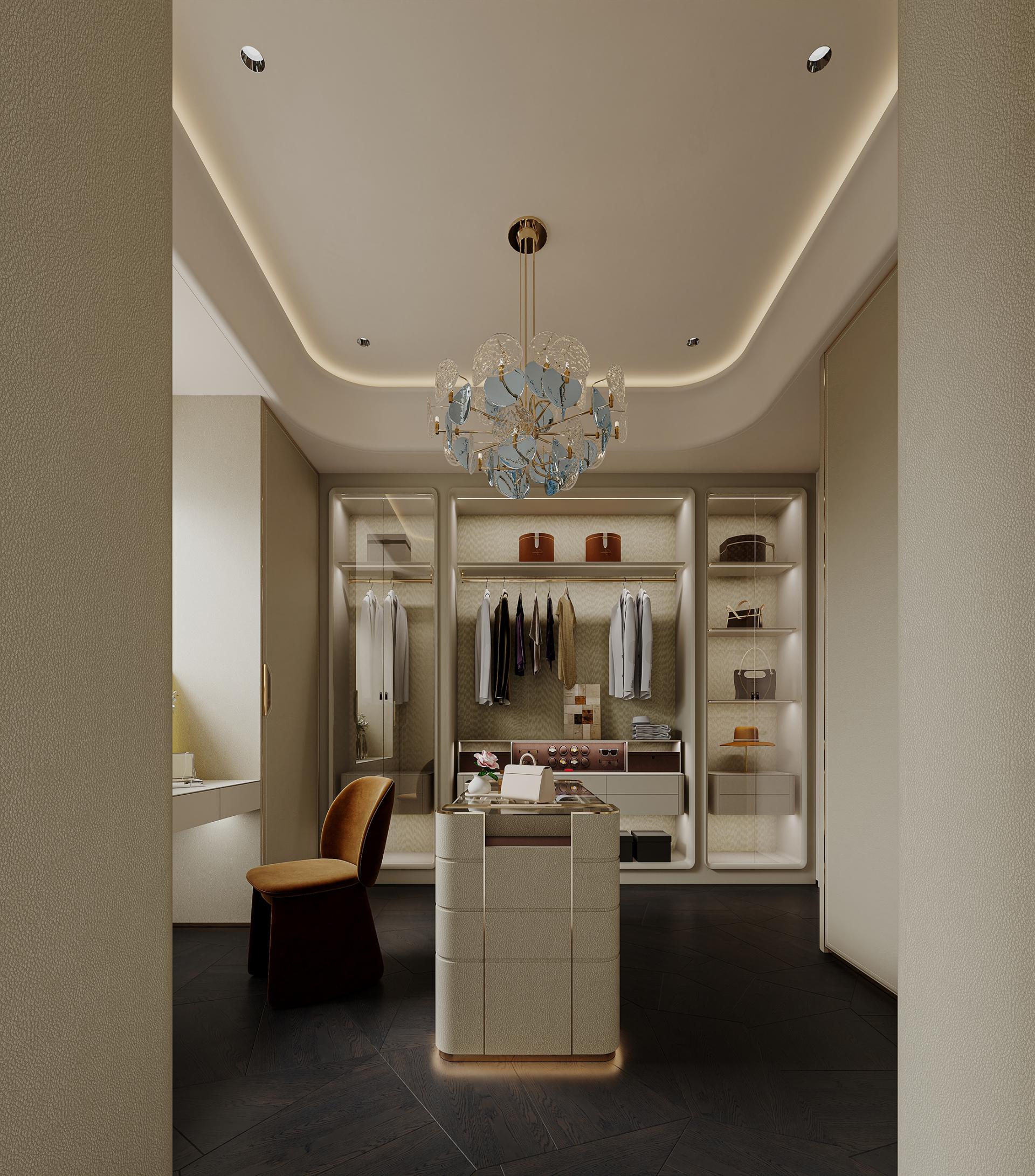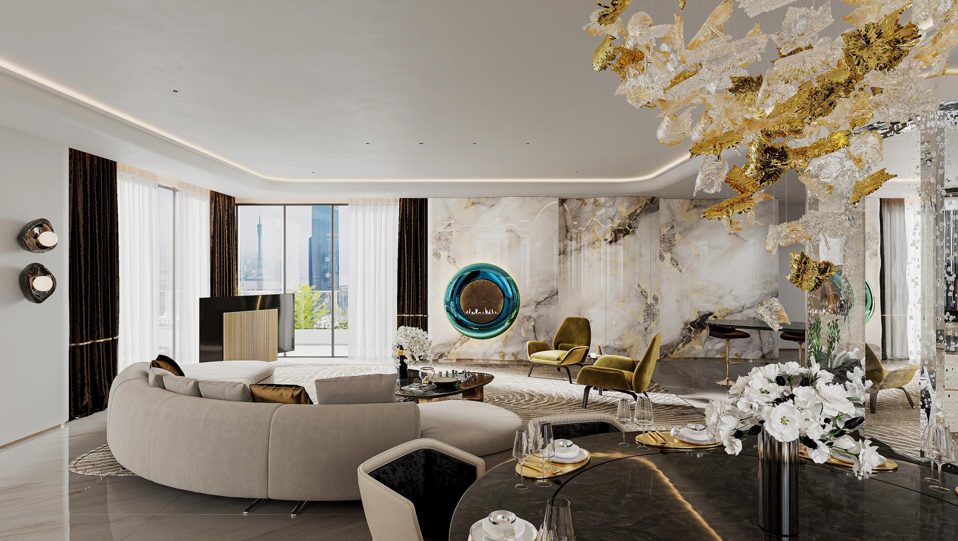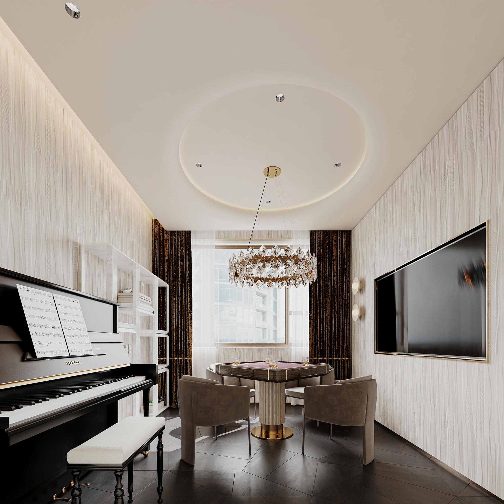 In the hustle and bustle of the city, the meaning of home has long gone beyond a simple residence to become a symbol of emotion, taste and lifestyle. With modern light luxury as the core design concept, "Rising Mountains" integrates nature, art, technology and living experience to create a high-end living space with both style and comfort. The entrance to the house, as the first scenery of the home, opens the prelude to life. Marble and metal elements complement each other, showing nobility and elegance, revealing low-key luxury in a simple atmosphere. The dark green door and wall form a rhythmic background, with golden lines, forming a spatial level with great visual tension. As the finishing touch, the crystal chandelier further sublimates the texture of the space with a bright and crystal light, making the journey home full of rituals. The overall color palette is based on white and gray, with gold accents in between, which is just the right interpretation of understated luxury. Sit around the living room, watch the natural texture of marble spread out picturesquely, feel the delicate care brought by the warm touch of leather, and the natural light is reflected in the mirror, making the whole space shine. The design of "Rising Mountains" is not only a shaping of space, but also a proposal for a way of life. From the façade of the building to the light and shadow of the living room, from the quiet and warm comfort of the bedroom to the warm and elegant kitchen, every inch of space has been carefully considered. The designer takes "de-complexity and simplification" as the core, shows ingenuity in the details, and highlights the taste in the material, so that every design becomes an elegant interpretation of modern light luxury. It is not only a container for home, but also a unique attitude to life.