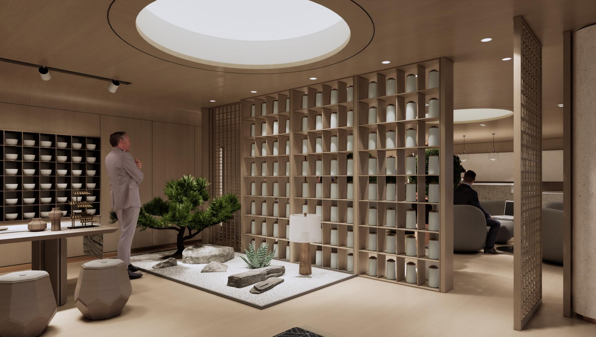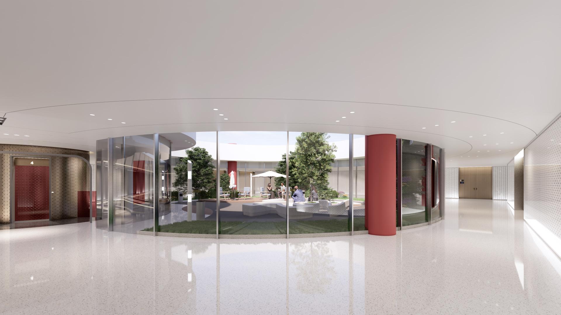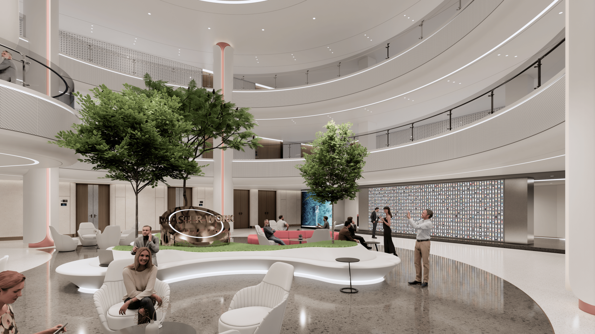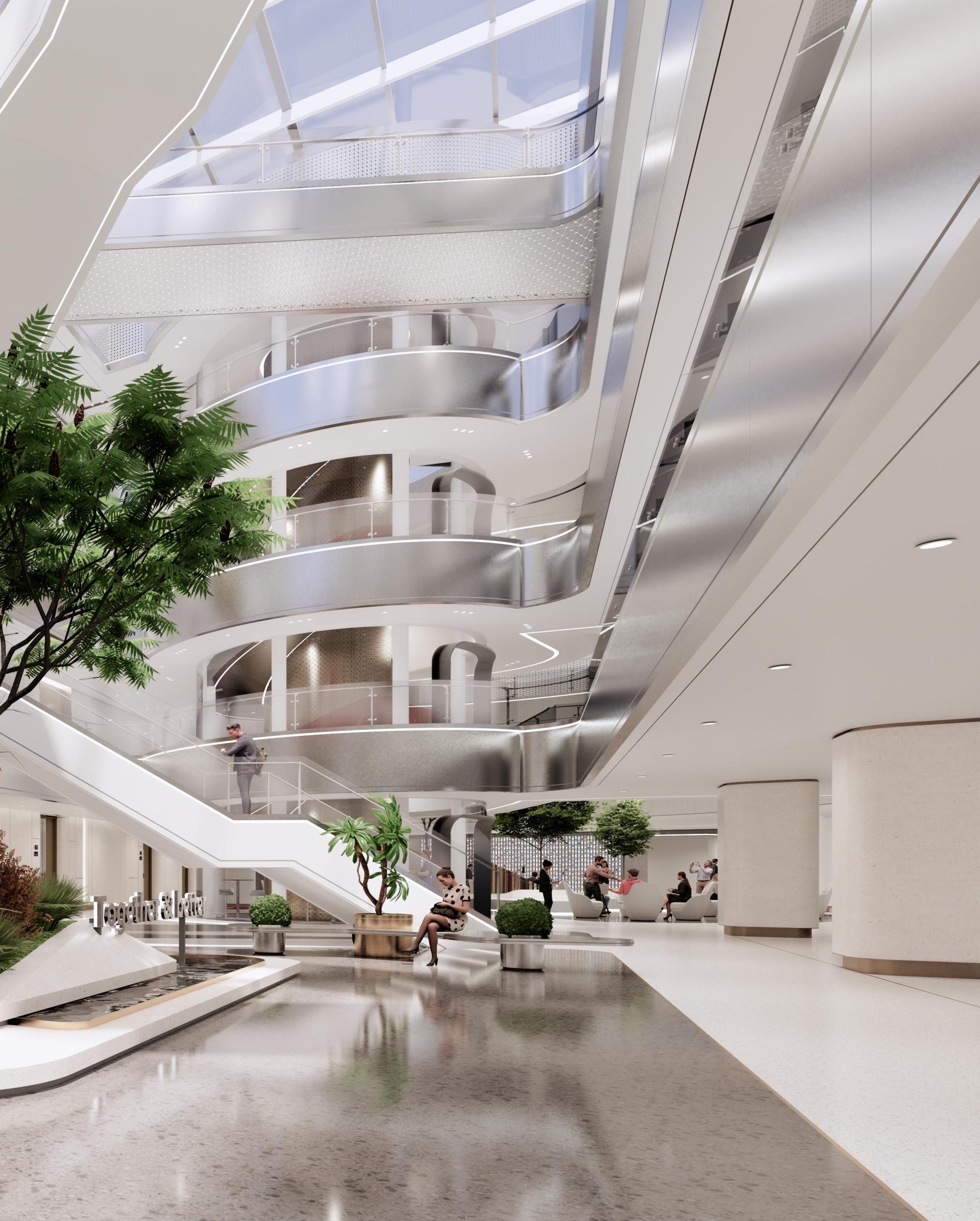 The design concept is guided by the principles of modern minimalism, natural symbiosis, and technological integration. The space is crafted to be open, transparent, and dynamic, fostering a sense of connectivity and fluidity. Upon entering the building, visitors are greeted by a spacious atrium that forms the heart of the interior layout. The suspended staircase gracefully ascends through the space, while ring-shaped corridors on each floor enhance visual depth and establish a sense of continuity. This central atrium acts as a vibrant focal point, seamlessly connecting various functional areas and encouraging movement and interaction.