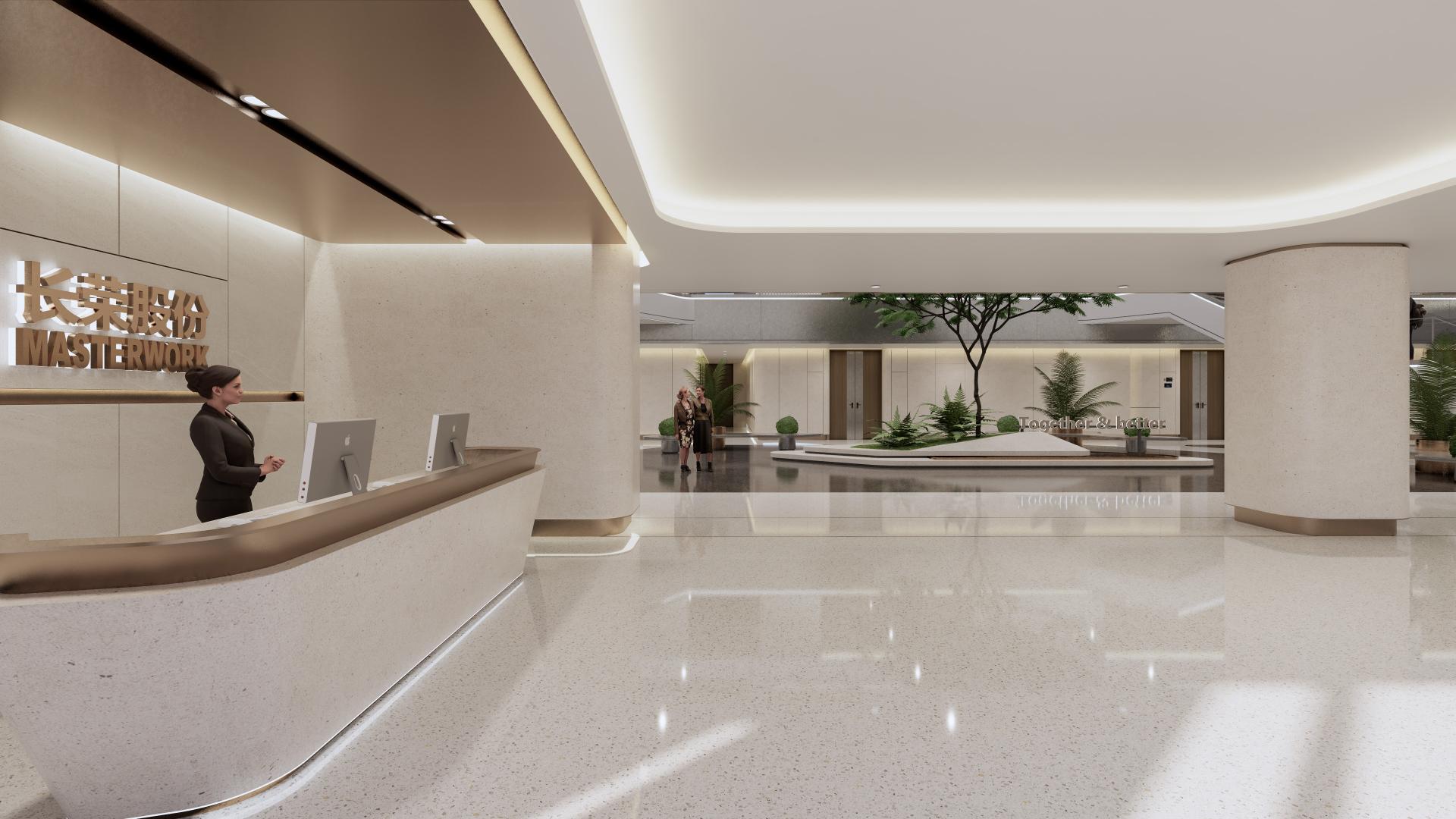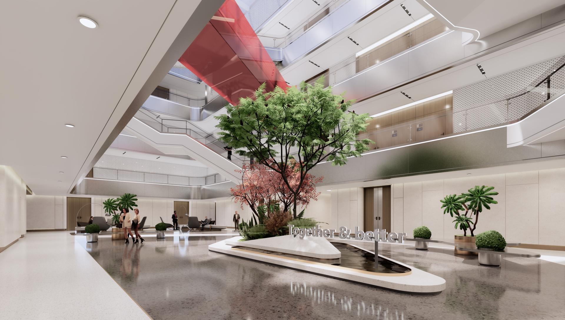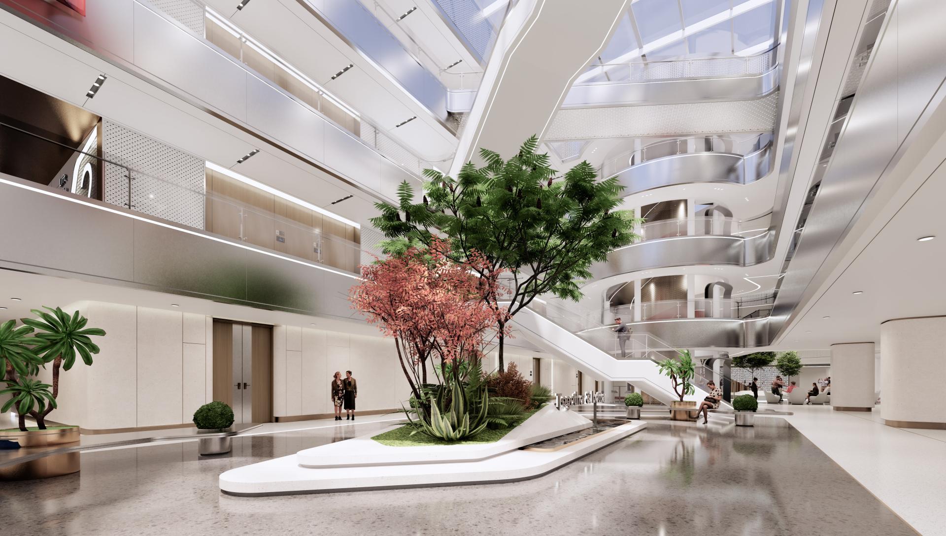 Anchoring the atrium is a lush green island, thoughtfully combined with water features to introduce an ecological dimension to the workspace. This harmonious blend of greenery and natural elements creates a calming, inviting atmosphere that softens the industrial character of the building. The choice of clean architectural lines, glass partitions, and metallic accents reflects a futuristic aesthetic, while concealed lighting and skylights cast a gentle, ambient glow, reinforcing a sense of warmth and modern sophistication.