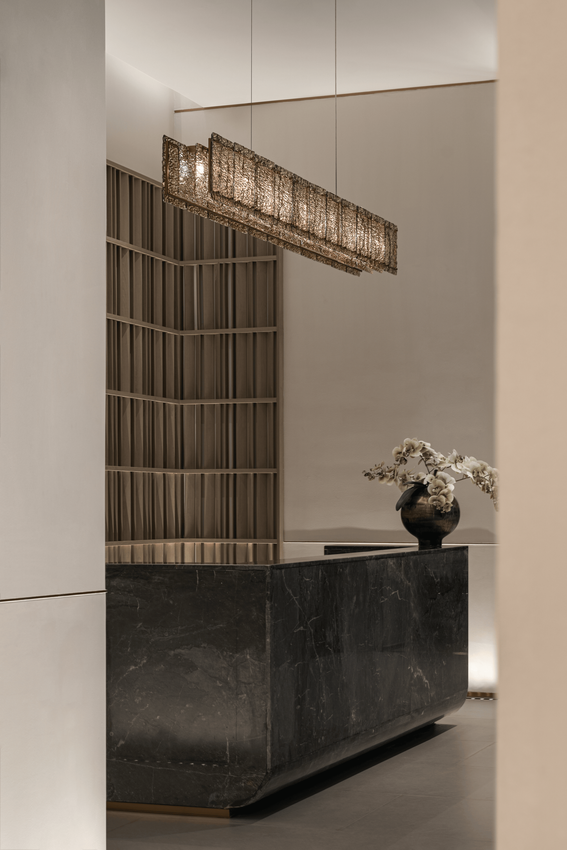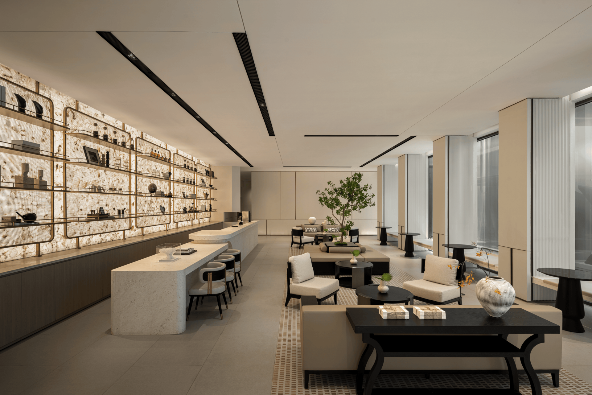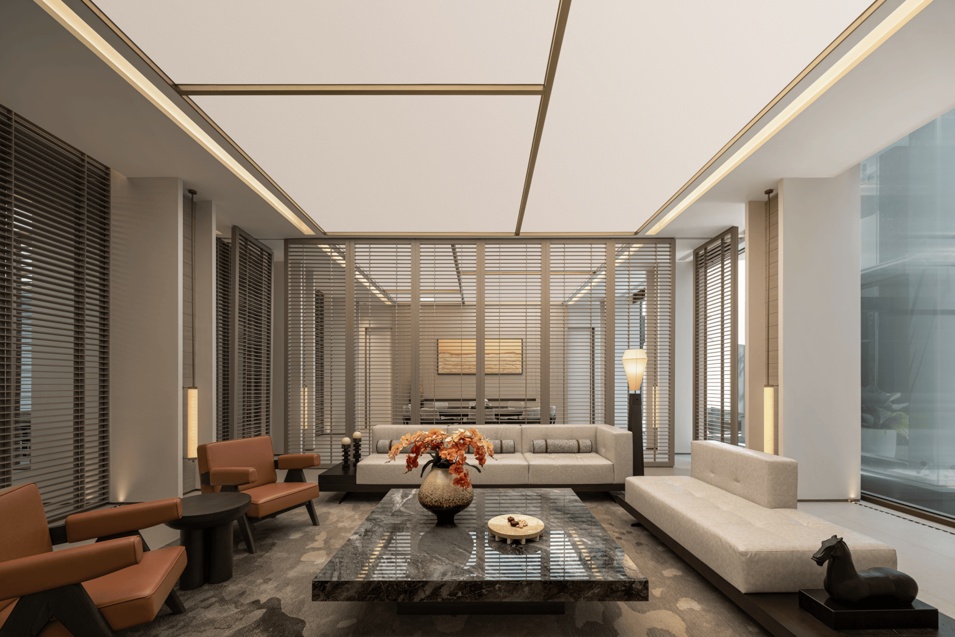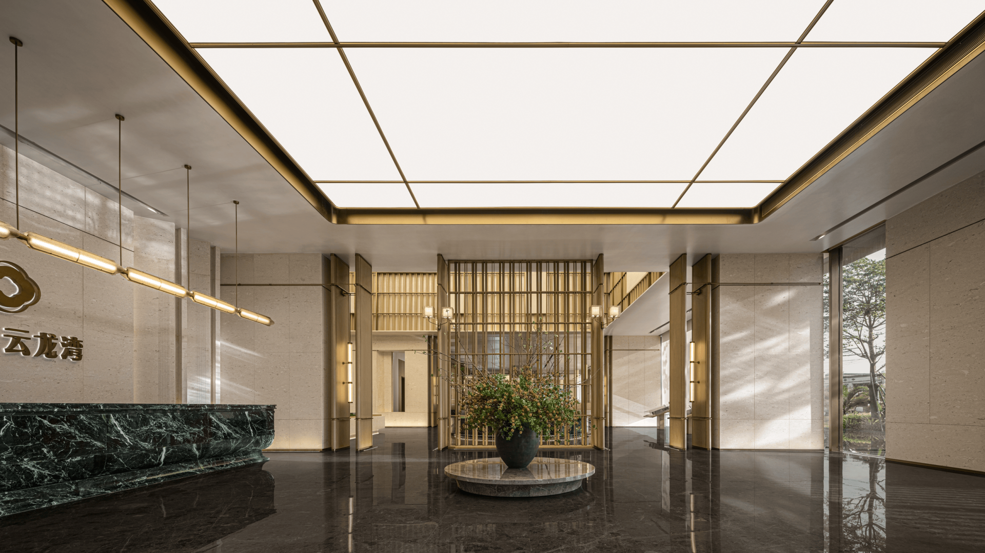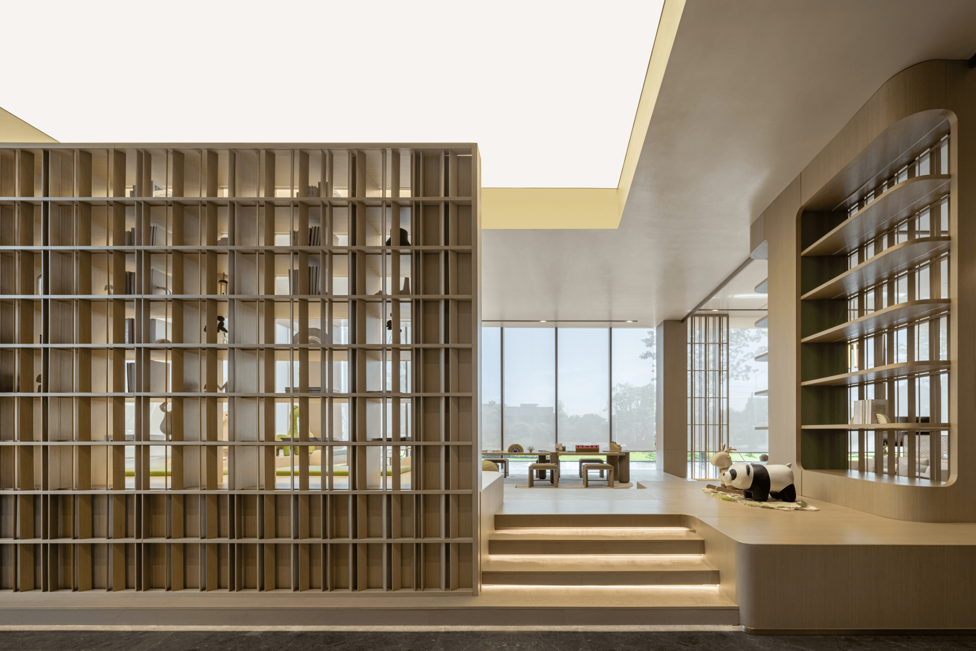 The marketing center also serves as a neighborhood hub for the community, featuring various spaces such as a themed activity area, a semi-outdoor swimming pool, a yoga gym, a café, and a private banquet center. These configurations not only cater to diverse functional needs but also impart a sense of ritual to daily life. The interior design echoes the architectural features, presenting a minimalist, modern, fashionable, and avant-garde aesthetic. The wooden grilles in the display area convey a sense of order, complemented by details of bronze metal and green stone, creating a low-key yet restrained elegance.