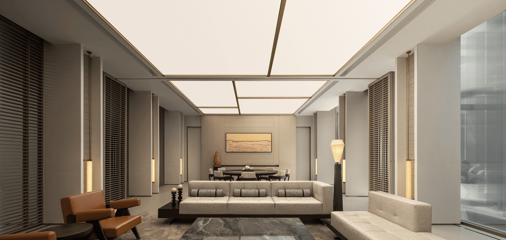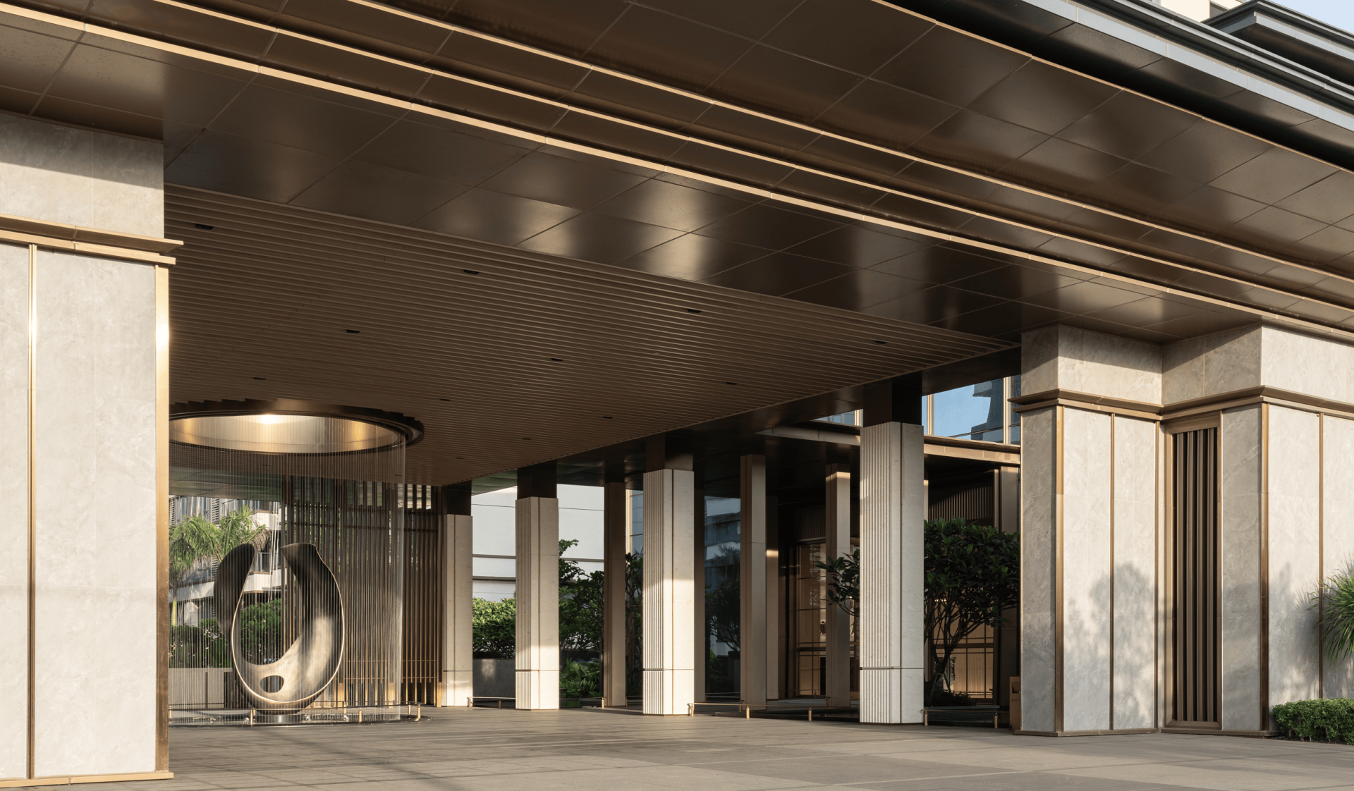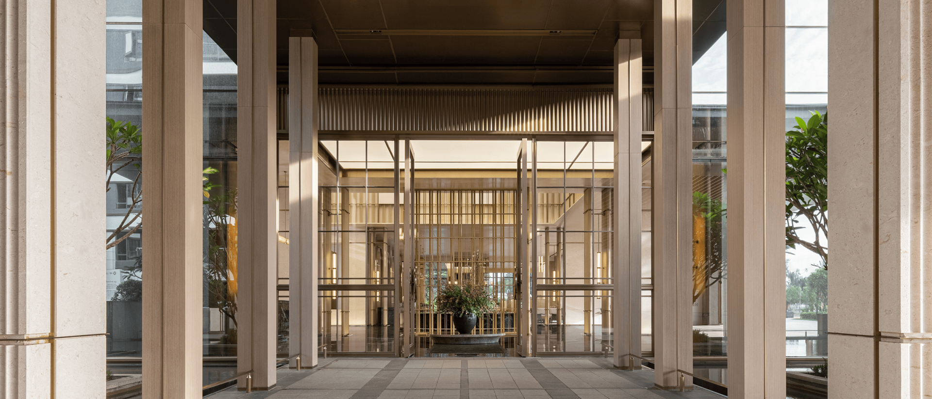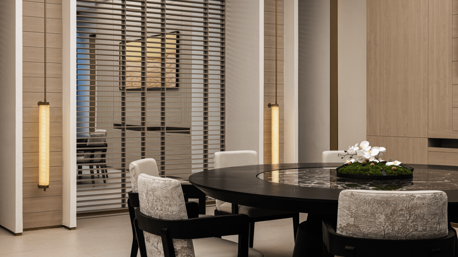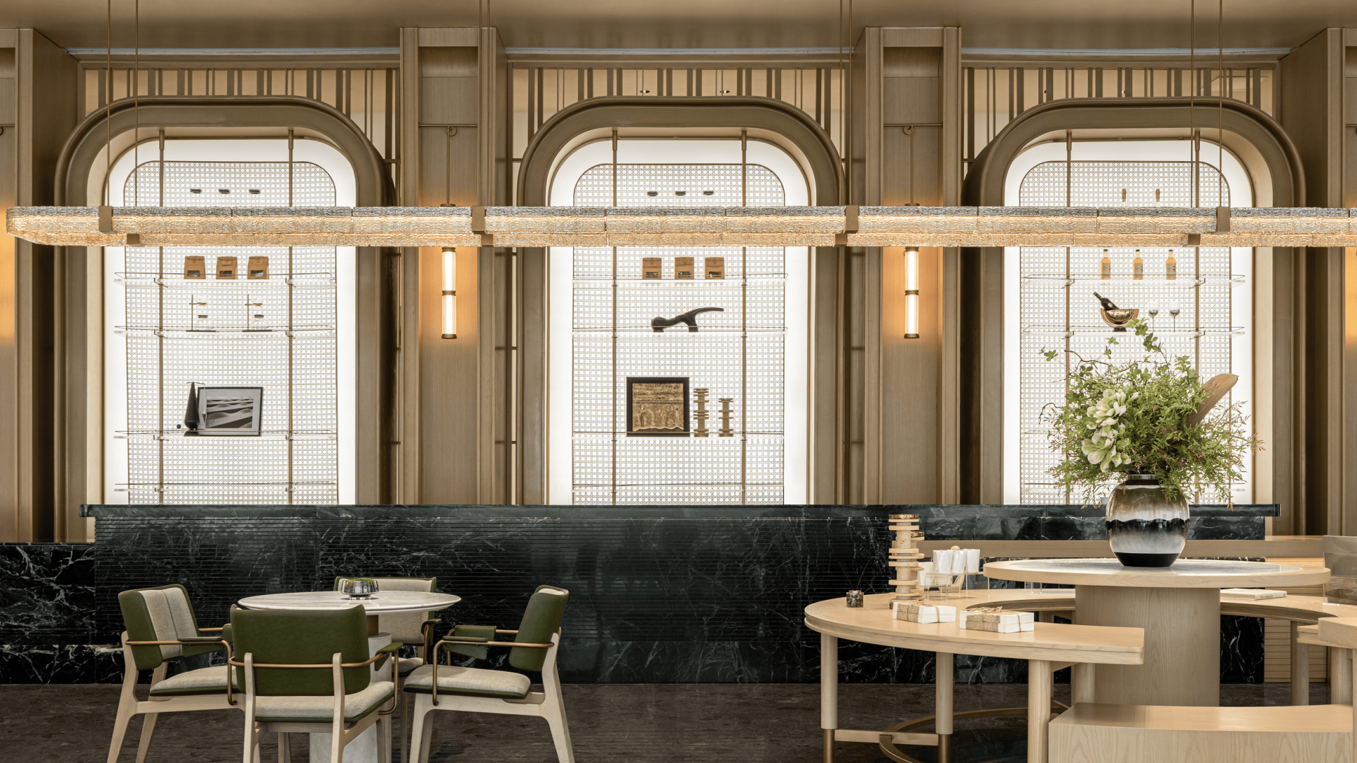 The marketing center also serves as a neighborhood hub for the community, featuring various spaces such as a themed activity area, a semi-outdoor swimming pool, a yoga gym, a café, and a private banquet center. These configurations not only cater to diverse functional needs but also impart a sense of ritual to daily life. The interior design echoes the architectural features, presenting a minimalist, modern, fashionable, and avant-garde aesthetic. The wooden grilles in the display area convey a sense of order, complemented by details of bronze metal and green stone, creating a low-key yet restrained elegance.