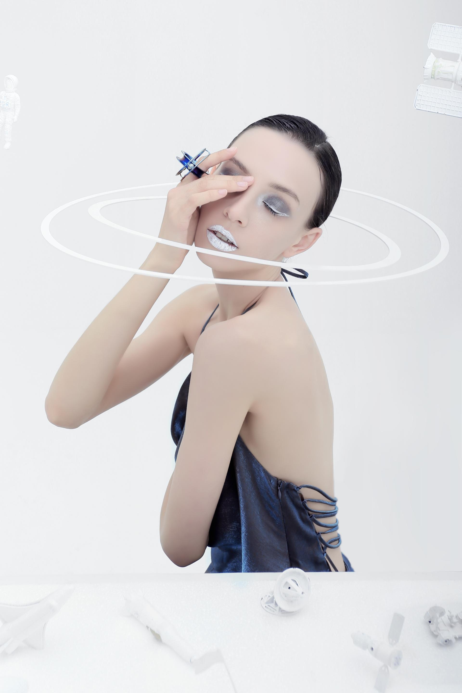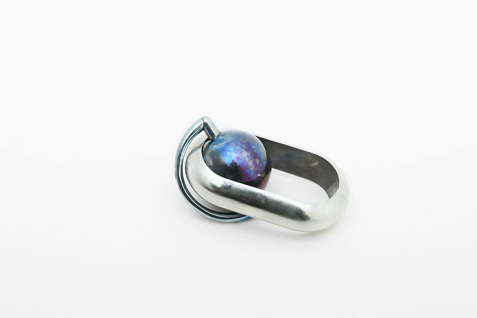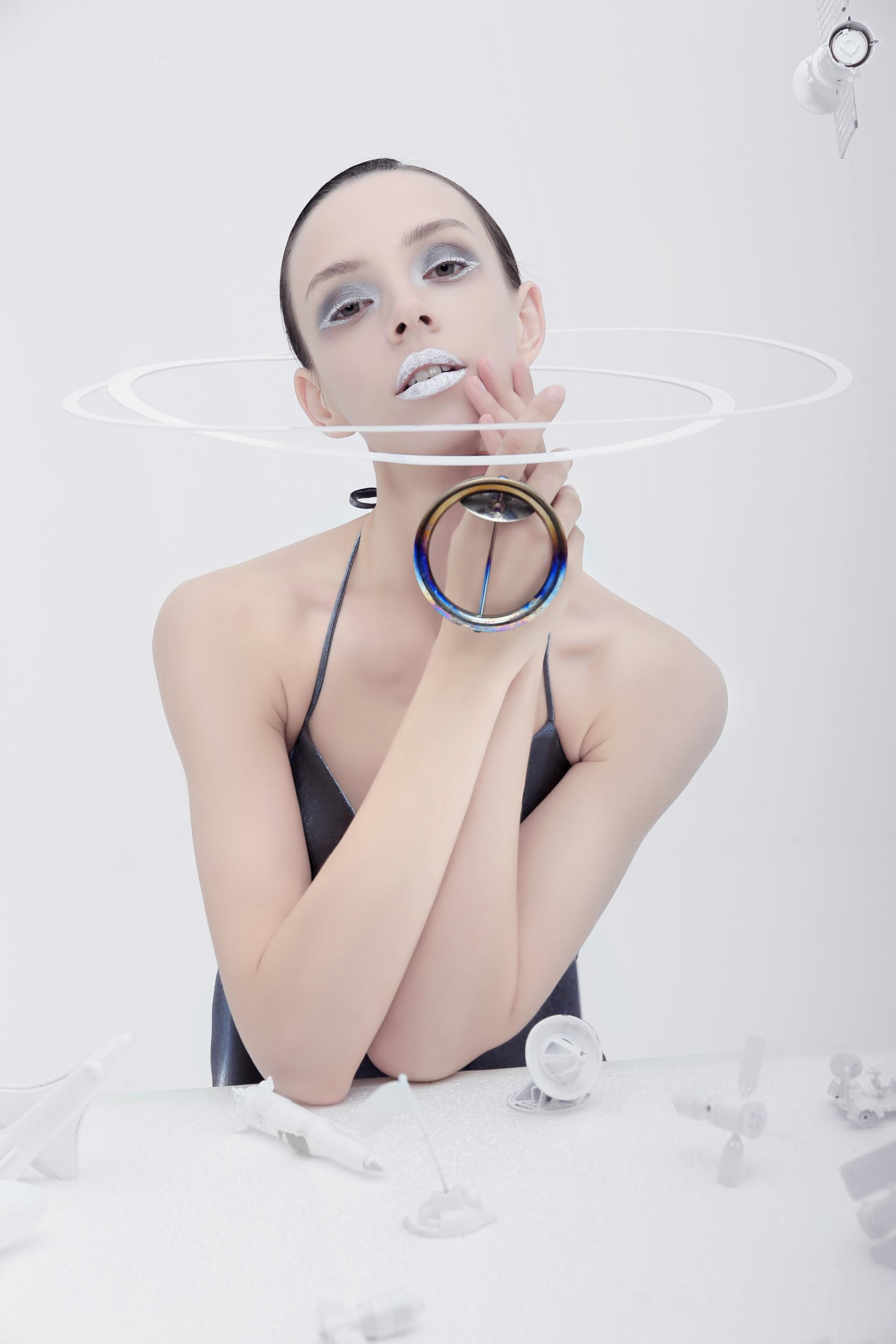 Inspired by celestial orbits, this piece explores the relationship between jewelry, motion, and the body. The act of wearing transforms the jewelry from a static object into a dynamic entity, generating invisible yet tangible trajectories. Perfect circles and spheres symbolize the idealized movement that rarely exists in reality, emphasizing the contrast between stillness and motion.