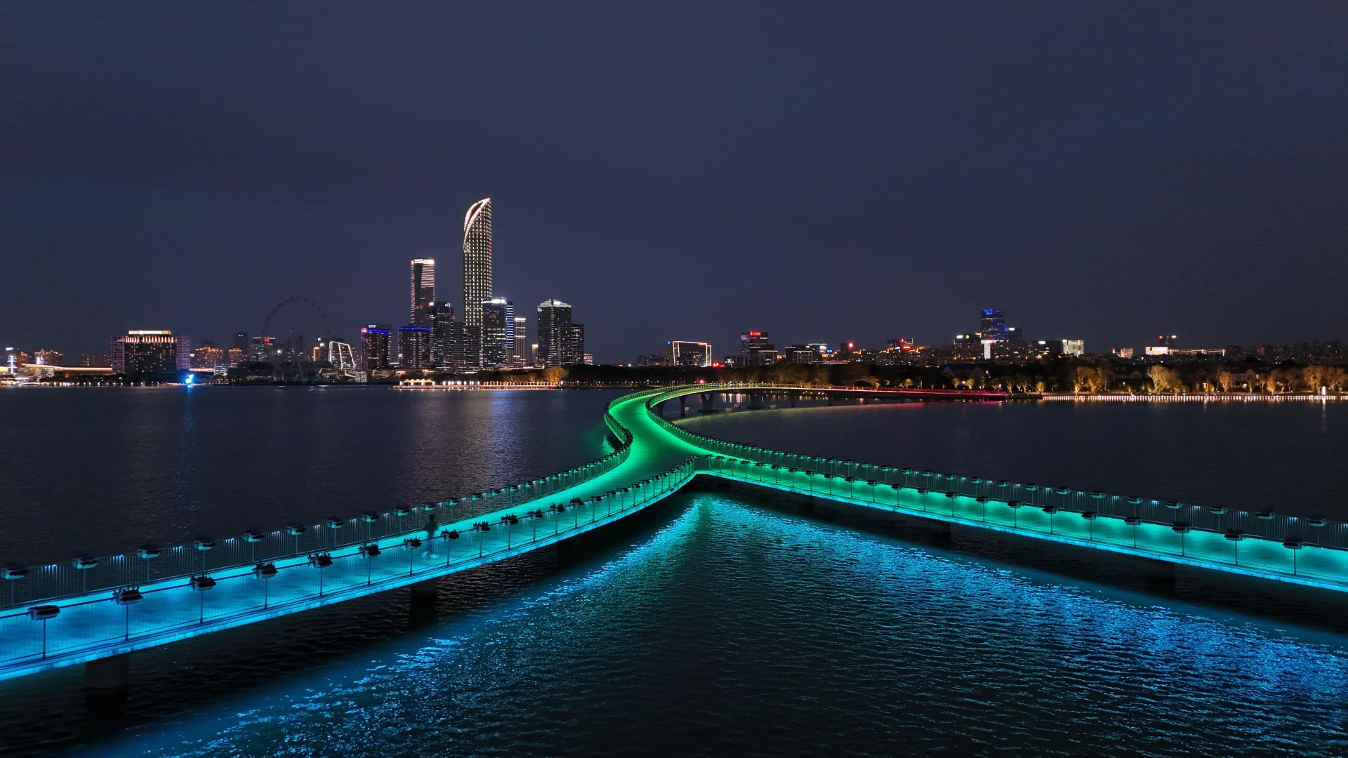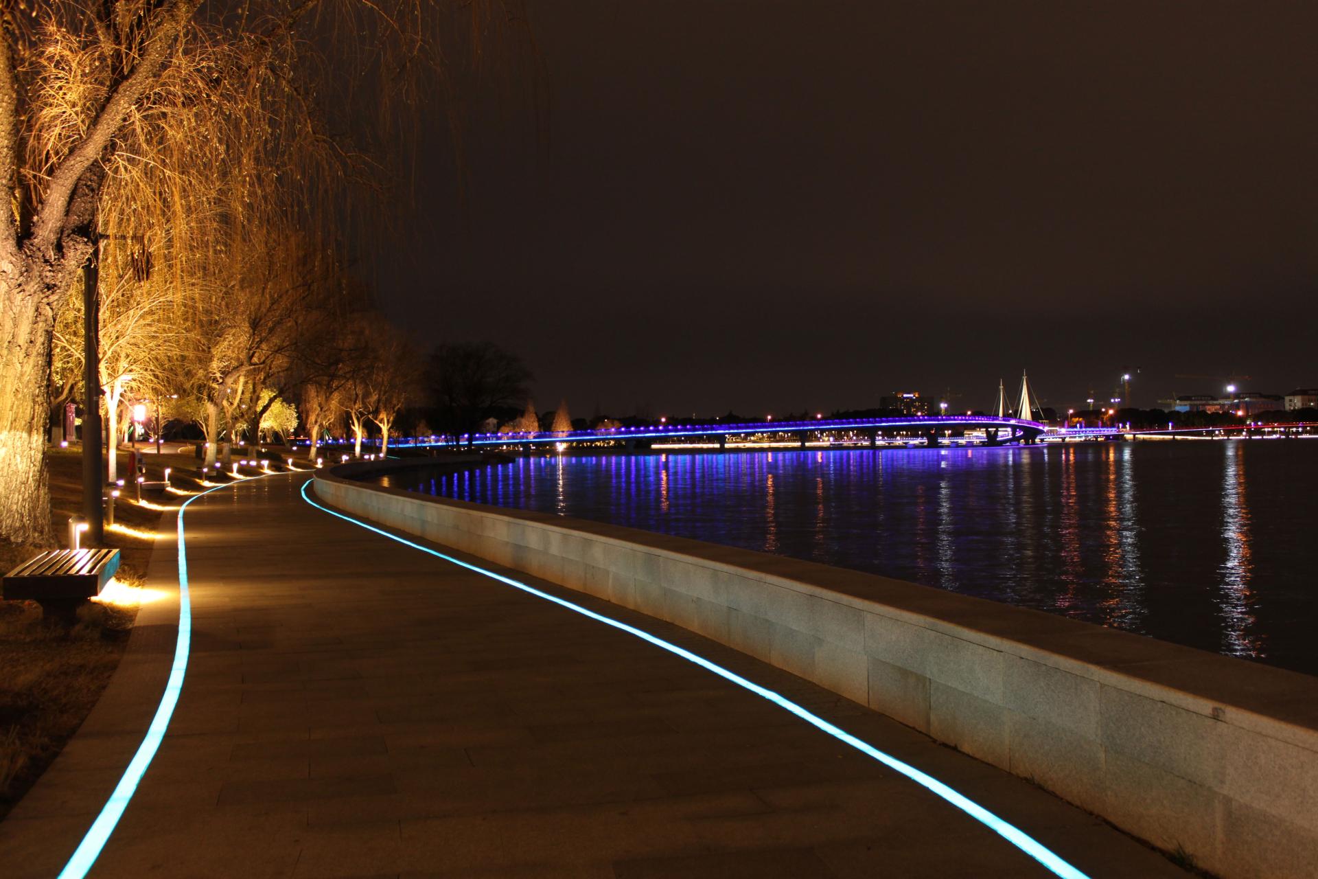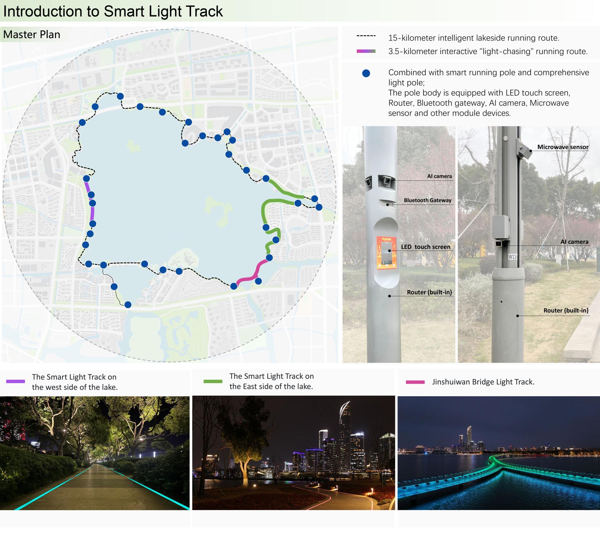 Taking the opportunity of the Jinji lakeside environmental improvement movement which belongs to the government-led urban micro-renewal project (planning and constructing the Landscape Greening Enhancement Project, integrated lighting poles and intelligent track lighting system), this project focuses on upgrading the lighting facilities and control system of overwater trestle bridge and pathways to create a continuous 15-kilometer intelligent lakeside running route and a 3.5-kilometer interactive "light-chasing" running path over water and shoreline.
