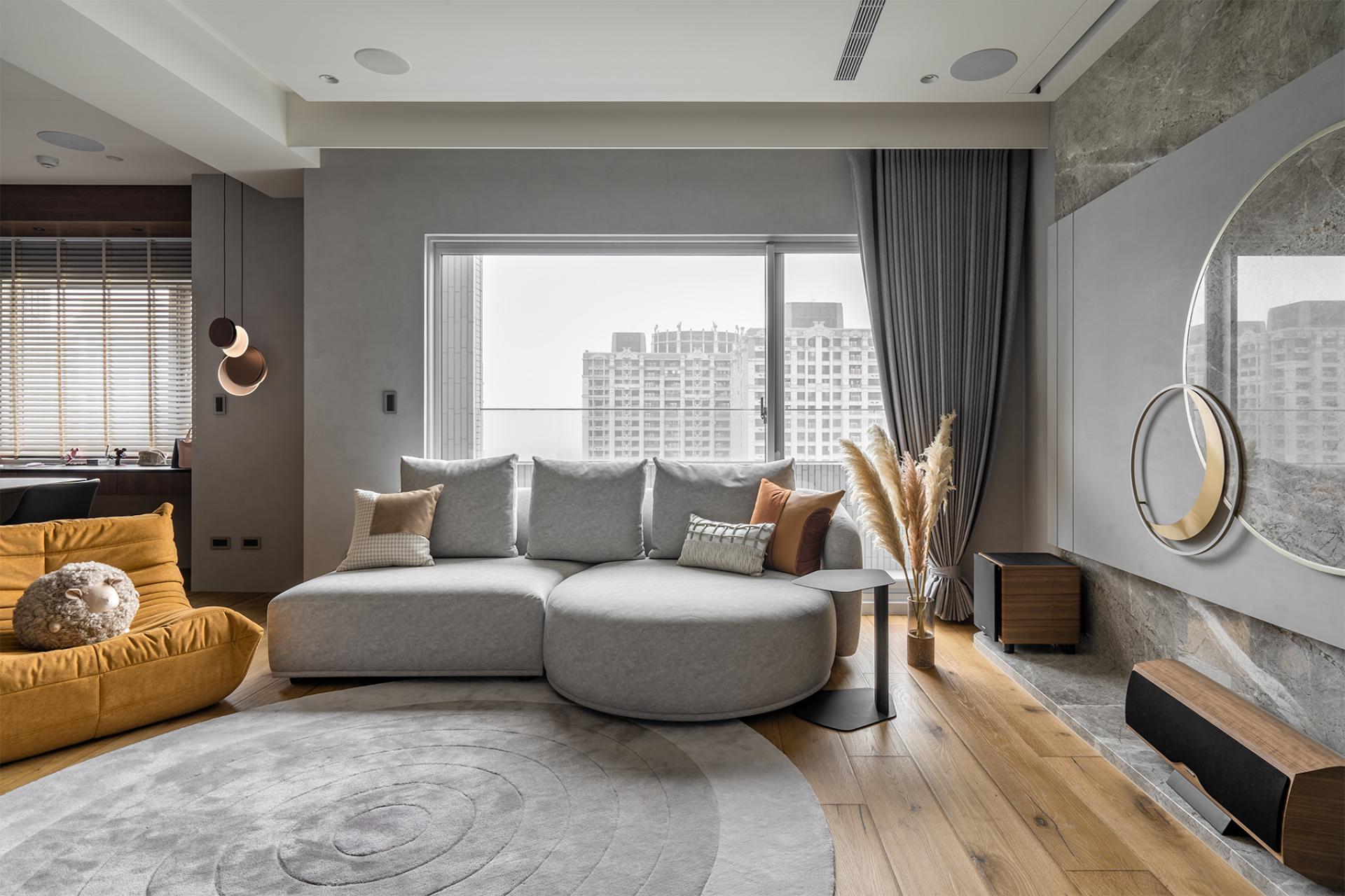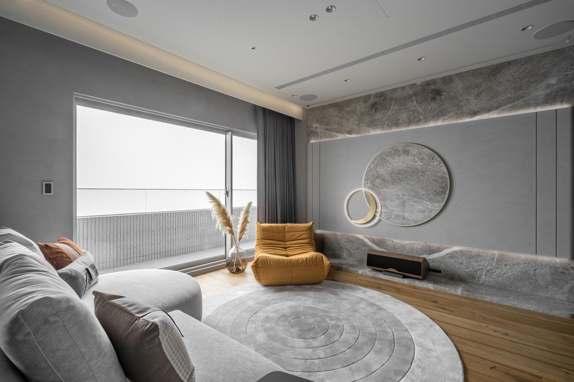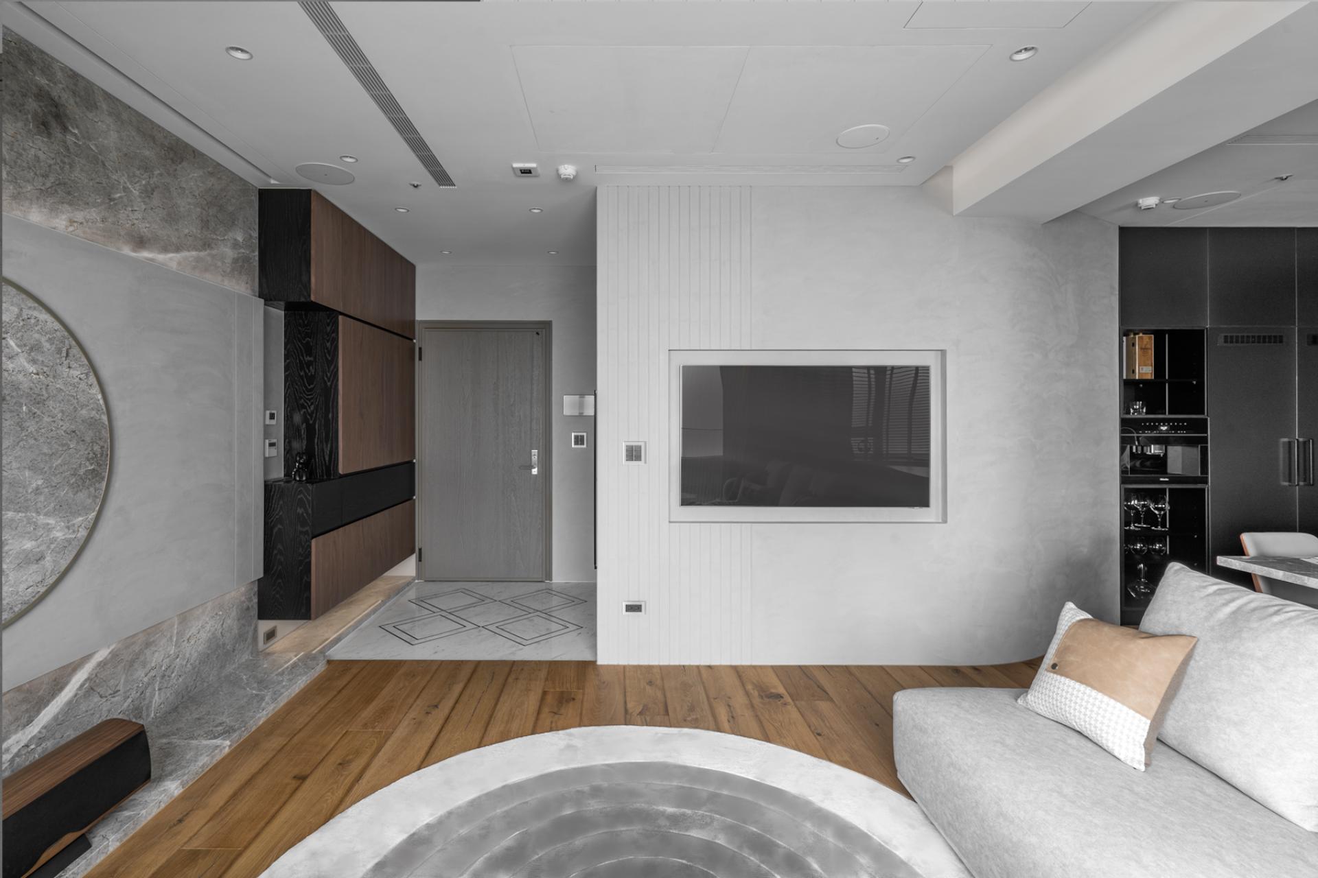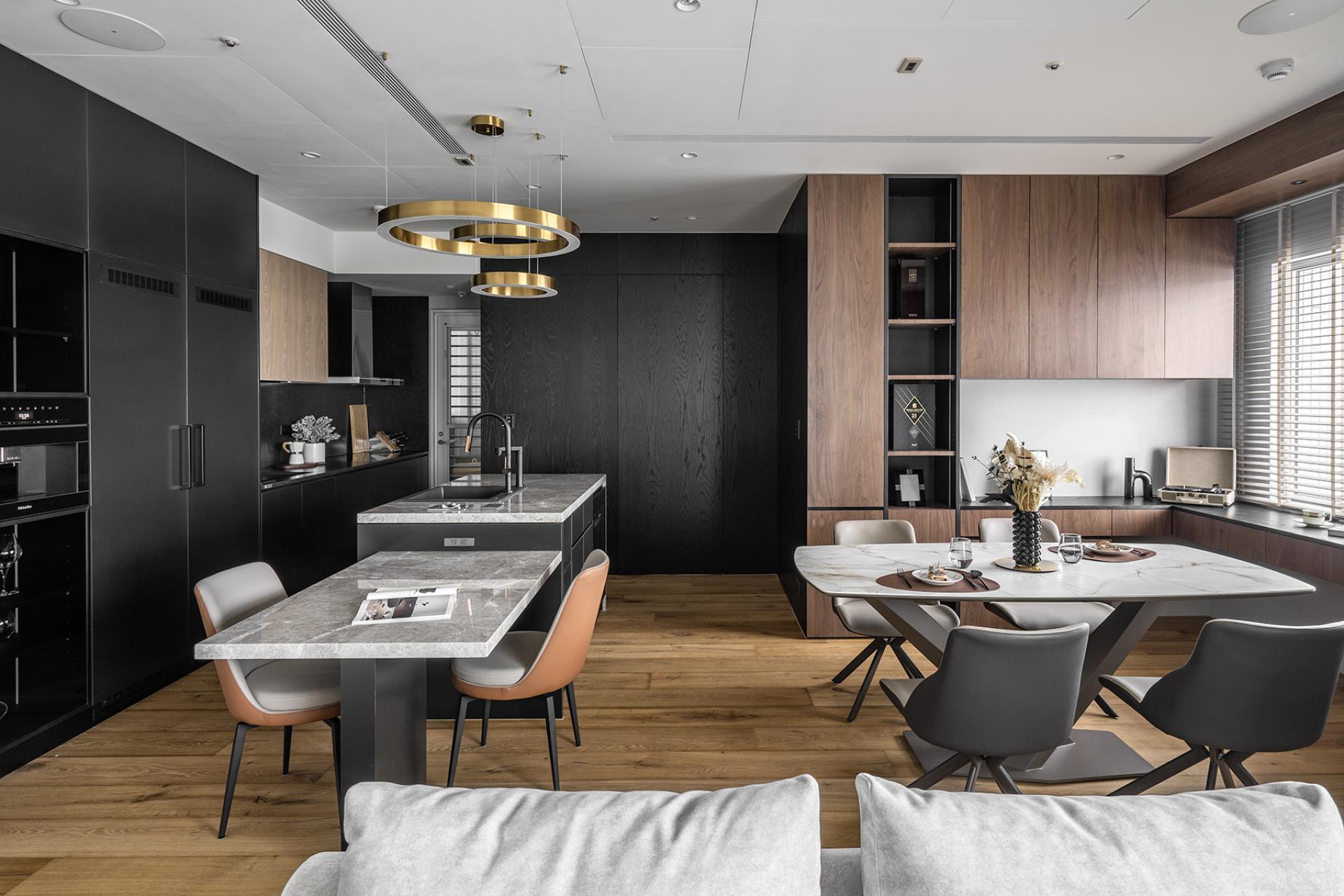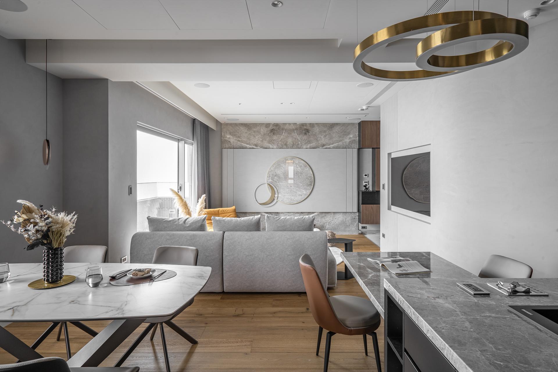 Draped in a luminous veil of moonlight, golden accents gleam like celestial dust, gracefully threading through the space in an artful homage to the auspicious symbol of Eight, imparting prosperity and blessings to every corner. The gentle interplay of warm-hued wood and finely textured greige stone cultivates an ambiance of quiet refinement, where understated luxury harmonizes with the rhythm of everyday life—an intimate sanctuary crafted for great enjoyment with meaningful grace.