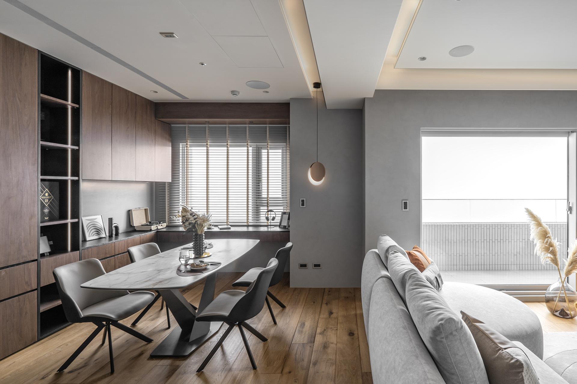 The designer tailored the space to complement the homeowners’ living habits. Brilliantly set up two distinct accent walls— a projector screen for immersive cinematic experiences and a refined media wall for television entertainment. Moreover, a versatile sofa offers effortless adaptability, allowing dynamic configurations to accommodate various needs. An extended island in the dining area provides additional seating, while the main dining table seamlessly transforms into a workspace—a thoughtful response to the evolving demands of remote work. These meticulously crafted spatial solutions ideally enhance flexibility and elevate everyday comfort and convenience, ensuring the home fluidly adapts to its inhabitants with ease and sophistication.