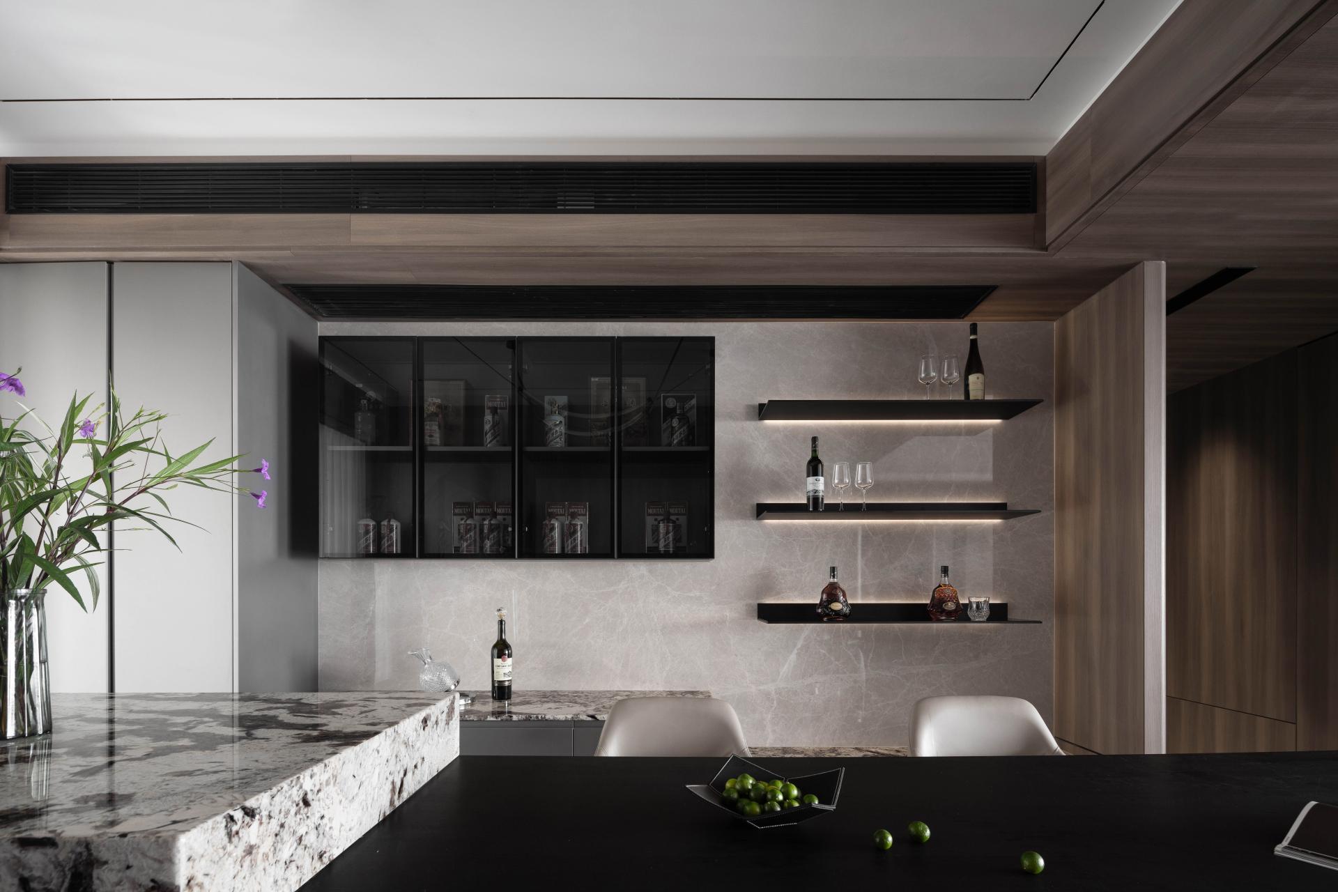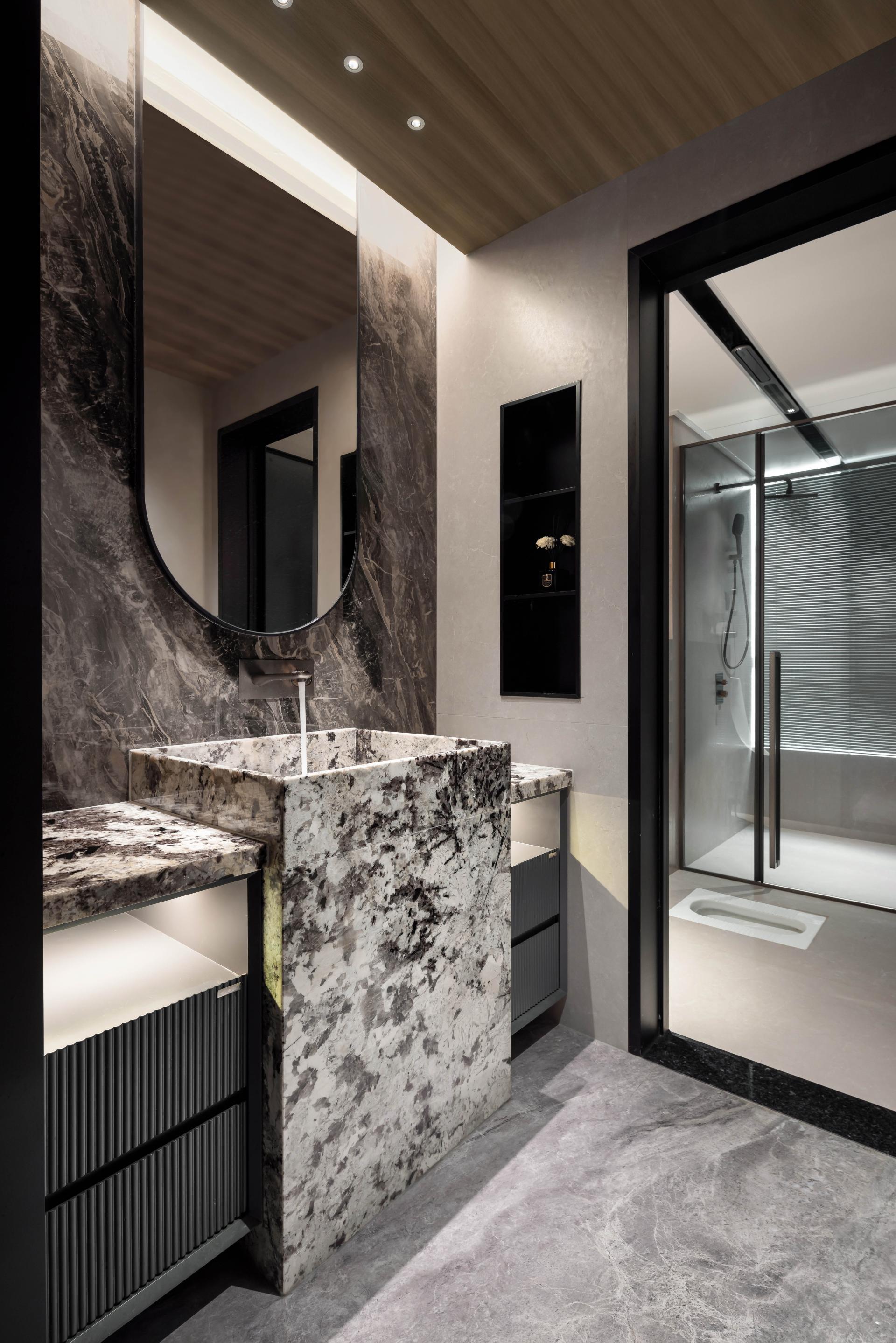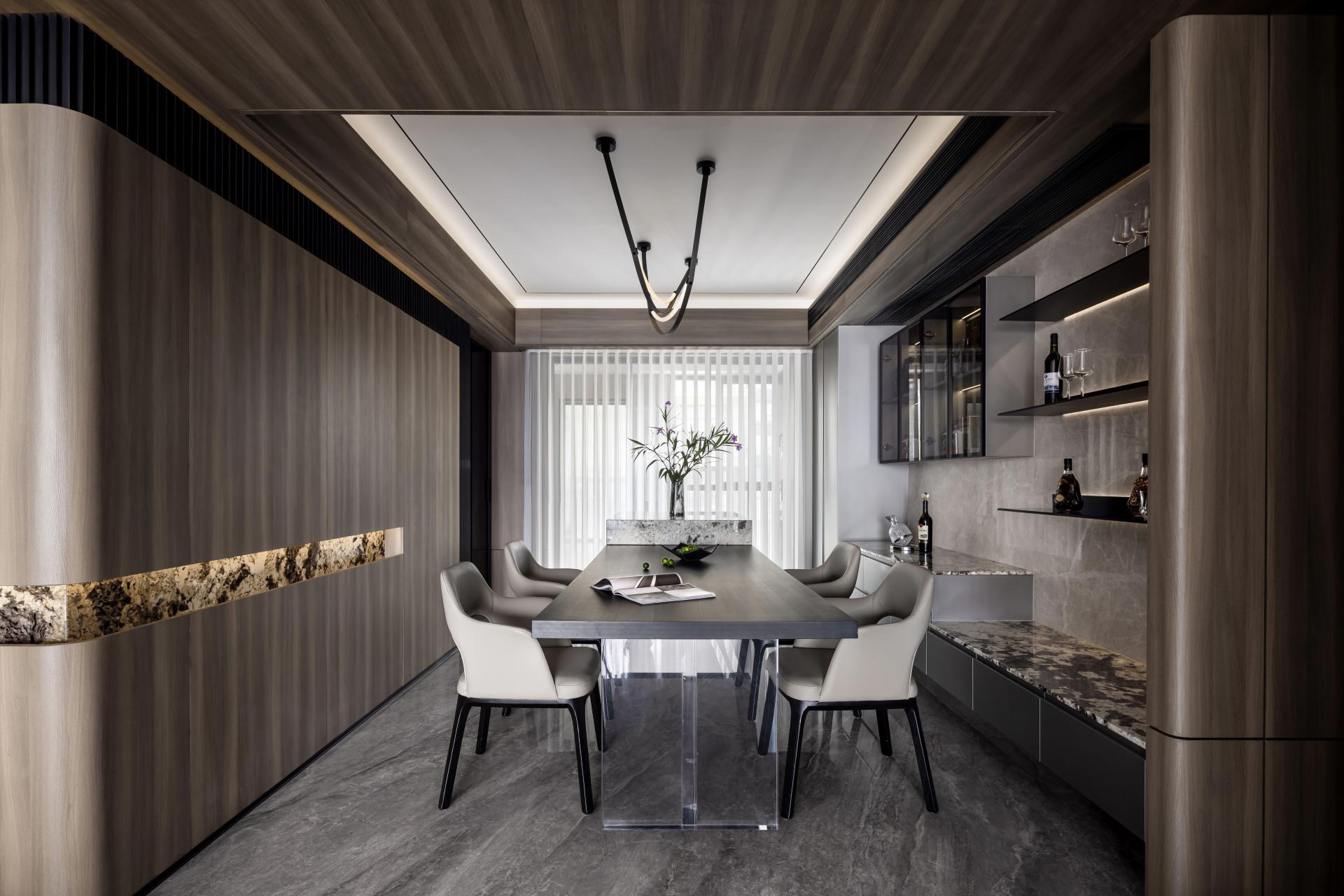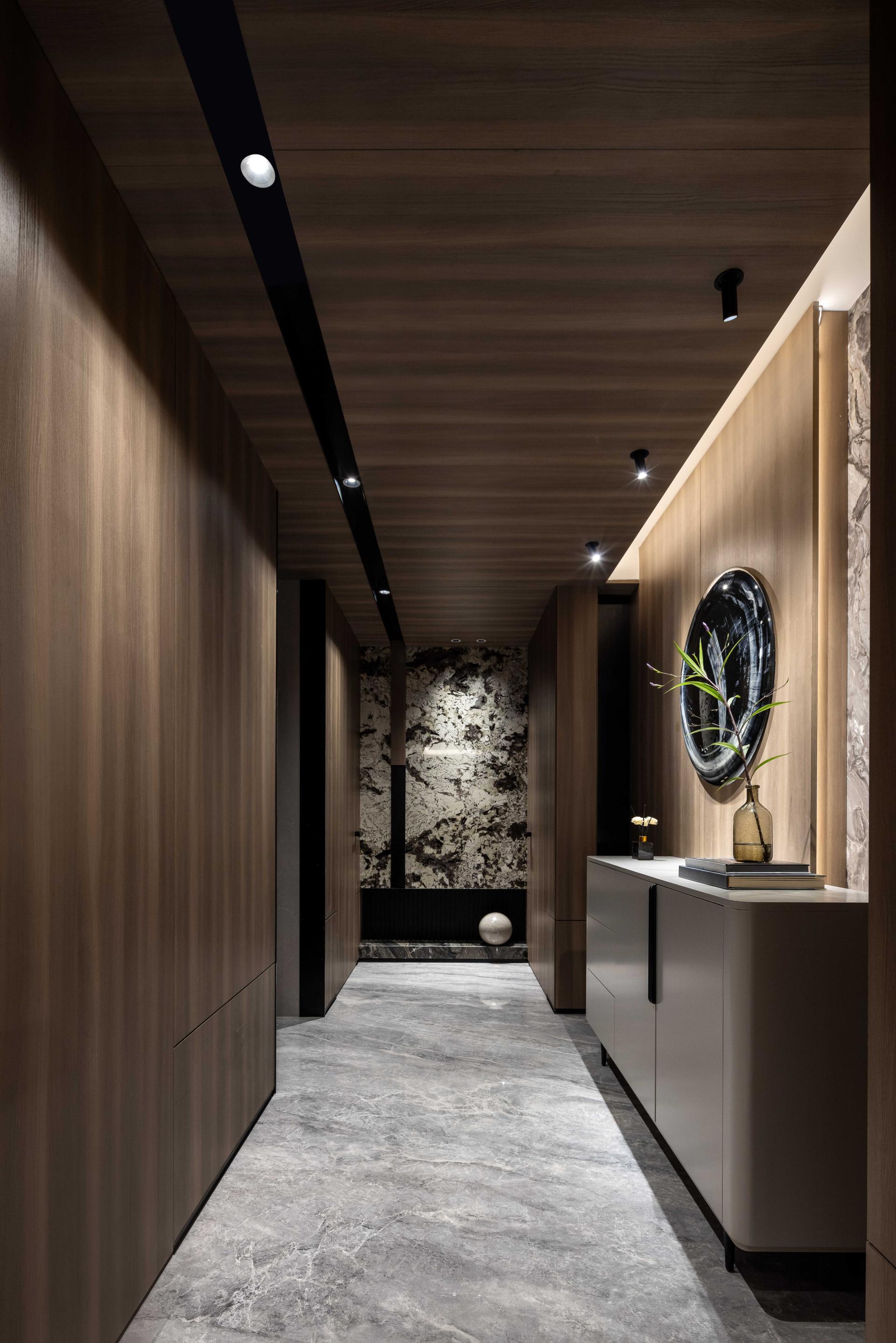The master bedroom embraces a simple yet elegant palette, continuing the wooden veneer’s refined texture. It integrates a sense of ceremony into daily life, with mottled stone patterns unfolding organically along the architectural framework, creating a harmonious dialogue between nature and artistry.
