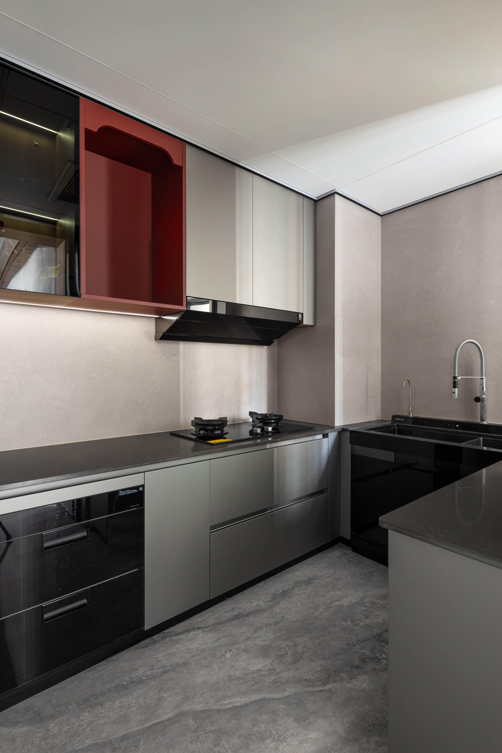 The kitchen seamlessly blends functionality with aesthetics, incorporating a deep, textured dark red that disrupts monotony and introduces a touch of vibrancy to the cooking experience.