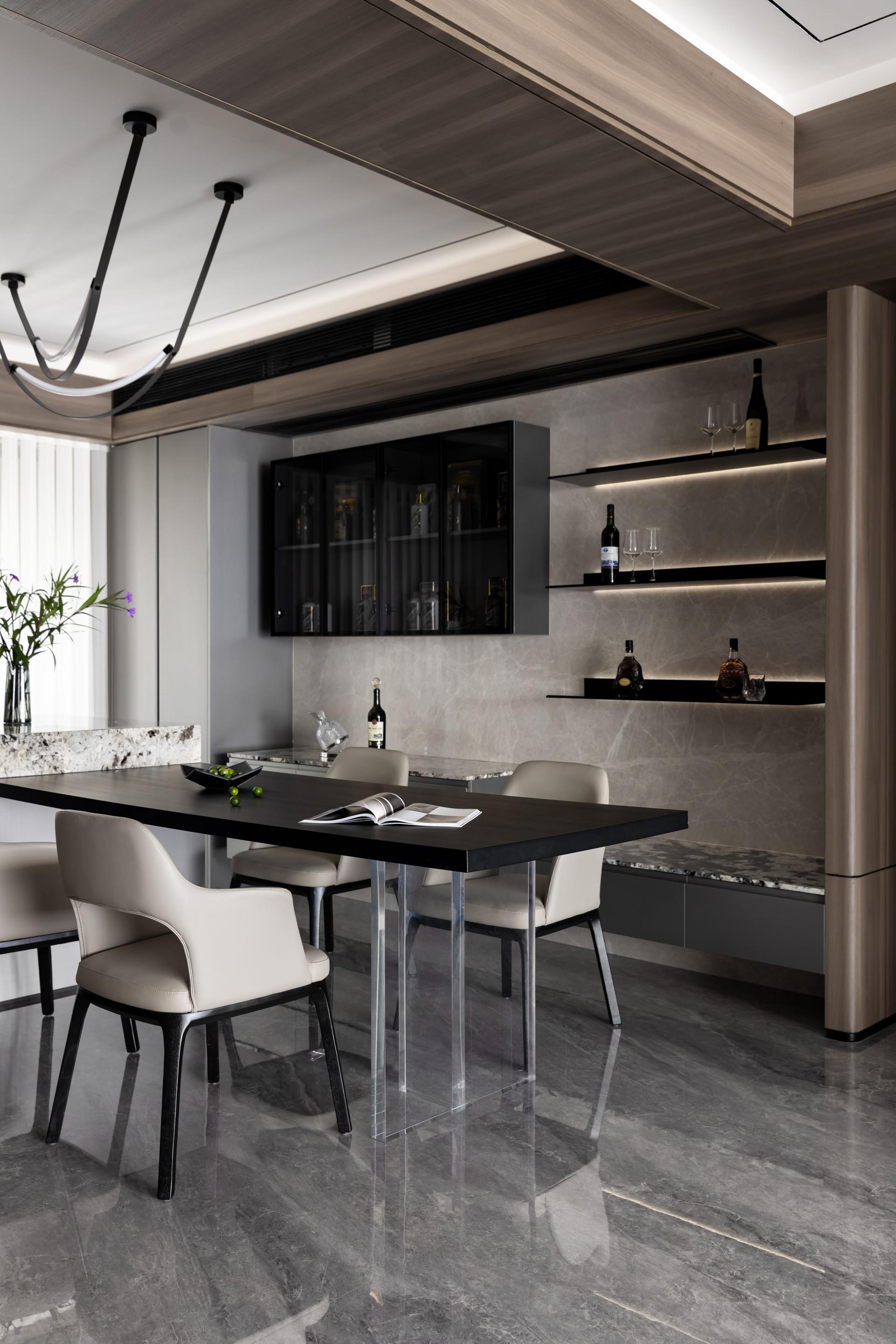 The dining area features a long table paired with an island counter, establishing a dynamic structural hierarchy. A rich, textured base color is enhanced by soft shadows, adding depth and breaking uniformity. The delicate balance of brightness and darkness elevates the overall aesthetic.