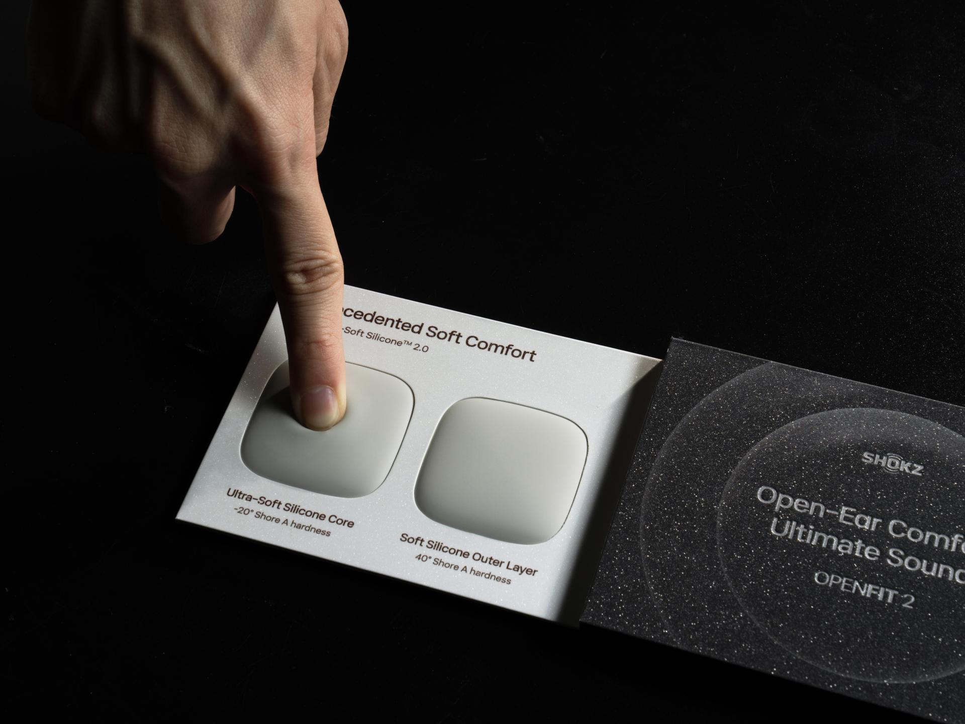 To highlight the "ultimate comfort" feature, we attached Shokz Ultra-Soft™ Silicone (used in OpenFit 2) and standard silicone on the left side of the brand card. Through tactile comparison, Users can feel the material differences, conveying the comfort of the earphone's material.The right side of the card employs a lenticular design that highlights the design of Shokz DualBoost™ Technology for sound quality enhancement from different angles.