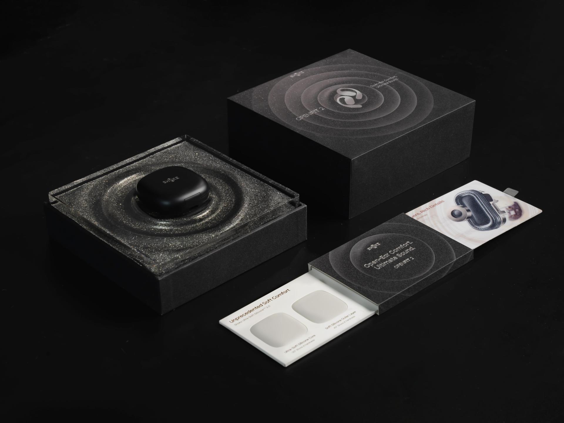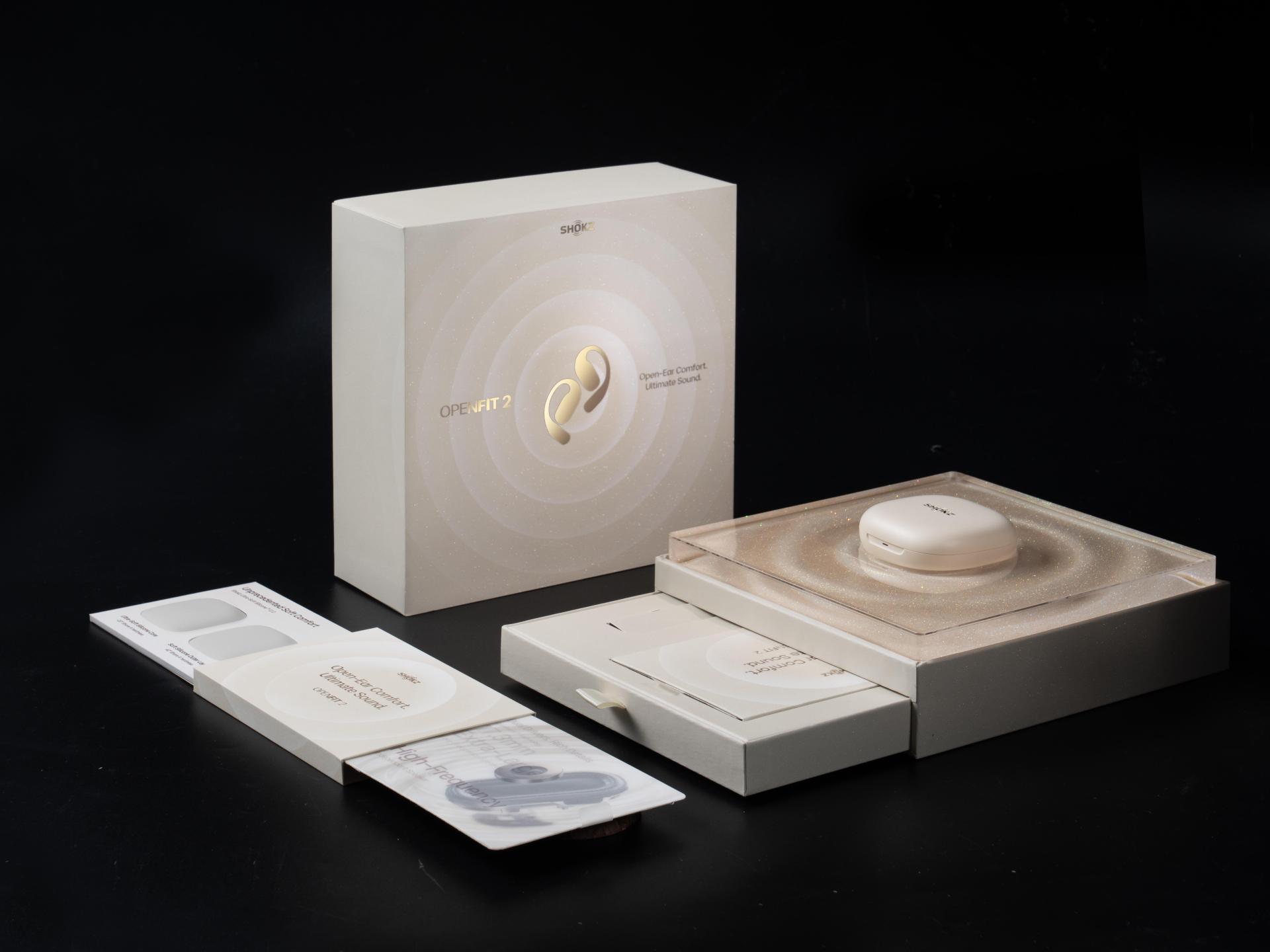 To support the launch of the Shokz OpenFit 2 earphones, we designed an exclusive set of marketing gift boxes for KOLs, highlighting the product's core selling points: "dynamic sound quality" and "ultimate comfort." The packaging creates an immersive experience through interactive and visually impactful elements, helping KOLs convey product features while enhancing user engagement and brand appeal.