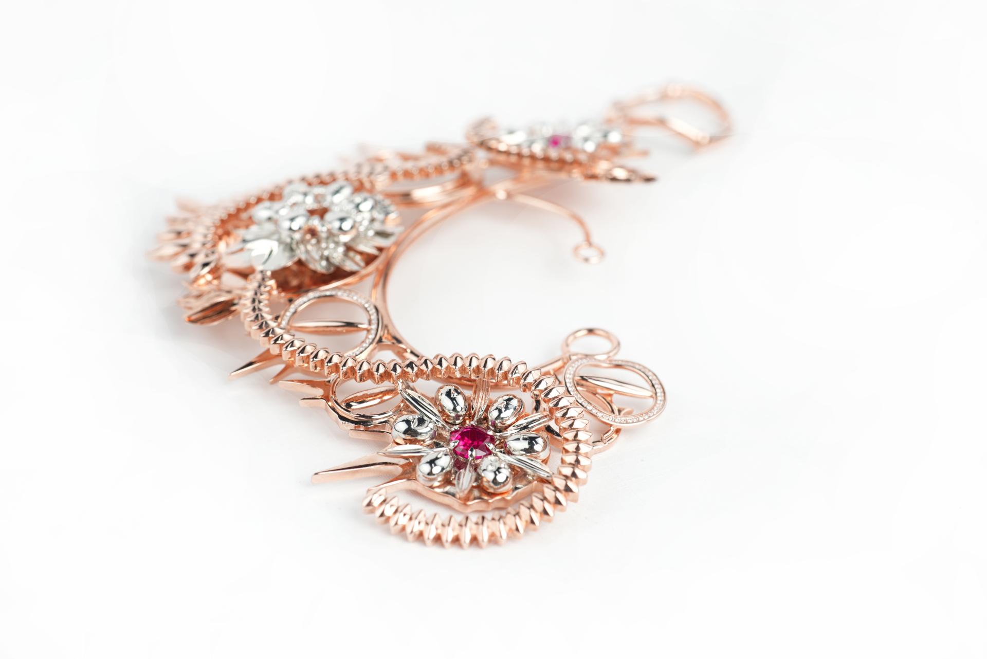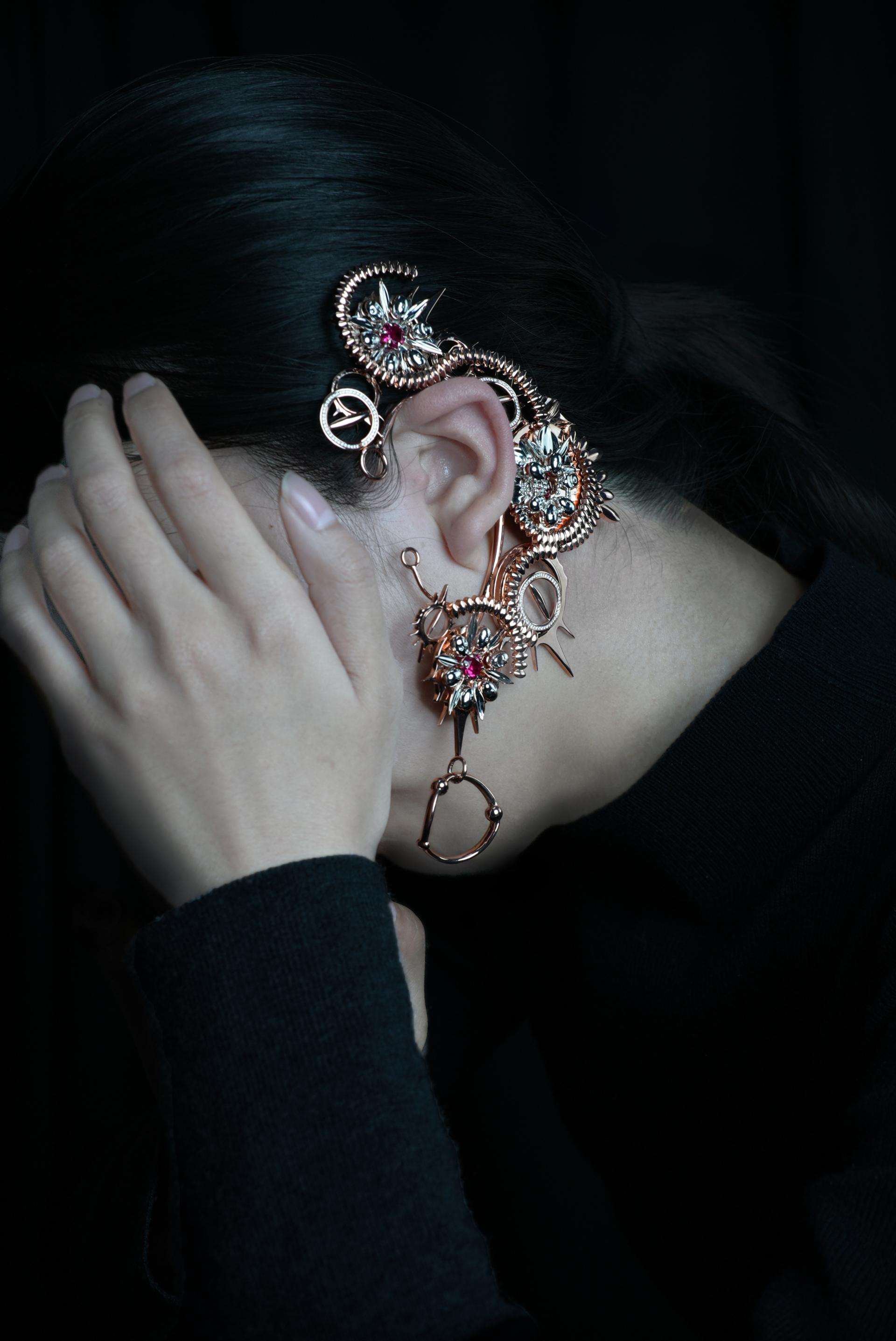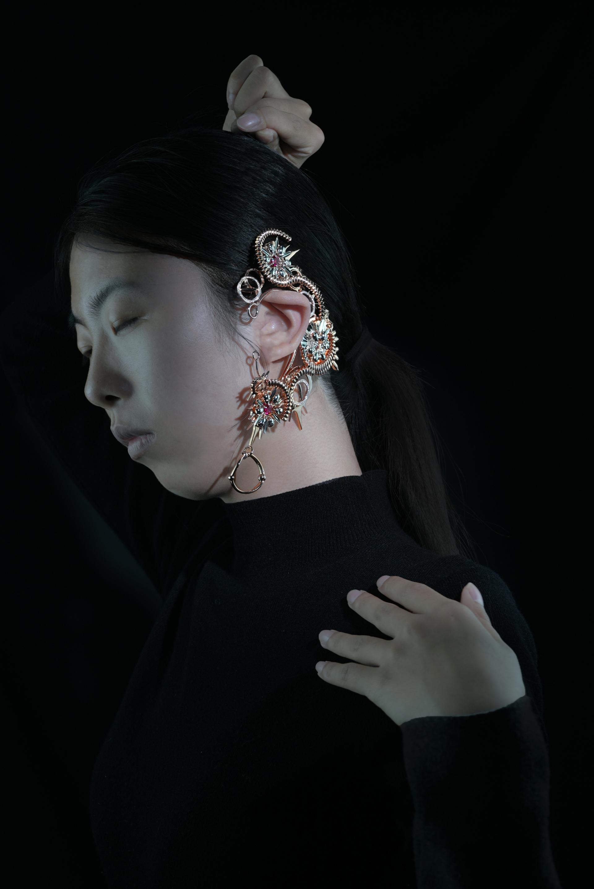 "Collective Intimidation" is an earring piece created in Beijing in 2024. Through this earring, the designer tells a true story that occurred around the ears, expressing a profound reflection on the unconscious malice and indifference in group behavior. The work uses gentle curves and flower shapes to represent "screaming, anger and helplessness", showcasing the protagonist's struggle and pain under group pressure.