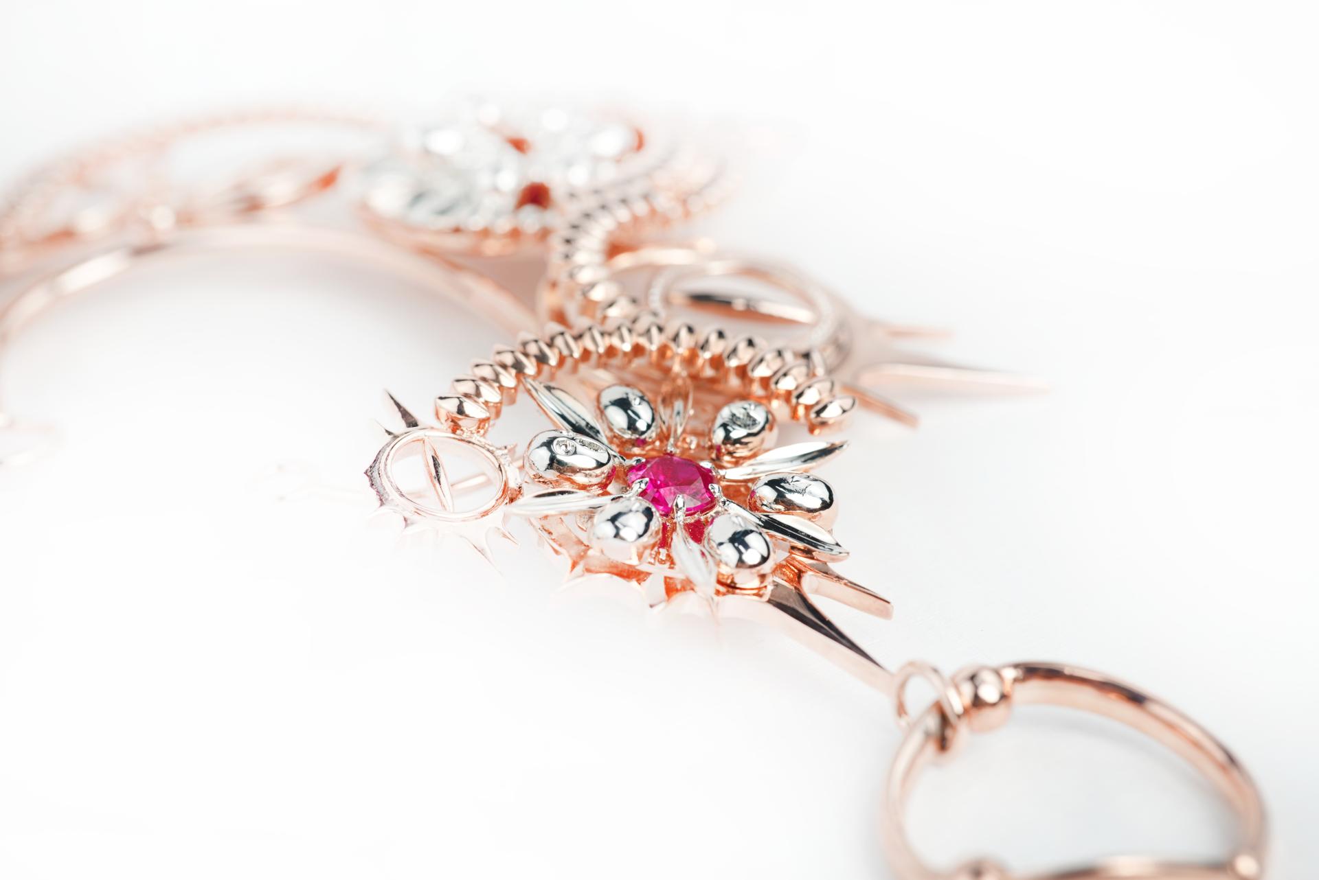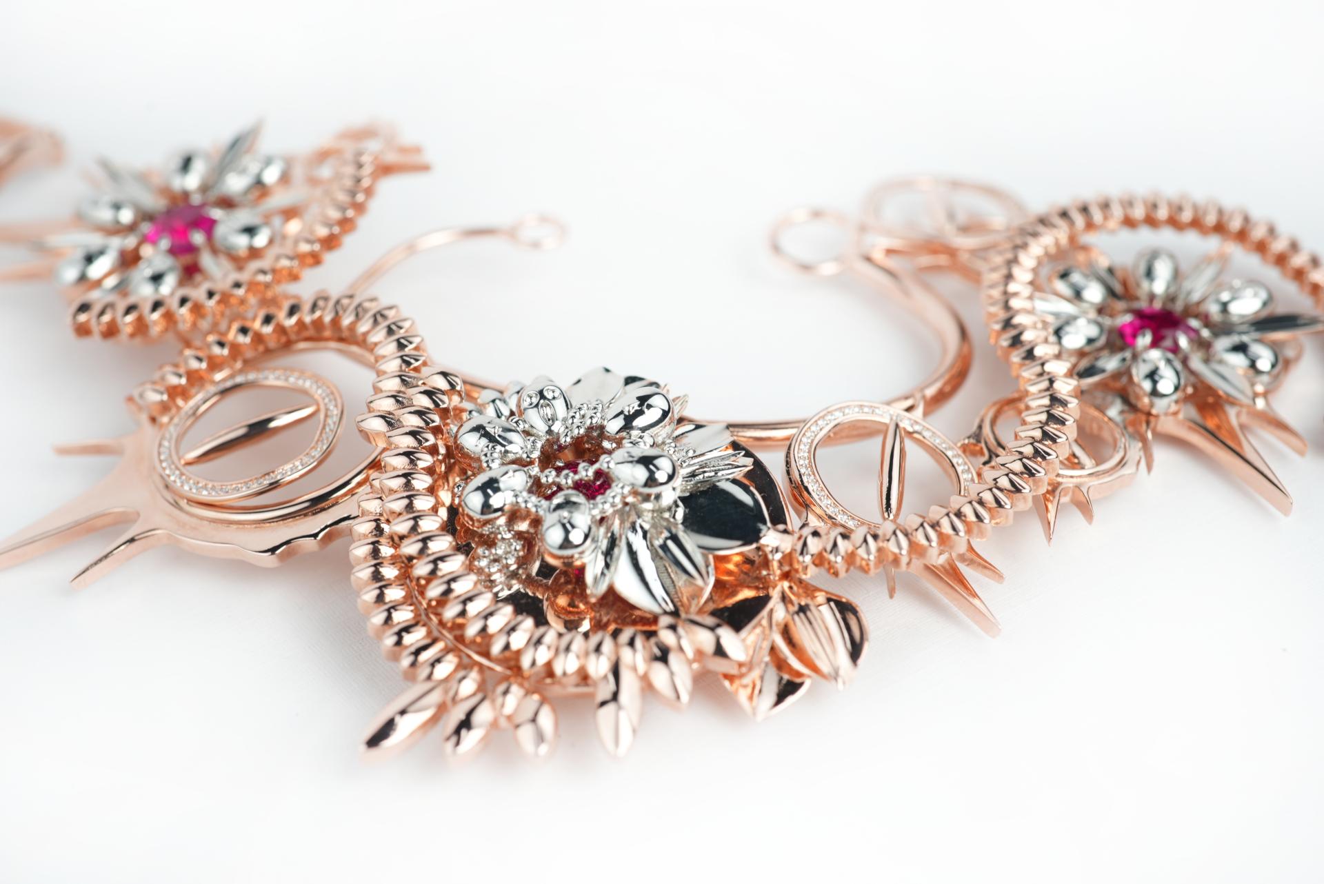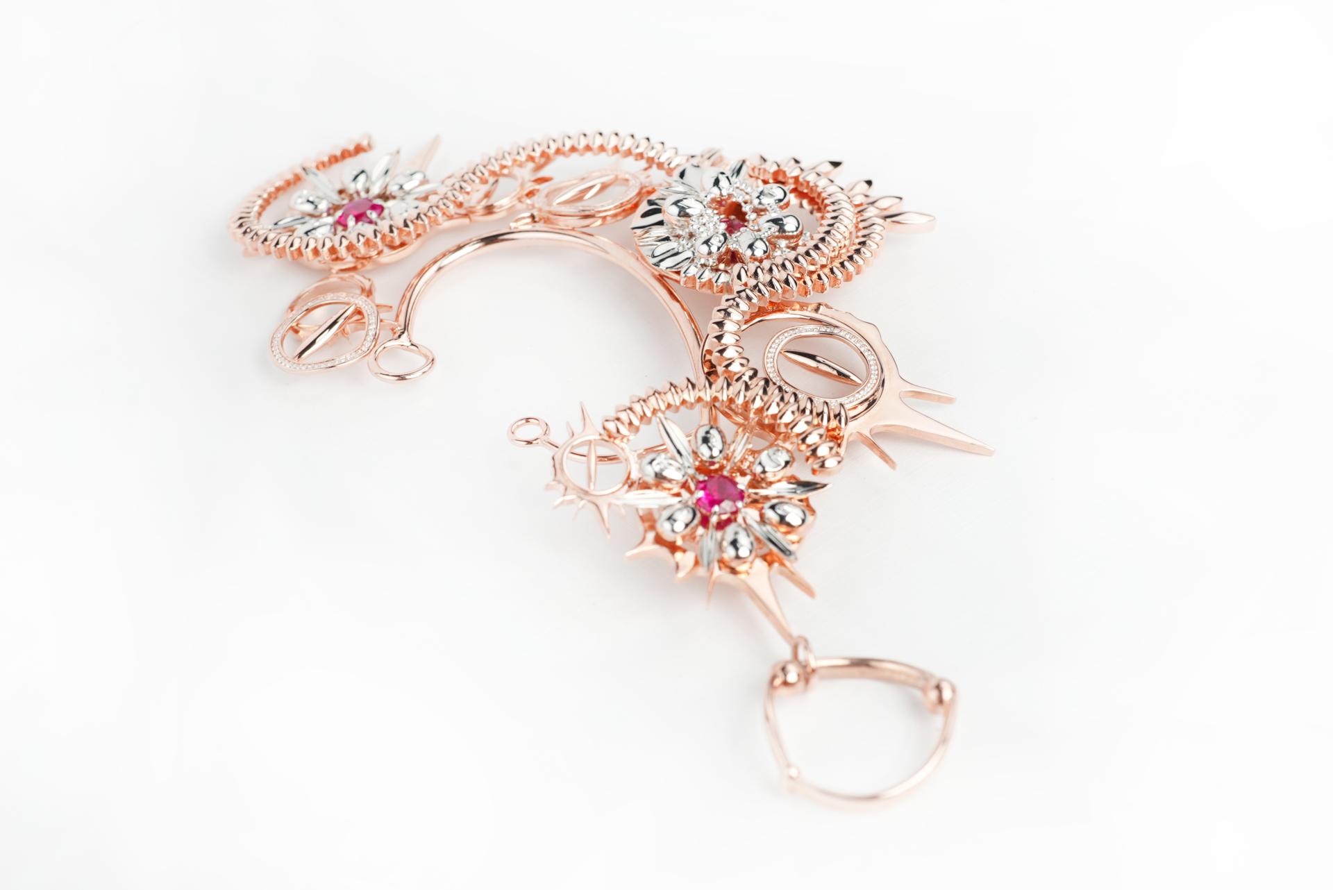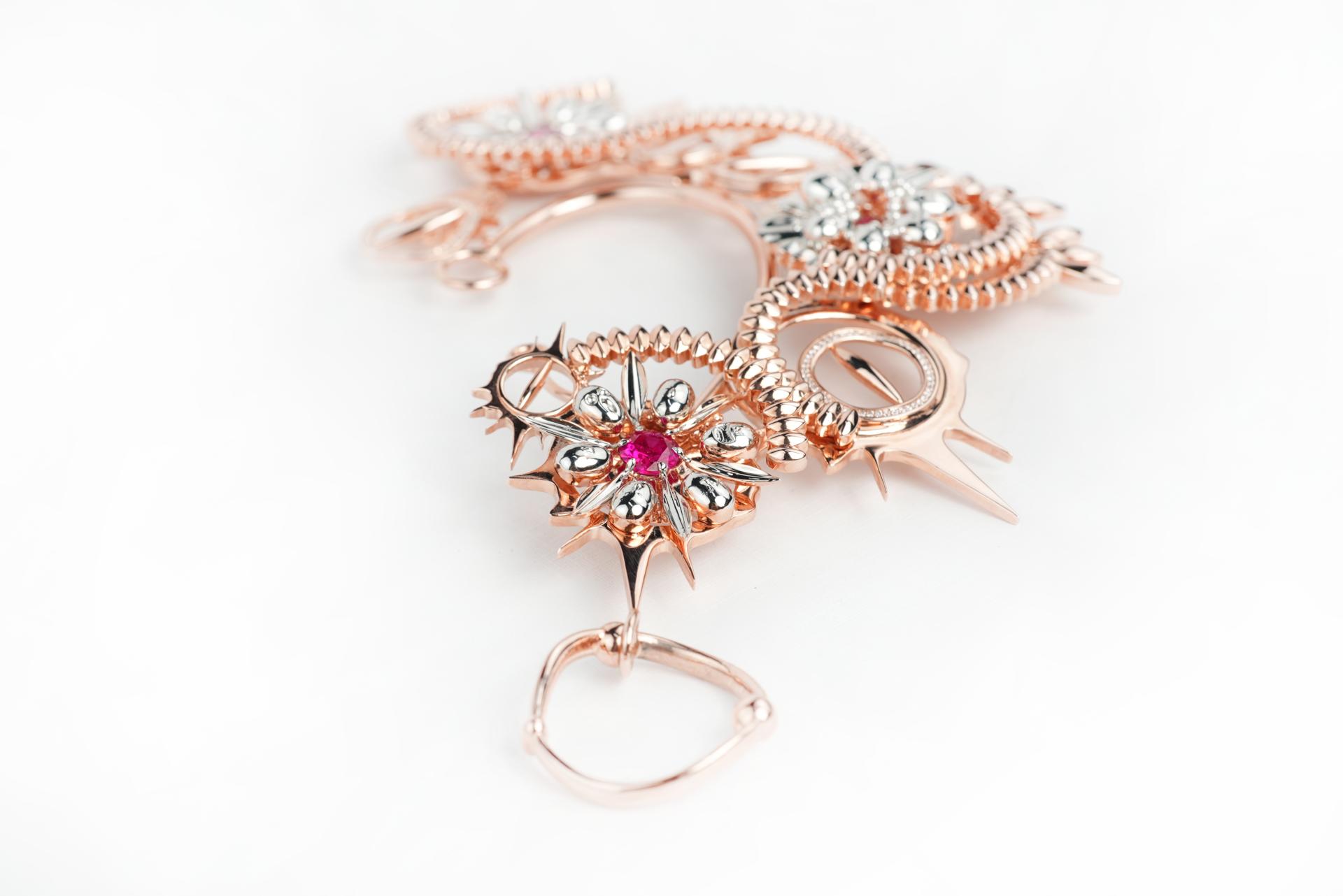 Through the ingenious combination of materials, forms and colors, the designer reveals the hidden sharpness and harm in group behavior. The covert rose gold color symbolizes the unconscious behavior of the followers, while the white gold accents represent the protagonist's cry and feelings. The mirror design magnifies the "ugly face" infinitely, suggesting the oppression and harm of group behavior on the individual. The three red zirconia stones embedded symbolize the "lesson of blood", directly and vividly expressing the pain and harm brought by the event, and also symbolizing warning and reflection.