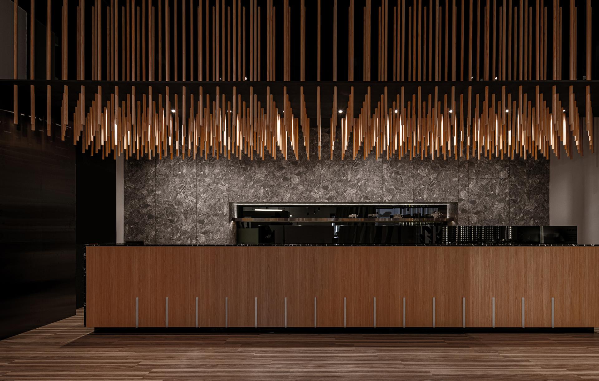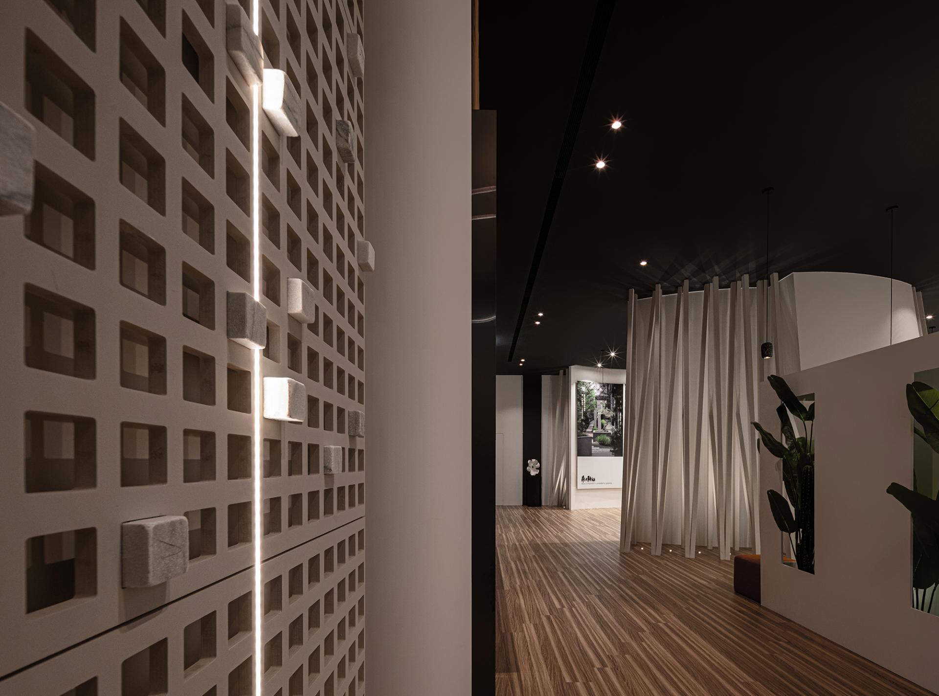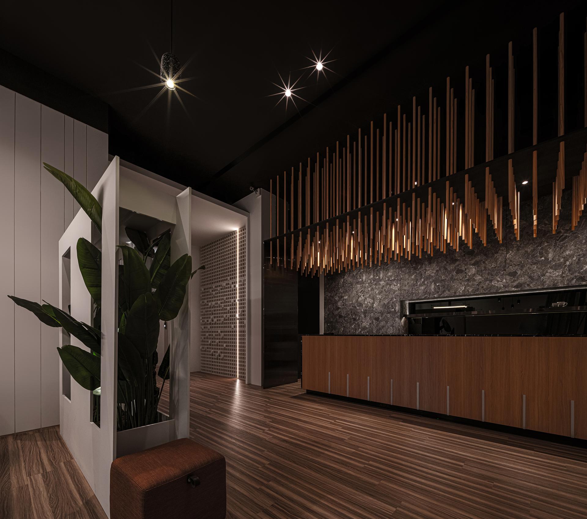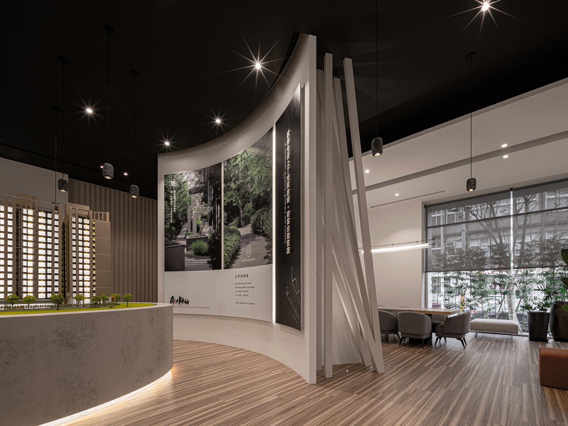 The entrance reception area serves as a pivotal stage for crafting a remarkable first impression. To begin with, the design team thoughtfully selected Narnia gray marble for the flooring, which beautifully evokes the sensation of walking along a rugged trail adjacent to a tranquil bamboo forest. Furthermore, they enhanced this immersive experience by incorporating lush landscaped plantings along the corridor, creating the enchanting illusion of a secret forest and guiding visitors on a gradual and exploratory journey. As one transitions into the main space, visitors are greeted with a thoughtfully designed circulation line that encompasses a negotiation area, a model display area, and a bar area. This central area is truly the heart of the reception center, featuring an abundance of bamboo-inspired structures, natural-textured materials, and an intricate lighting design that artfully plays with light and shadows.