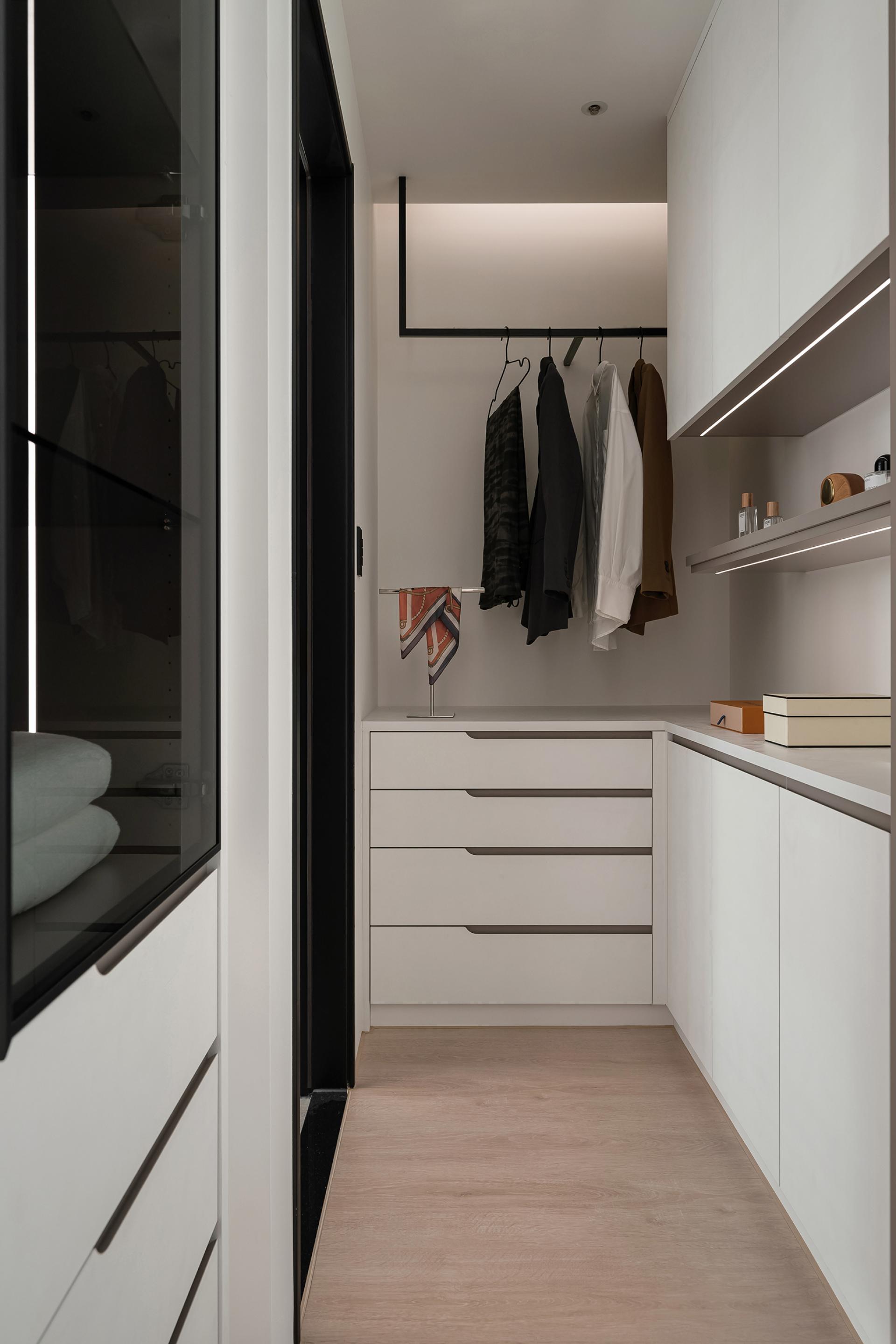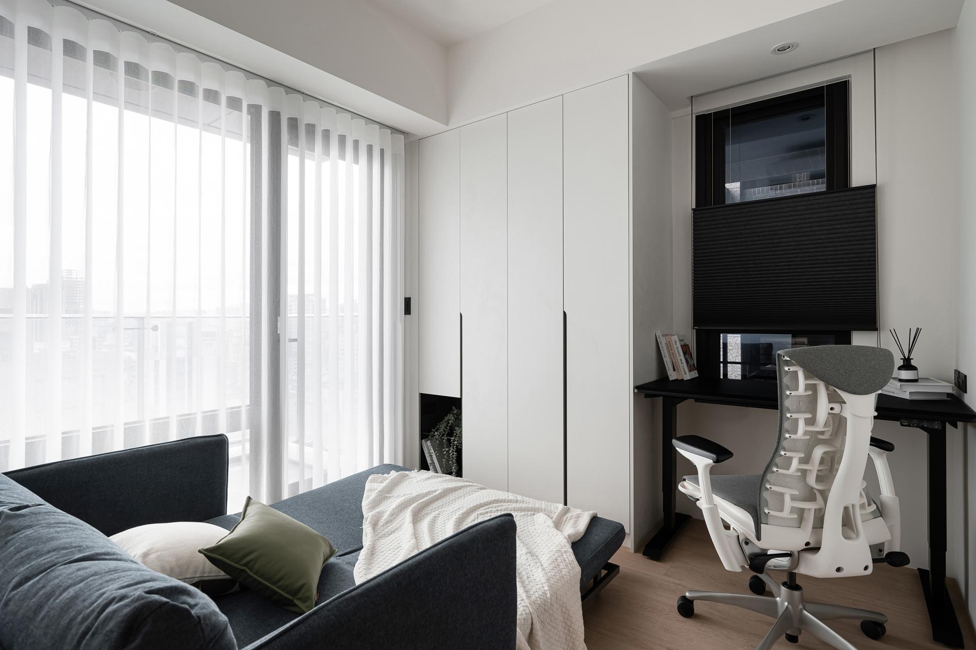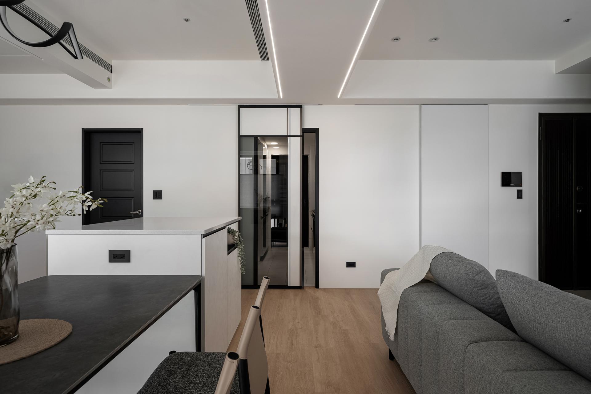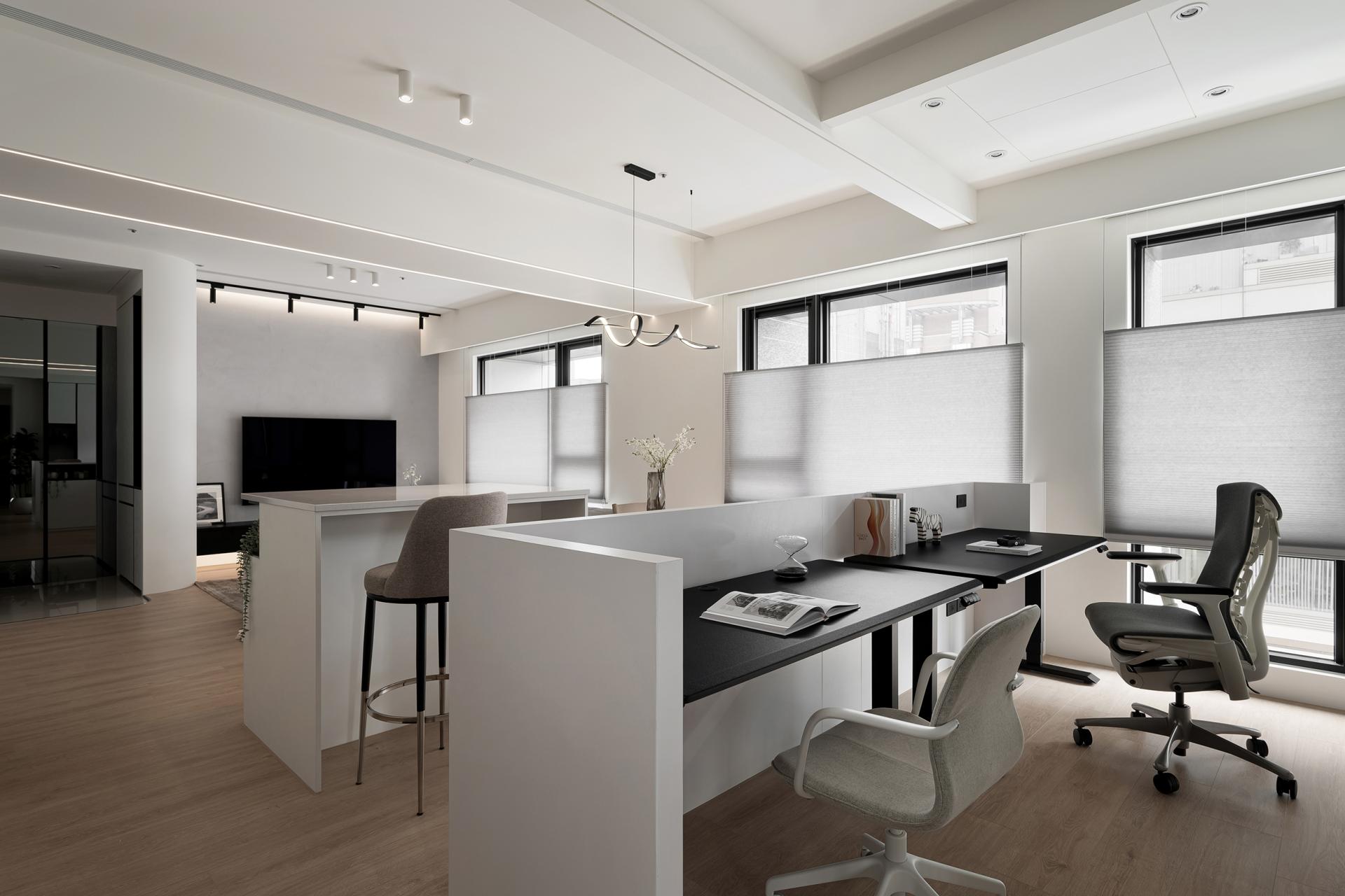 To satisfy the couple's need for intense focus while working from home, the project strategically established the living room study as the central hub, crafting a workspace that is both professional and comfortable. Drawing inspiration from a monochromatic palette of black, gray, and white—symbols of minimalism and rational thought—the design achieves a harmonious blend of precise color coordination and fluid circulation. This results in an orderly space imbued with dynamic visual tension that resonates with the rhythm and quality of modern urban life. The seamless transition between home and office enhances both aesthetic appeal and efficiency, all while reflecting a distinctly personalized style.
