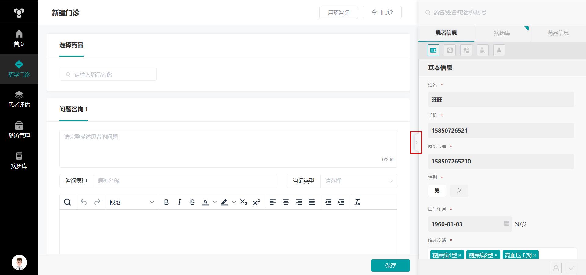 The system allows for comprehensive patient management (adding & searching & editing information) to ensure data integrity. The medical record database documents patient assessment data and pharmacy & outpatient history, providing doctors with detailed references for patients’ conditions. The pharmacy & outpatient module supports drug querying, prescription writing, and consultation management, making it convenient for doctors to develop medication plans tailored to each patient’s needs.