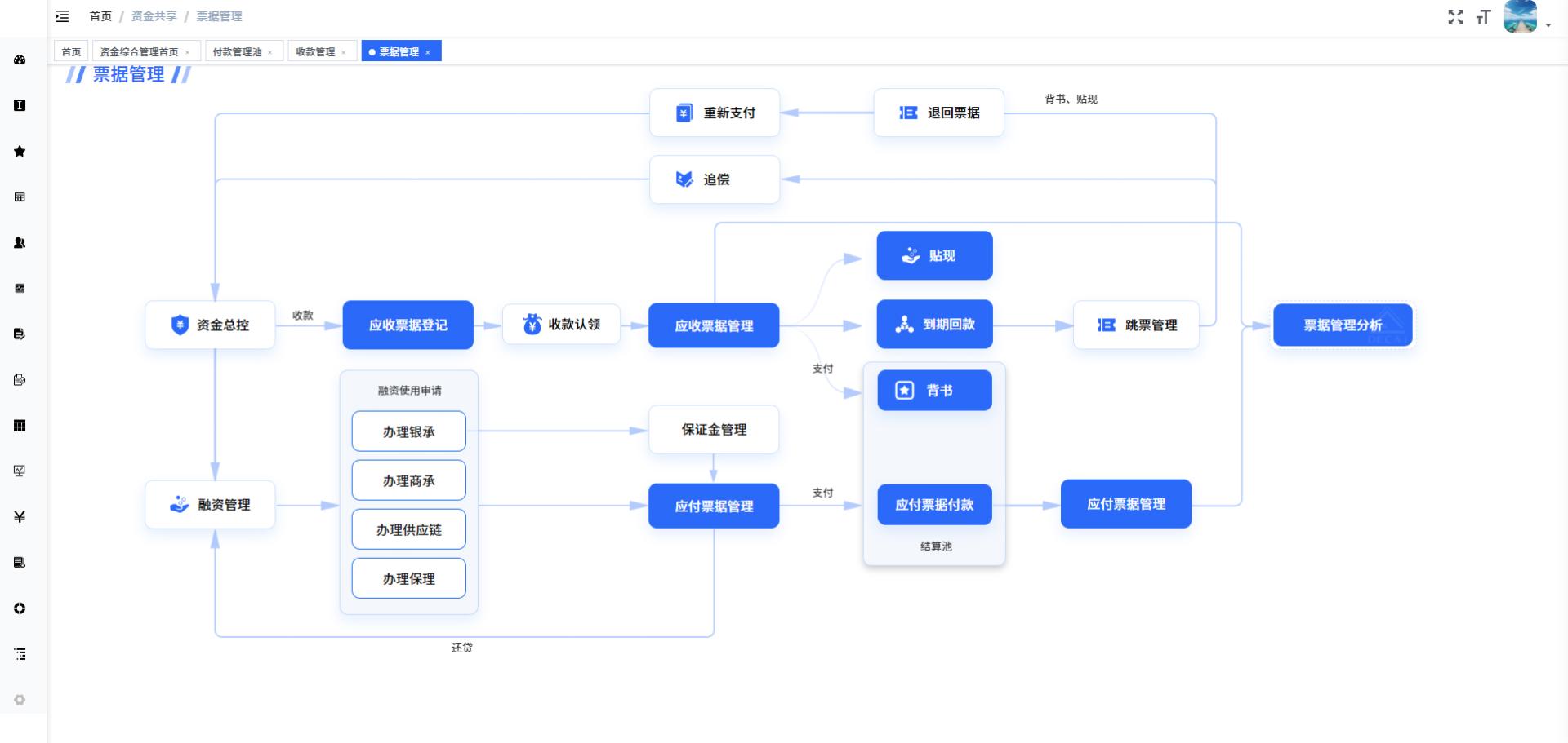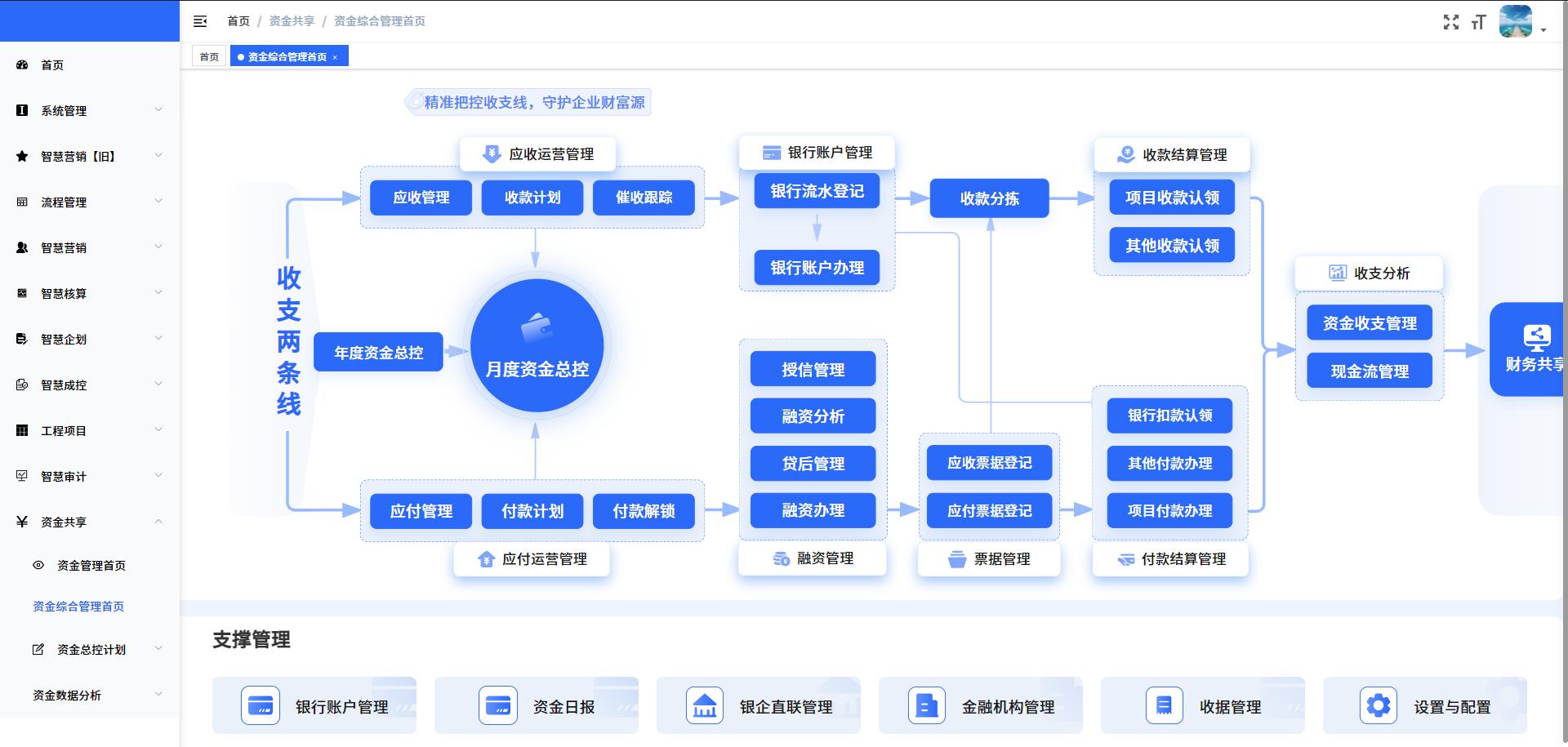 The Full-Process Corporate Expense Management System, a comprehensive system integrating fund accounting, data exchange, and function management, covers the entire process of corporate expense management and enhances fund operation efficiency. It includes 10 core modules, such as accounts receivable, accounts payable, bank account, financing, bill, payment settlement, daily fund report, direct bank-enterprise connection, and income & expenditure analysis, providing full support for corporate financial operation.