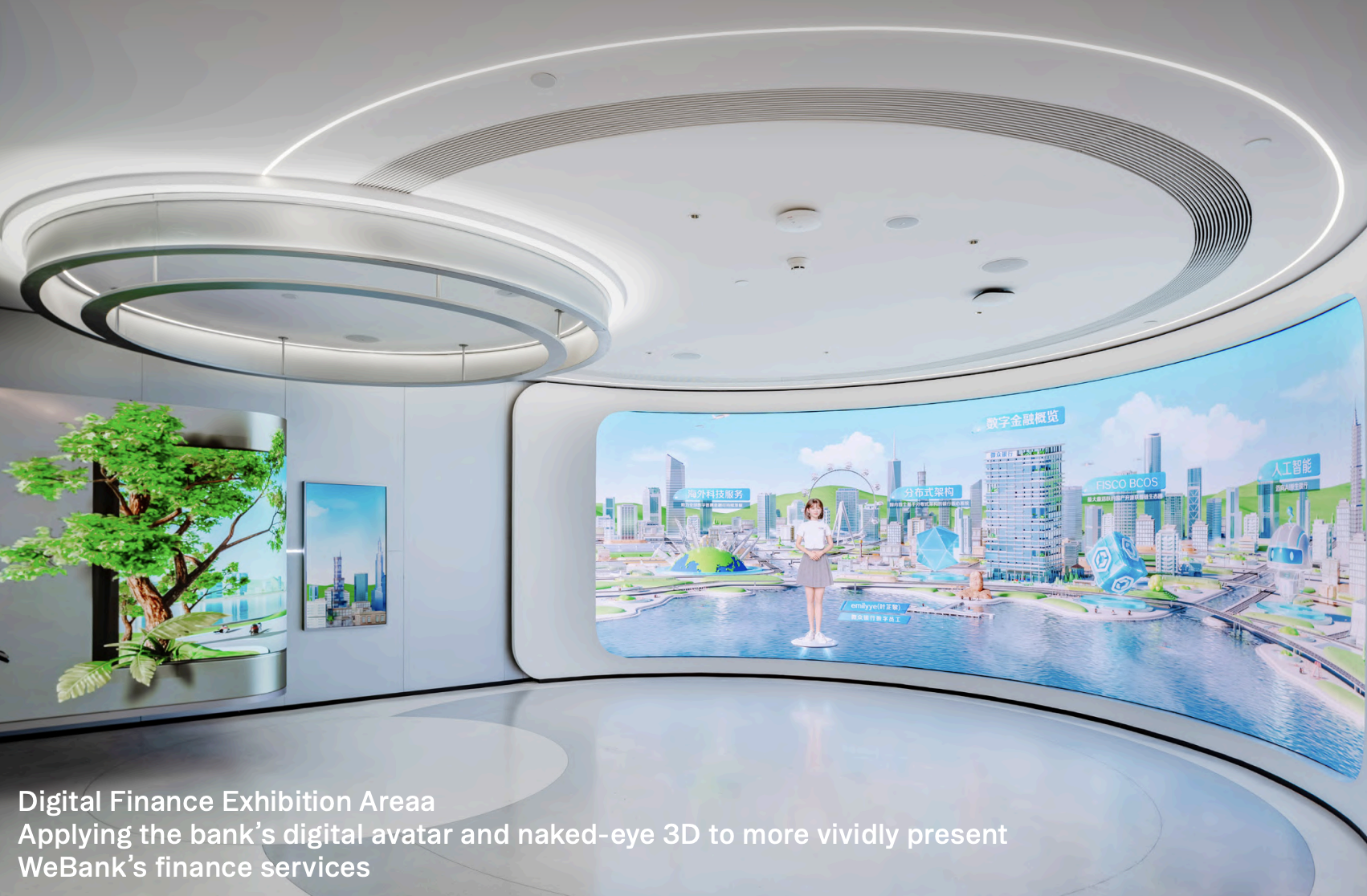 Covering 960 sqm the showroom transforms abstract brand values into a multisensory experience. The exhibition area on the first floor presents WeBank's brand story, corporate culture, and social responsibility, while on the second floor it is to showcase its innovative achievements across various financial sectors. The journey blends innovative achievements with emotional storytelling. By engaging with digital avatars, naked-eye 3D, and interactive data sculptures, visitors are invited to experience how WeBank empowers individuals through technology.