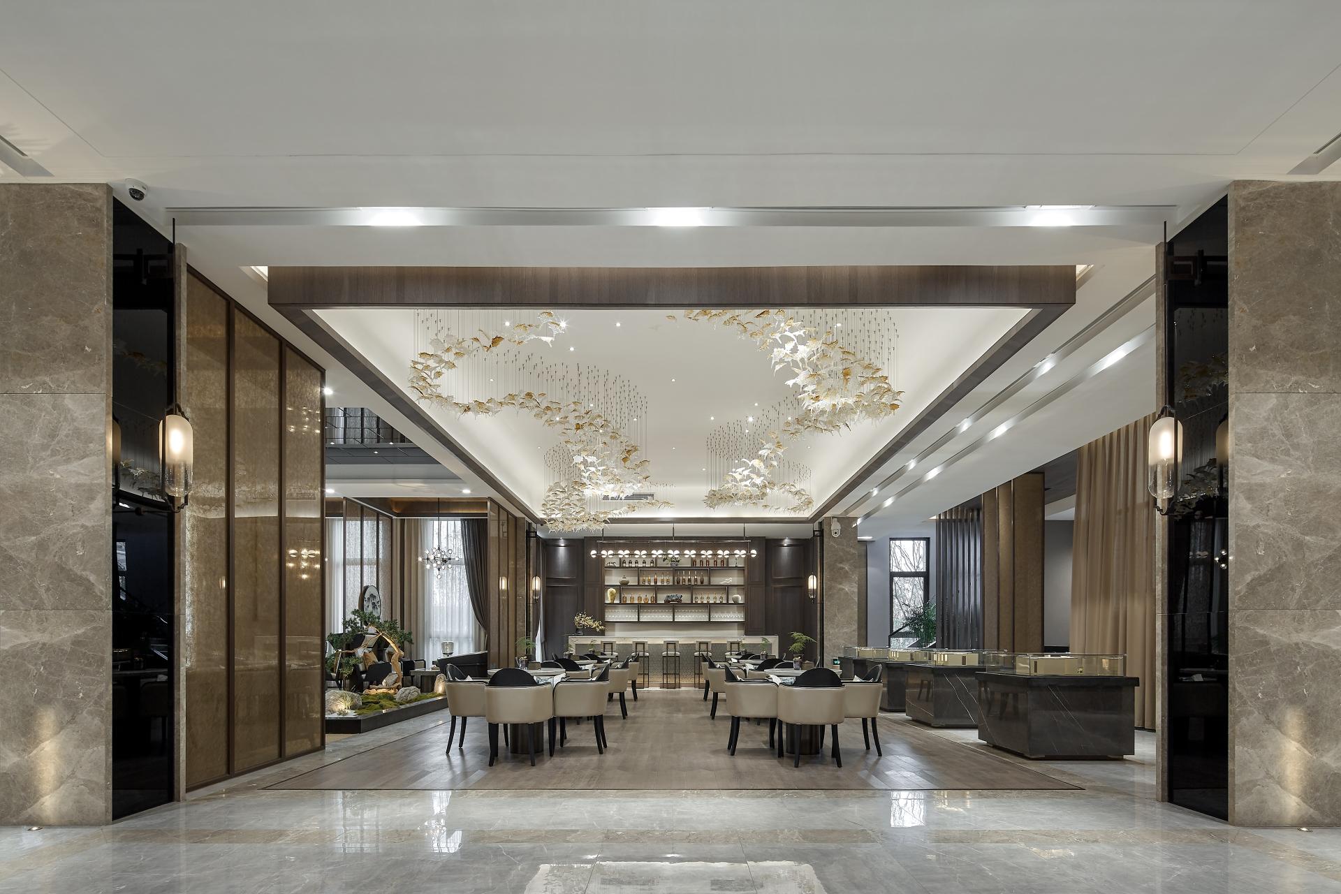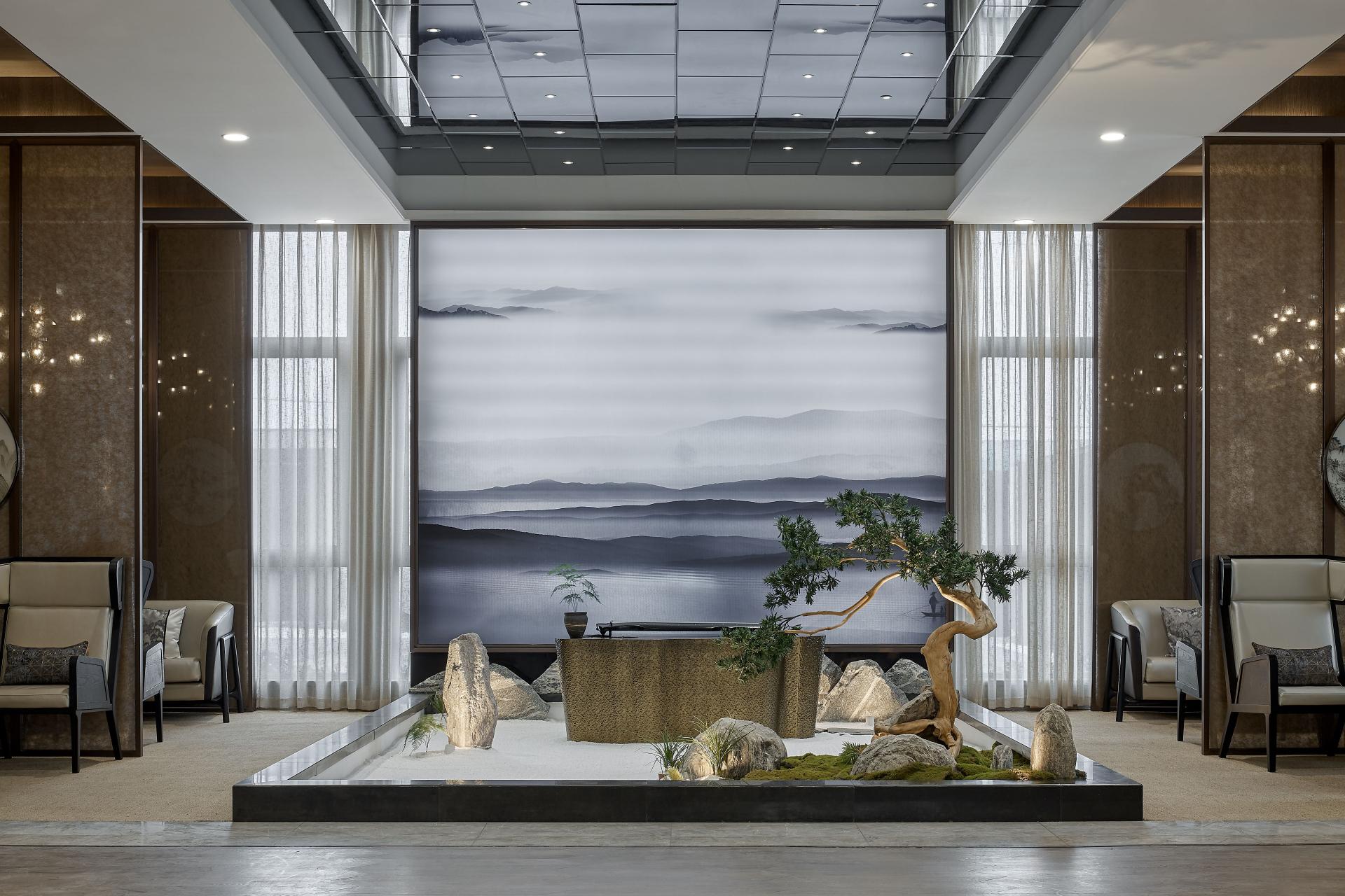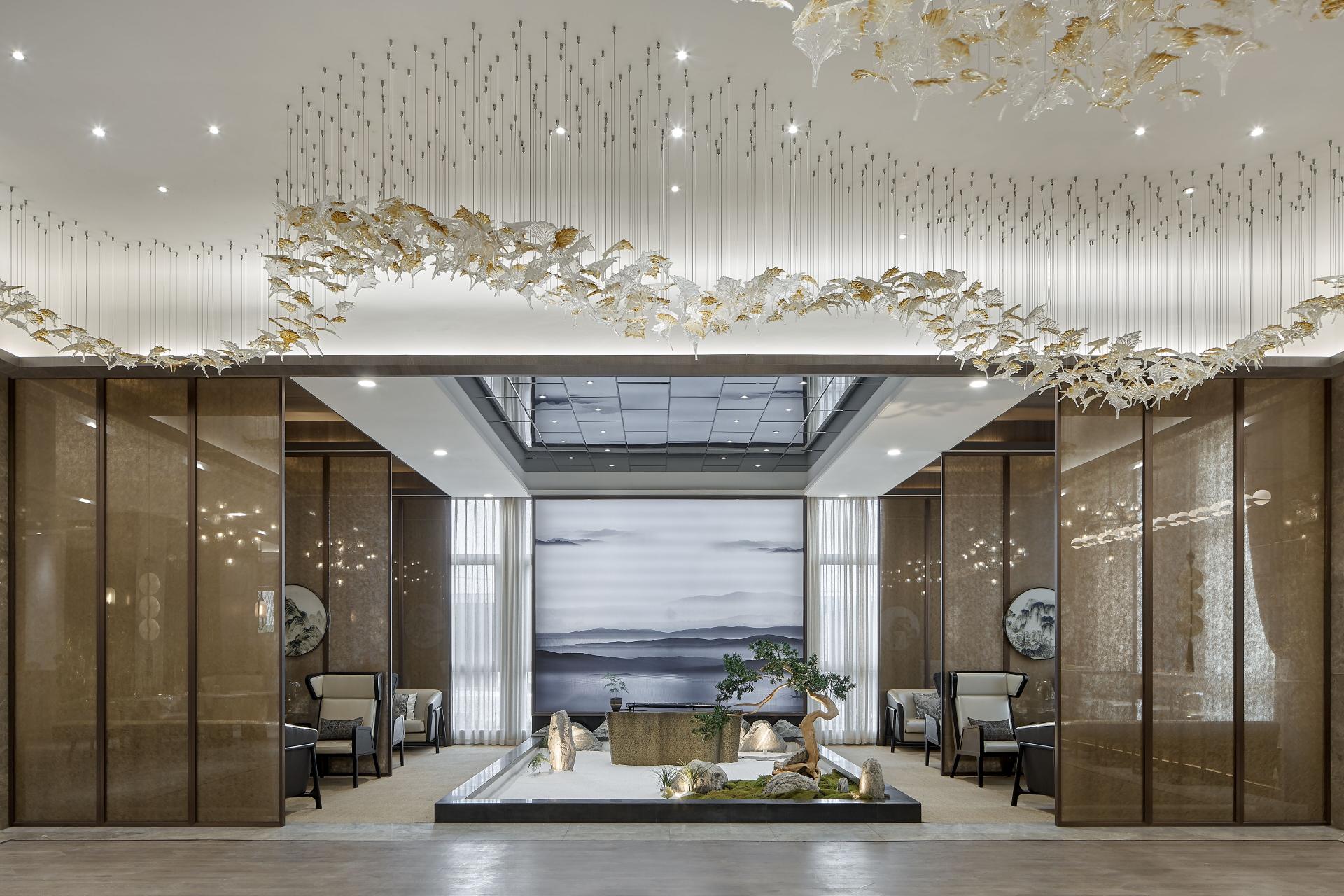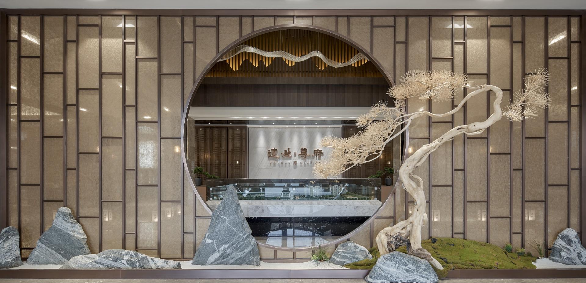 Jianye Zunfu Sales Center is located in Luoyang, an ancient capital of China steeped in historical significance. The city's rich heritage permeates its contemporary landscape, imbuing younger generations with a unique blend of classical sensibility and modern ambition. This rich cultural context directly inspired the sales office's innovative design. Jianye Zunfu Sales Center is located in Luoyang, an ancient capital of China steeped in historical significance. The city's rich heritage permeates its contemporary landscape, imbuing younger generations with a unique blend of classical sensibility and modern ambition. This rich cultural context directly inspired the sales office's innovative design. The entrance sets an immediate tone of reverence, with a carefully crafted signboard and a welcoming pine that create a ceremonial approach. Inside the lobby, abstract mountain shapes and intricate screen patterns symbolize progress and reunion. The corporate culture and project display area communicate Jianye Group's vision and future aspirations. In the negotiation spaces, delicate peony motifs and sculptures pay homage to Luoyang's renowned status as the City of Peonies. The deep negotiation area is particularly compelling, featuring water elements, bamboo landscapes, and sculptural installations that cultivate a tranquil atmosphere designed to inspire client investment. Natural materials—stone, wood, metal, fabric, rattan, and genuine leather—are thoughtfully integrated with modern technological elements, creating refined spaces that beautifully demonstrate the perfect fusion of nature and contemporary design. Specialized areas like the book bar and tea culture area deepen this interaction, combining organic elements with traditional cultural aesthetics to craft inviting environments rich with cultural resonance.