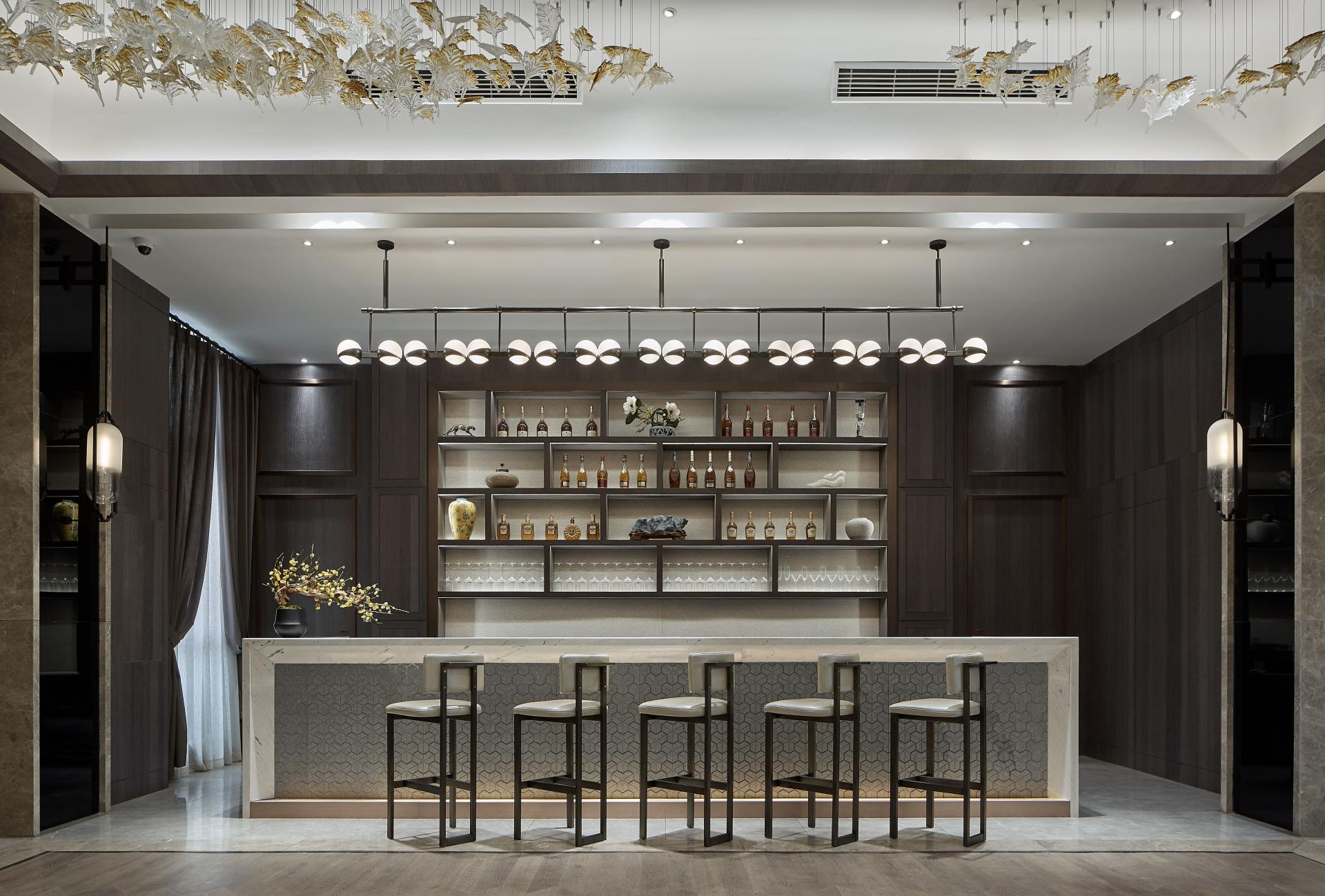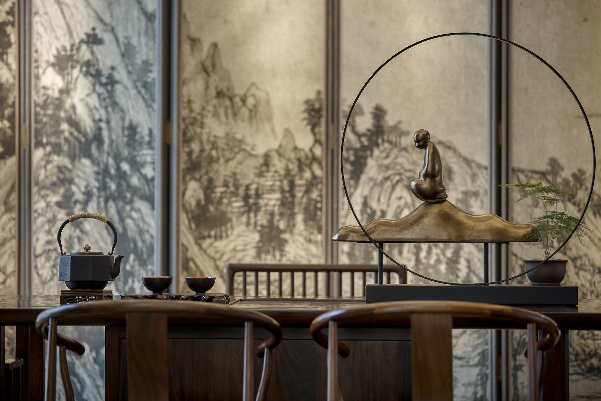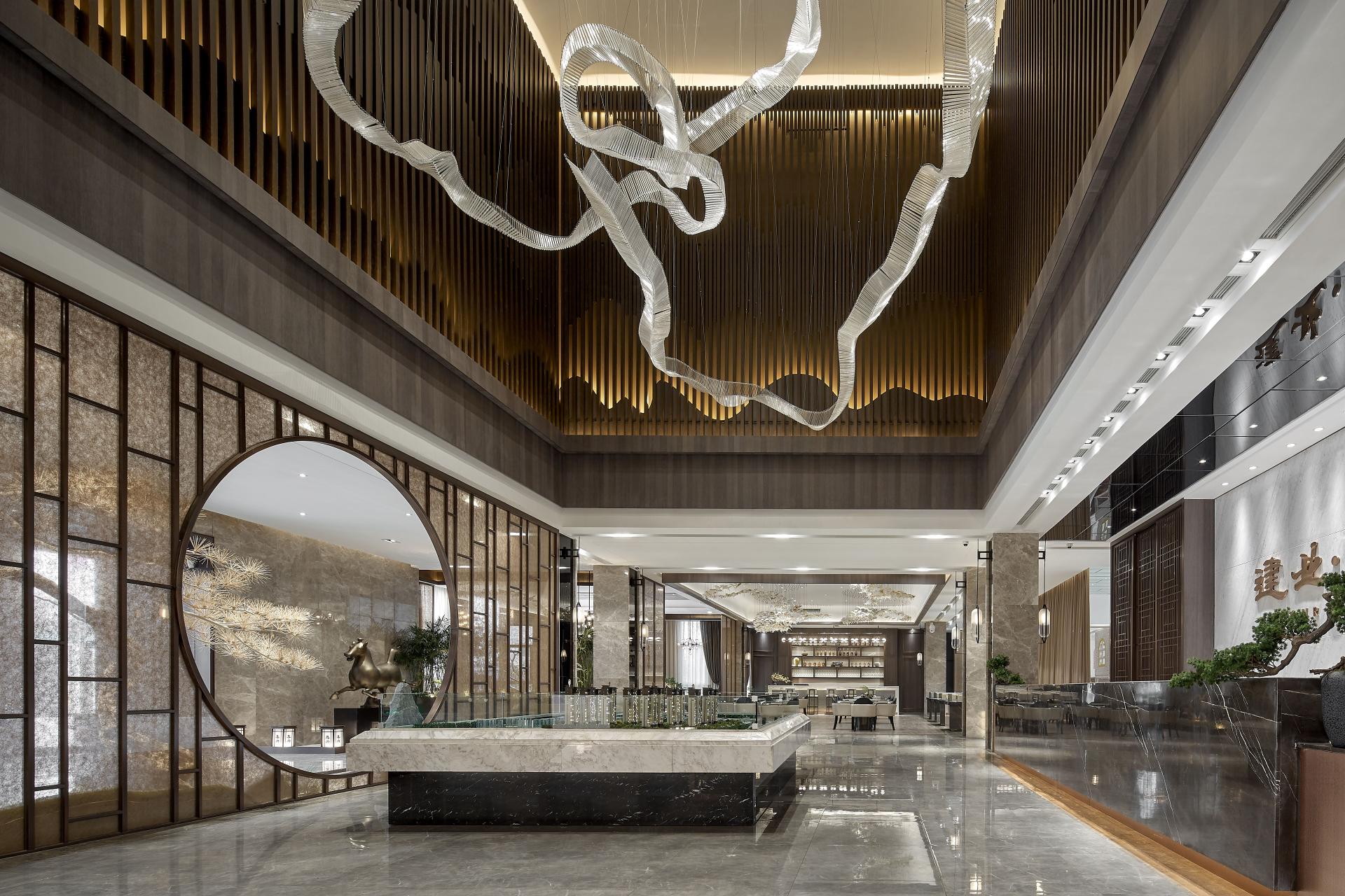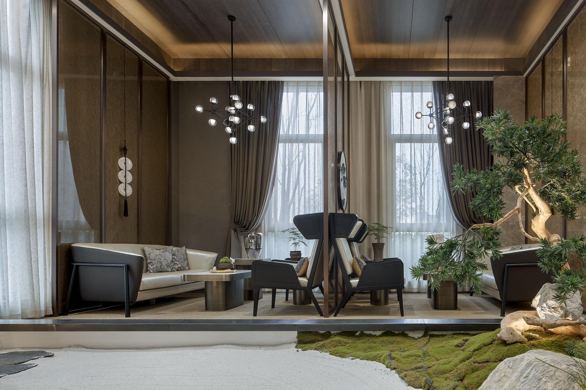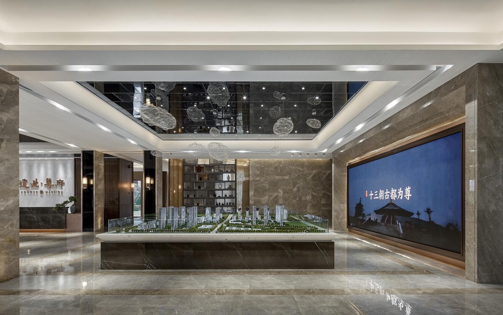 Jianye Zunfu Sales Center is located in Luoyang, an ancient capital of China steeped in historical significance. The city's rich heritage permeates its contemporary landscape, imbuing younger generations with a unique blend of classical sensibility and modern ambition. This rich cultural context directly inspired the sales office's innovative design. Jianye Zunfu Sales Center is located in Luoyang, an ancient capital of China steeped in historical significance. The city's rich heritage permeates its contemporary landscape, imbuing younger generations with a unique blend of classical sensibility and modern ambition. This rich cultural context directly inspired the sales office's innovative design. The entrance sets an immediate tone of reverence, with a carefully crafted signboard and a welcoming pine that create a ceremonial approach. Inside the lobby, abstract mountain shapes and intricate screen patterns symbolize progress and reunion. The corporate culture and project display area communicate Jianye Group's vision and future aspirations. In the negotiation spaces, delicate peony motifs and sculptures pay homage to Luoyang's renowned status as the City of Peonies. The deep negotiation area is particularly compelling, featuring water elements, bamboo landscapes, and sculptural installations that cultivate a tranquil atmosphere designed to inspire client investment. Natural materials—stone, wood, metal, fabric, rattan, and genuine leather—are thoughtfully integrated with modern technological elements, creating refined spaces that beautifully demonstrate the perfect fusion of nature and contemporary design. Specialized areas like the book bar and tea culture area deepen this interaction, combining organic elements with traditional cultural aesthetics to craft inviting environments rich with cultural resonance.