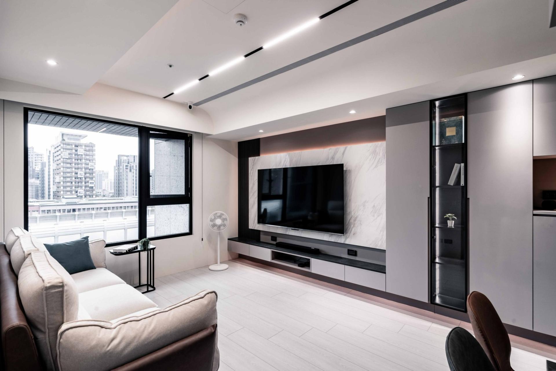 Meanwhile, the TV wall incorporates a distinctive curved ceiling design that seamlessly integrates with the existing beams, adding a sense of flow and depth to the space.