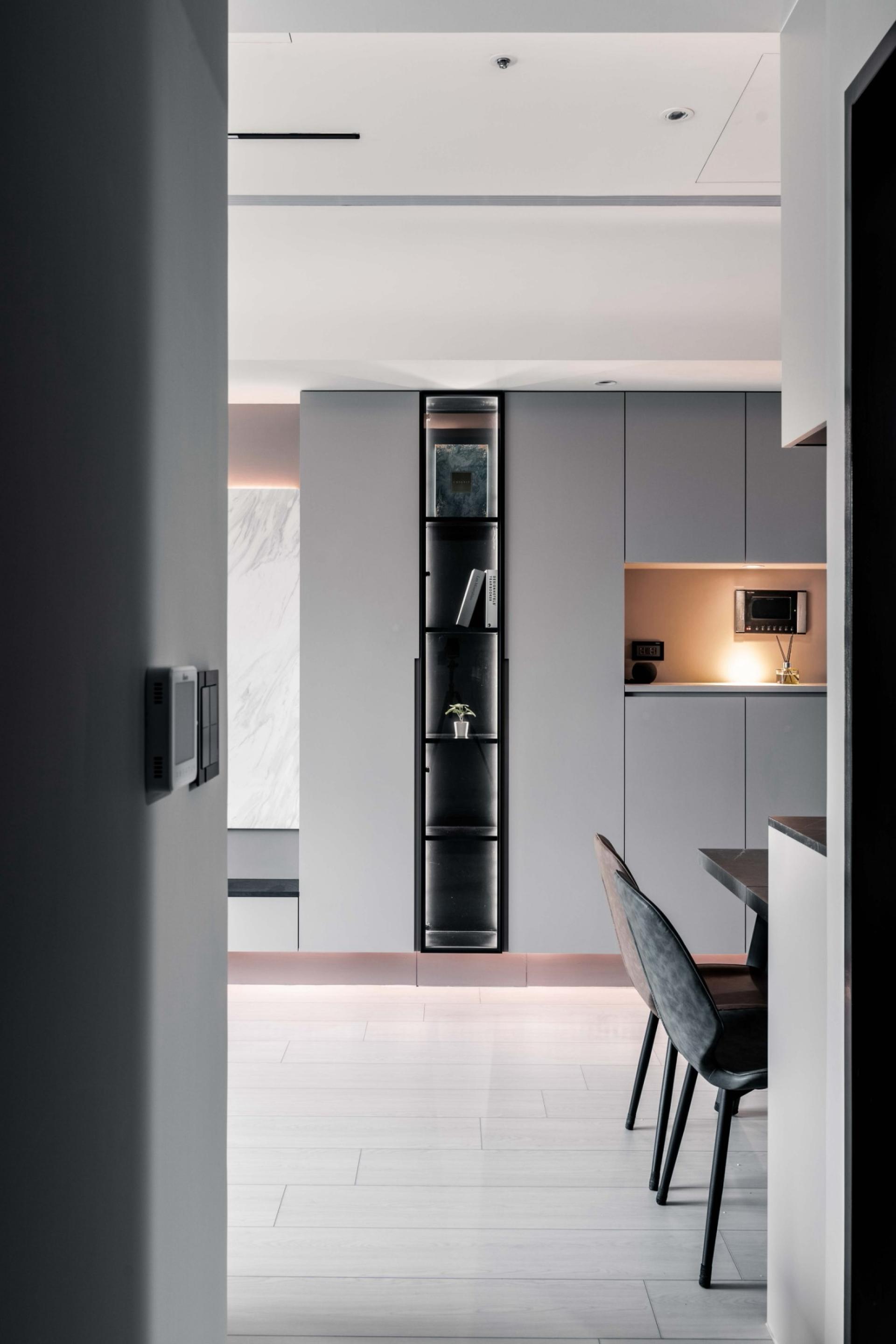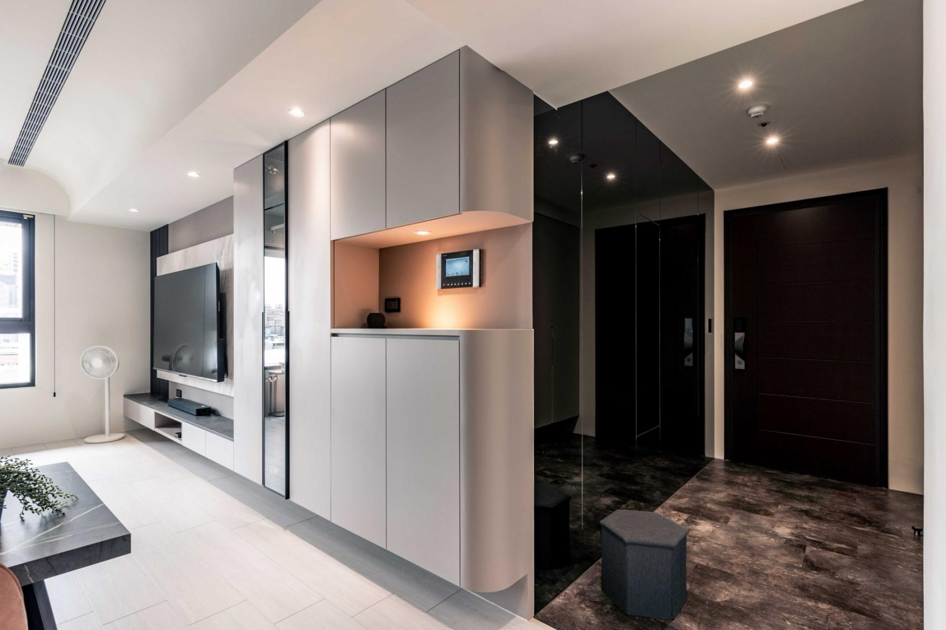 Upon entering, the use of gray mirrors expands the perceived space and unifies the overall color scheme. The cabinetry interior is finished in a deep black tone, complementing the exterior’s primary palette and reinforcing the overall design style.