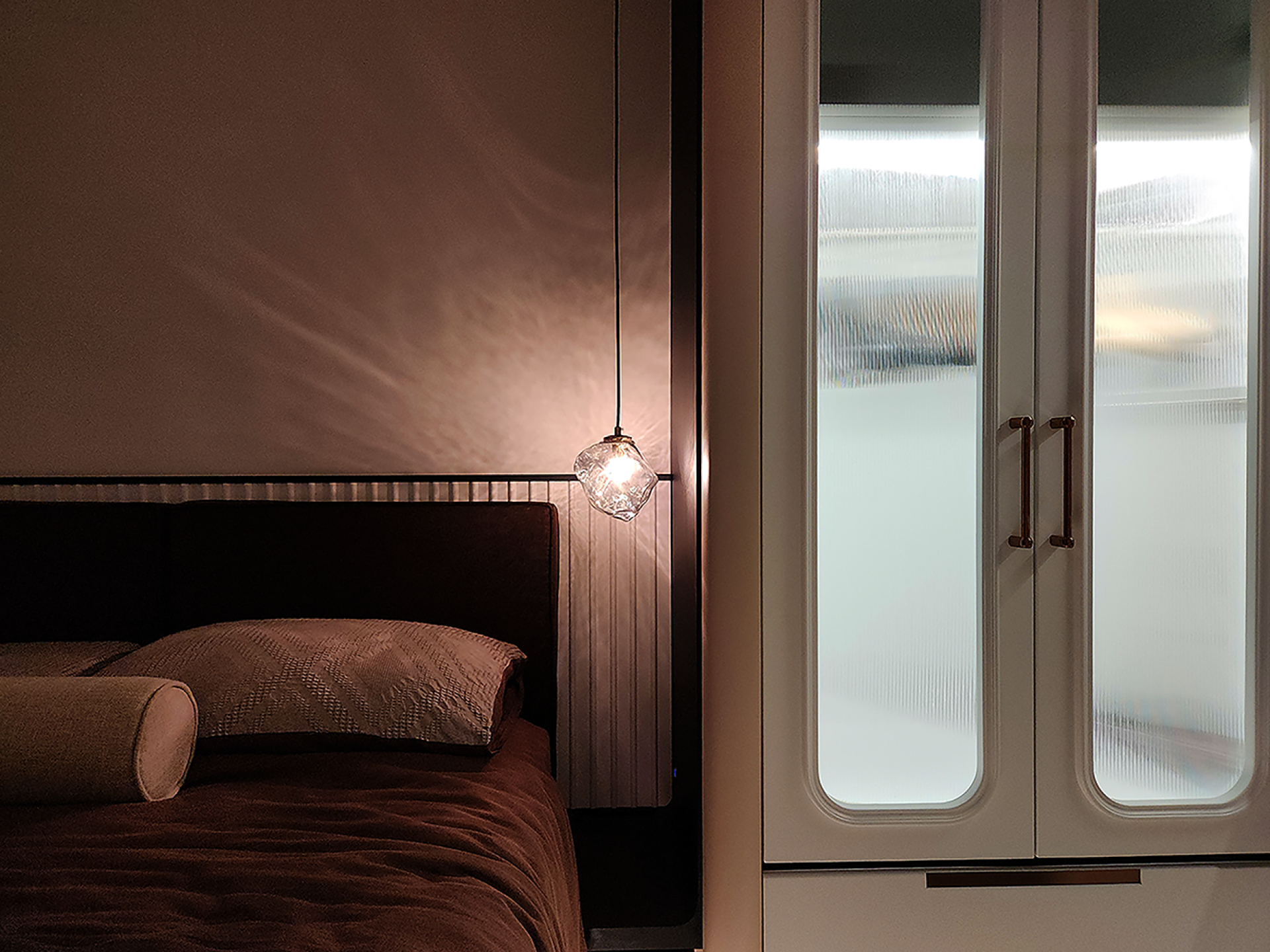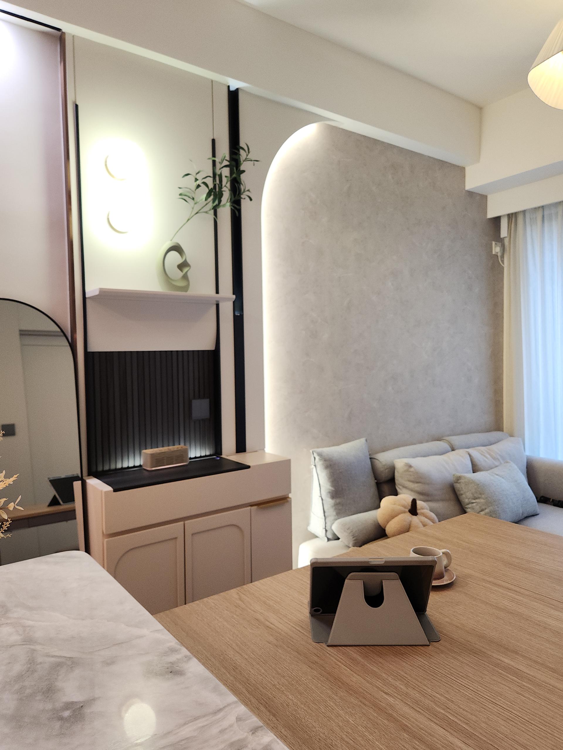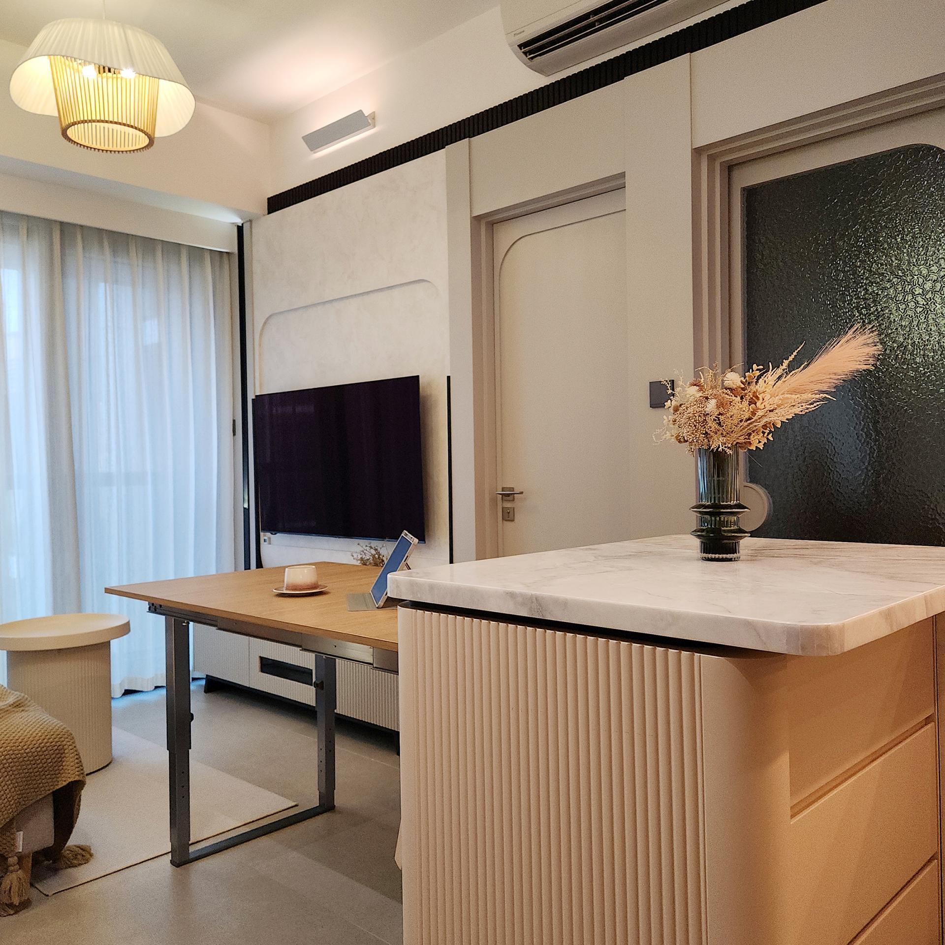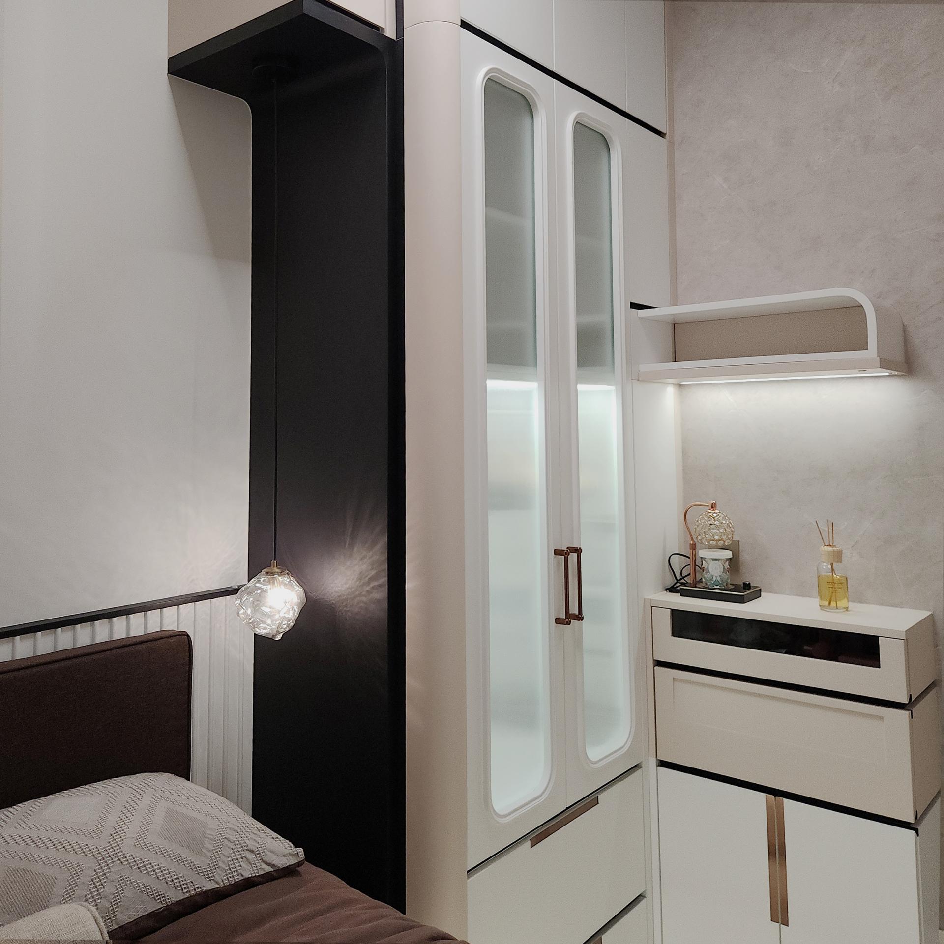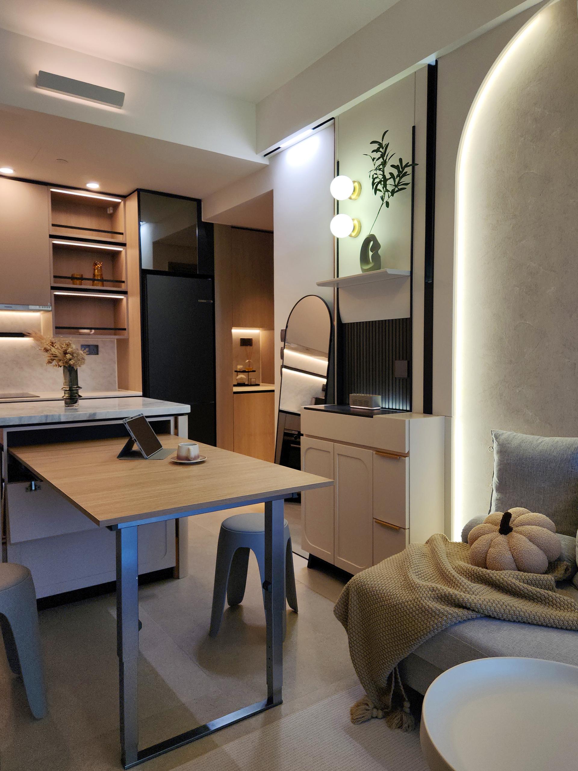 The study room's strategic conversion to a glass sliding system invites daylight to permeate the living area while amplifying its spatial perception through visual continuity. And the open kitchen features a central island that extends into a foldable dining table, accommodating dining needs for 4-6 people.The master bedroom design features glass cabinet doors with integrated ambient lighting inside the wardrobe, paired with minimalist decorative trim and sleek metallic handles to evoke a luxurious and sophisticated atmosphere.And the study room design with linen-striped wallpaper paired with wall-mounted lamps creates a soft and tranquil reading nook for evenings, while subtly incorporating the homeowner's passion for cycling into the design elements. Additionally, the compact room offers flexibility to later serve as either a guest bedroom or a children's room.